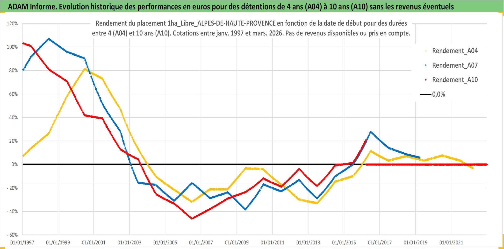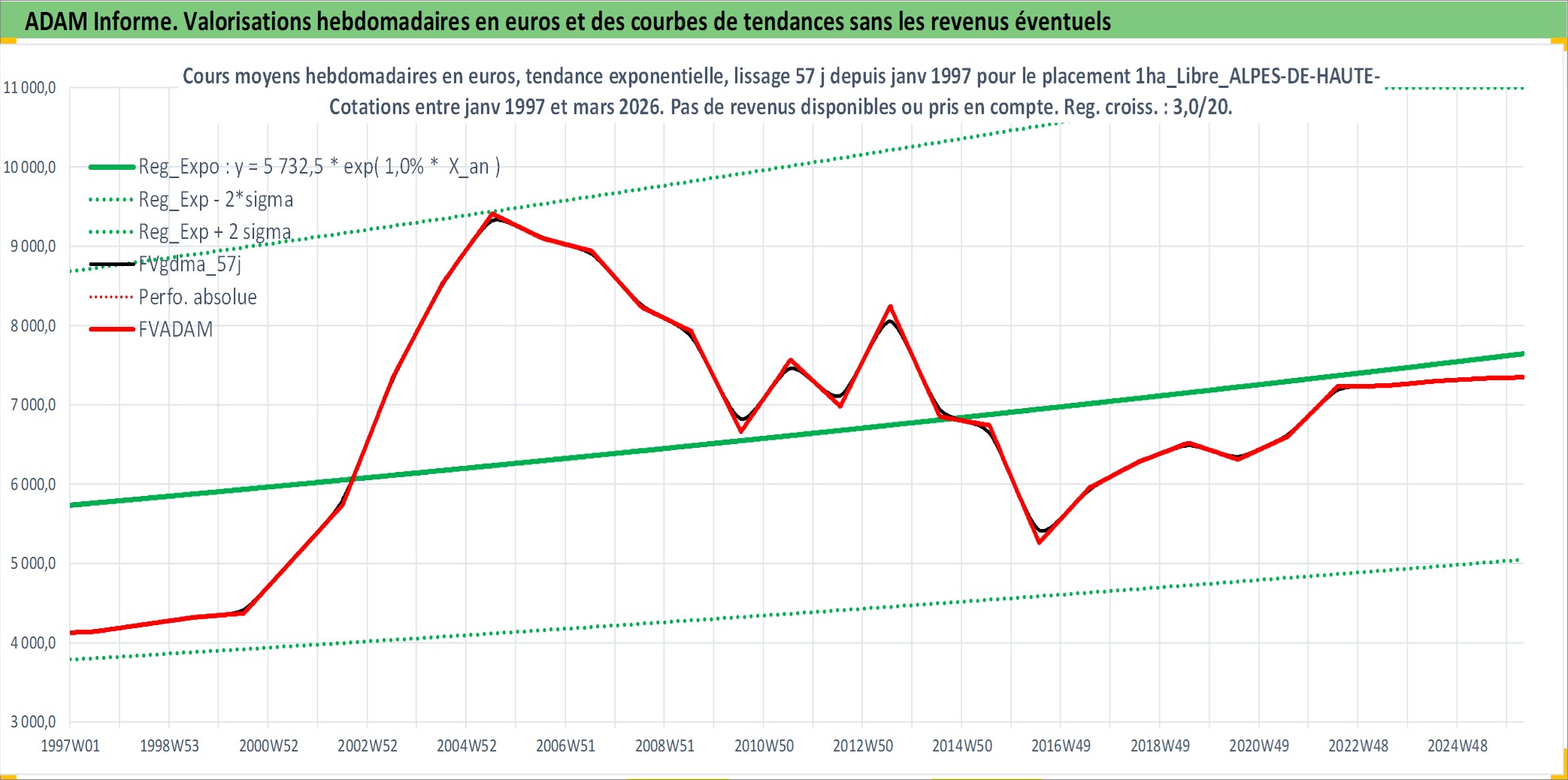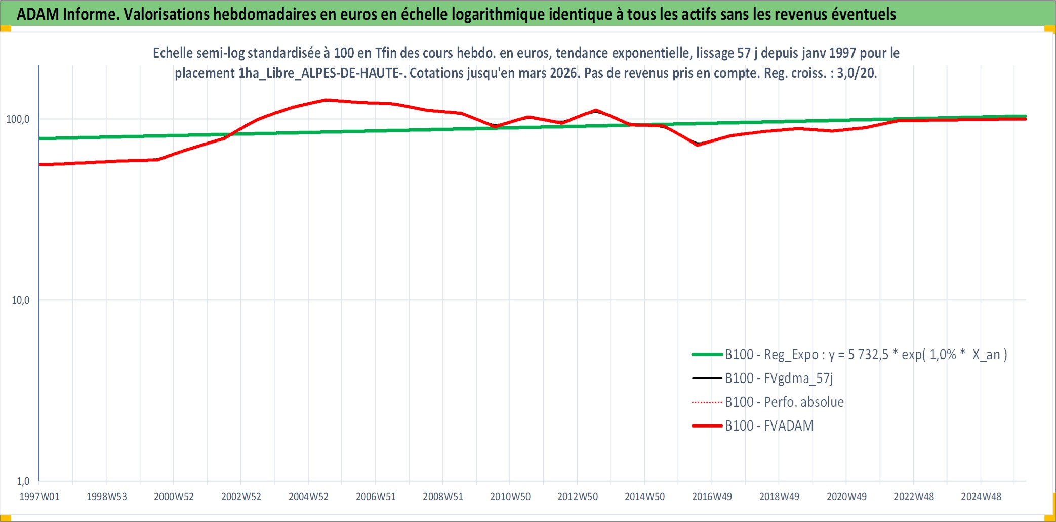 Site dédié aux investisseursPage dédiée sur site financeAnalyse des valorisations hebdomadaires de l'actif 1ha_Libre_ALPES-DE-HAUTE-PROVENCE. Cet actif est cote en EUR. Les valorisations couvrent les semaines 1997W01 a 2026W13. Les fermages de ce bien foncier sont pris egaux a 2,5% annuels de la valeur venale du bien.