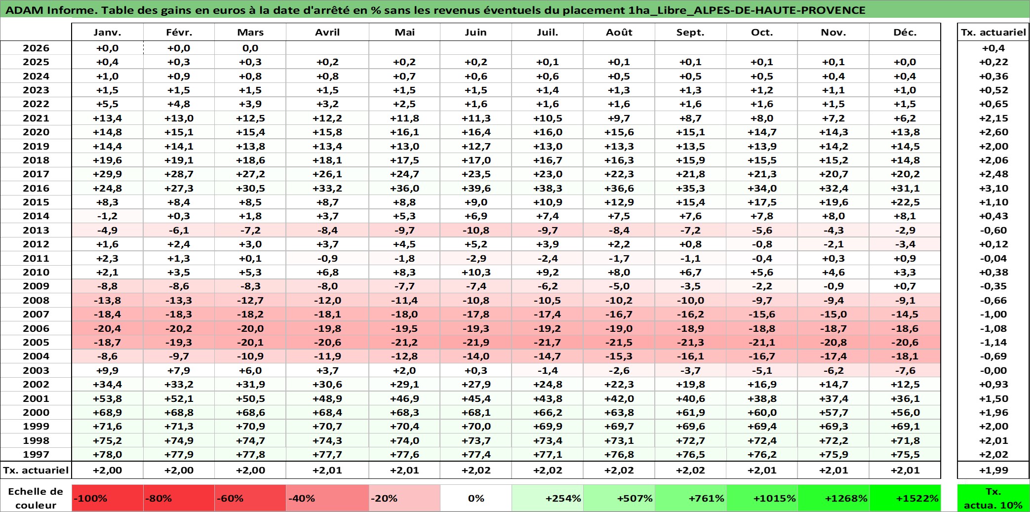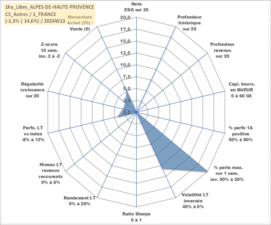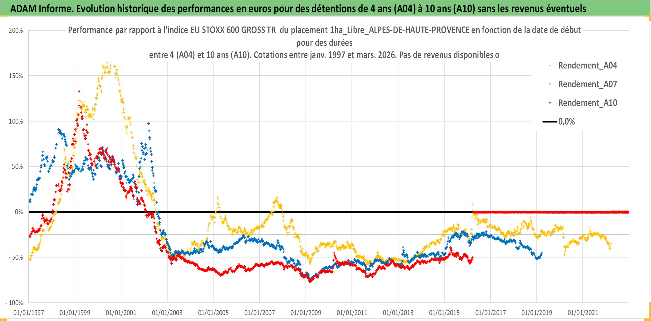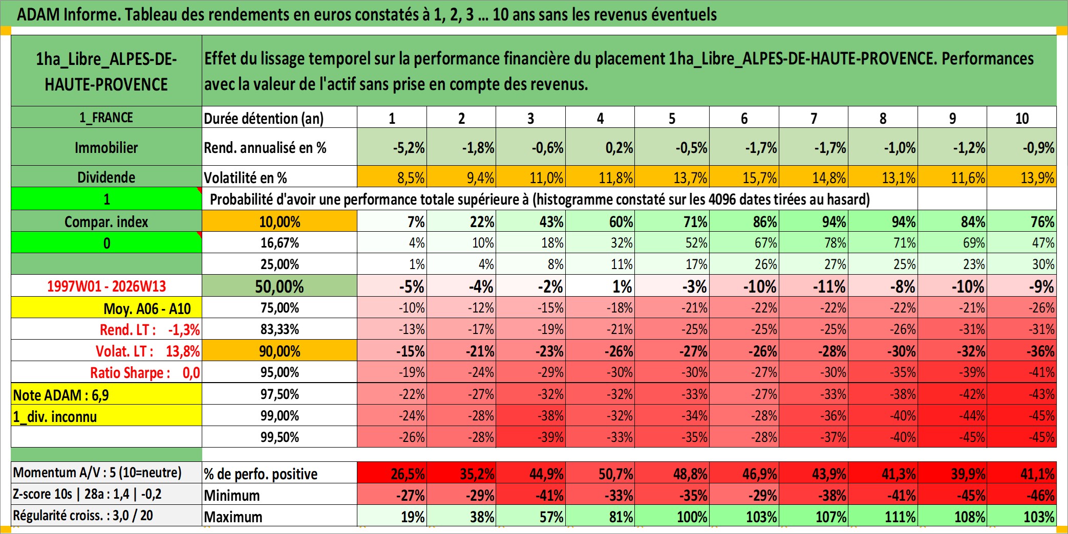 Site dédié aux investisseursPage dédiée sur site financeAnalyse des valorisations hebdomadaires de l'actif 1ha_Libre_ALPES-DE-HAUTE-PROVENCE. Cet actif est cote en EUR. Les valorisations couvrent les semaines 1997W01 a 2026W13. Les fermages de ce bien foncier sont pris egaux a 2,5% annuels de la valeur venale du bien.