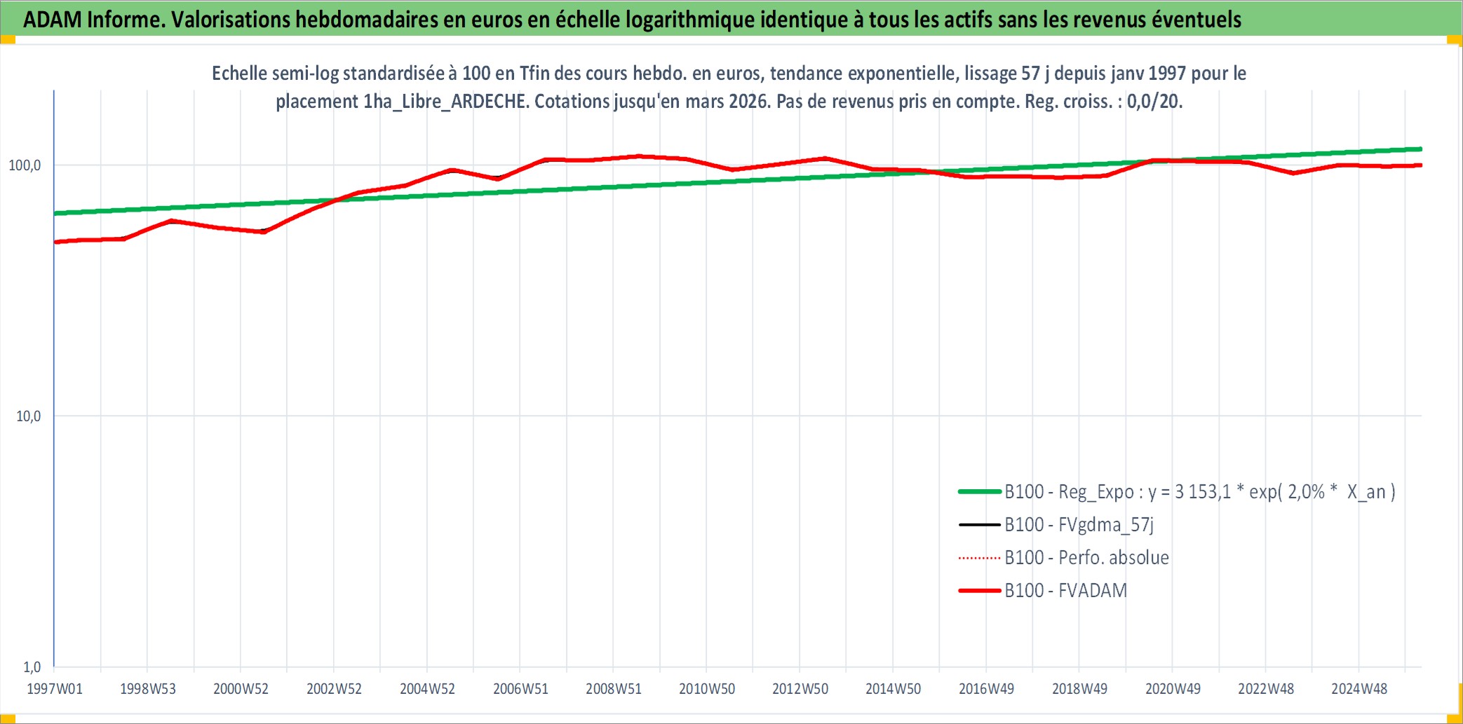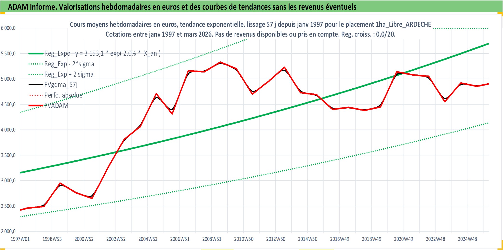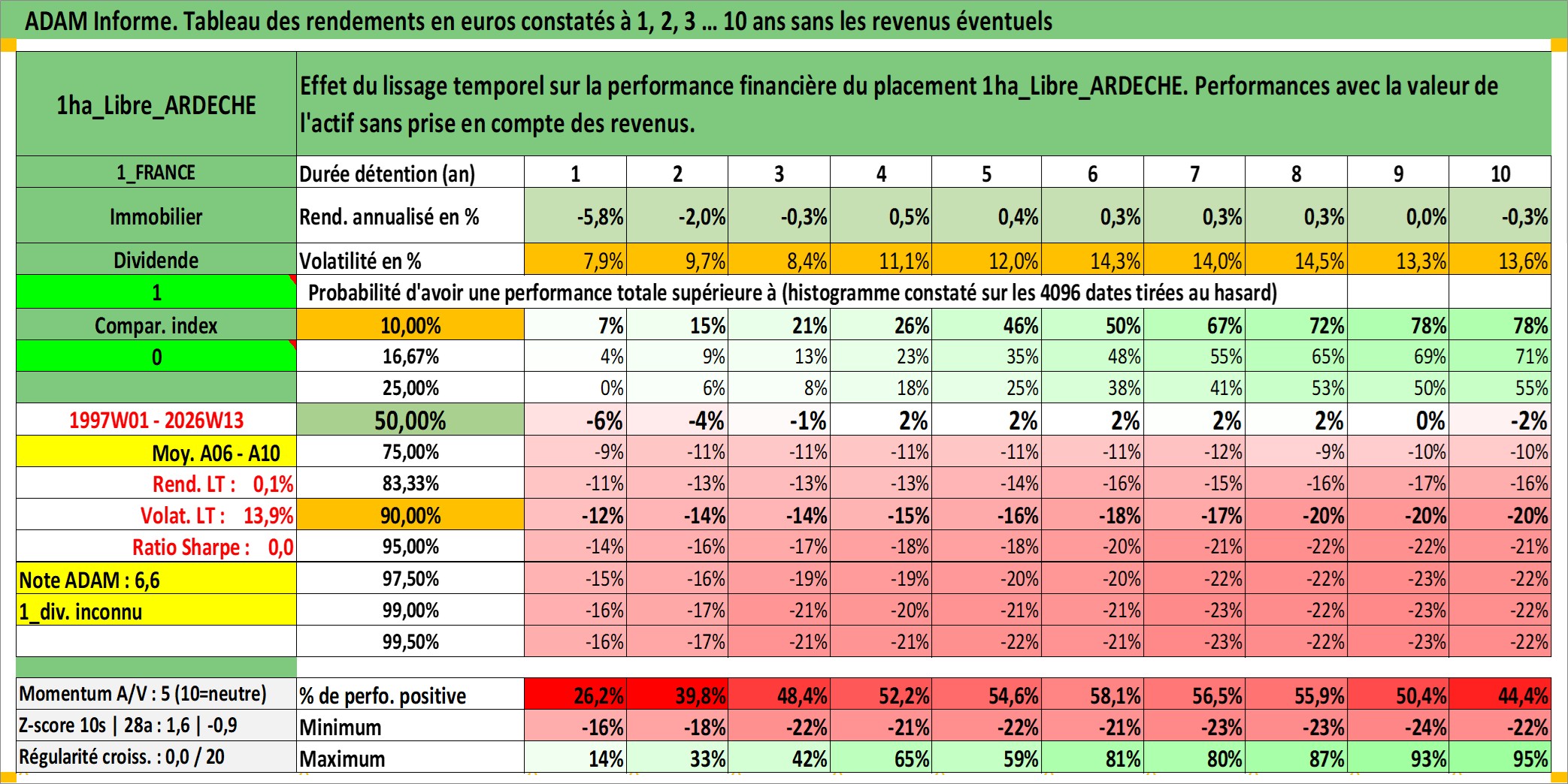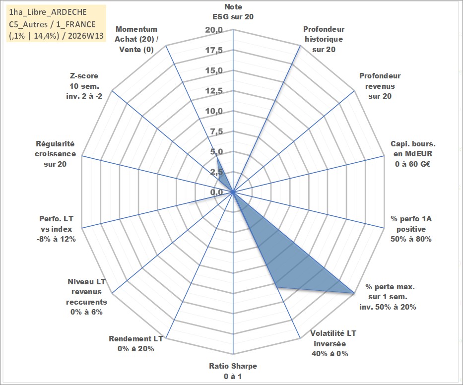 Site dédié aux investisseursPage dédiée sur site financeAnalyse des valorisations hebdomadaires de l'actif 1ha_Libre_ARDECHE. Cet actif est cote en EUR. Les valorisations couvrent les semaines 1997W01 a 2026W13. Les fermages de ce bien foncier sont pris egaux a 2,5% annuels de la valeur venale du bien.