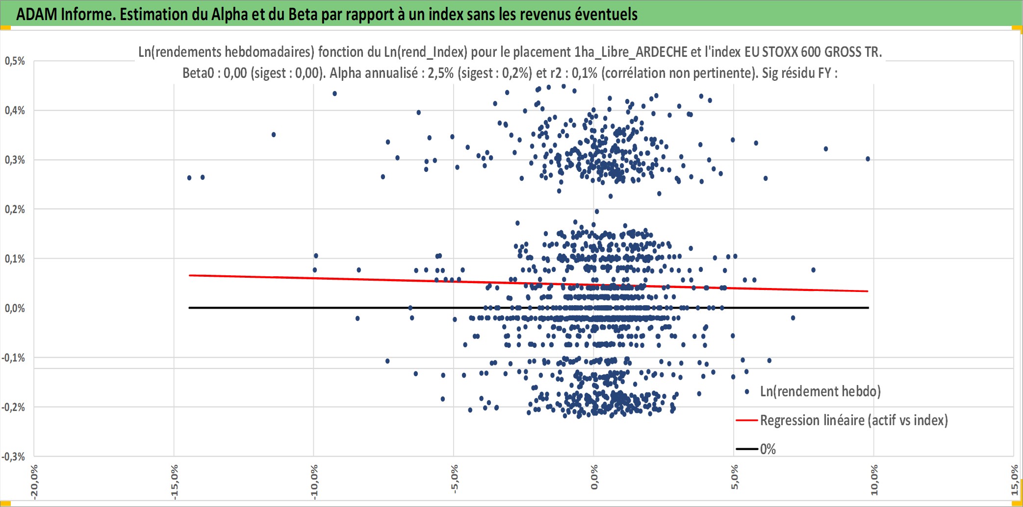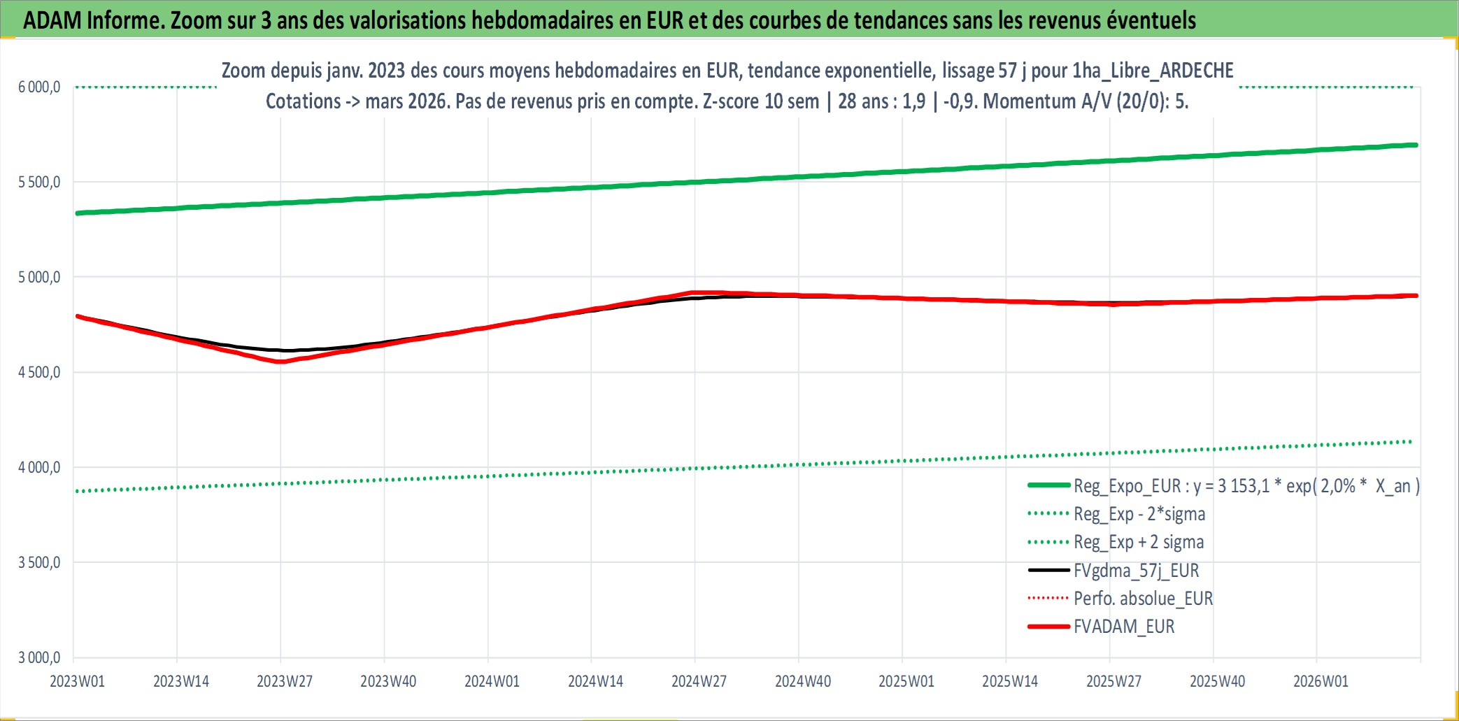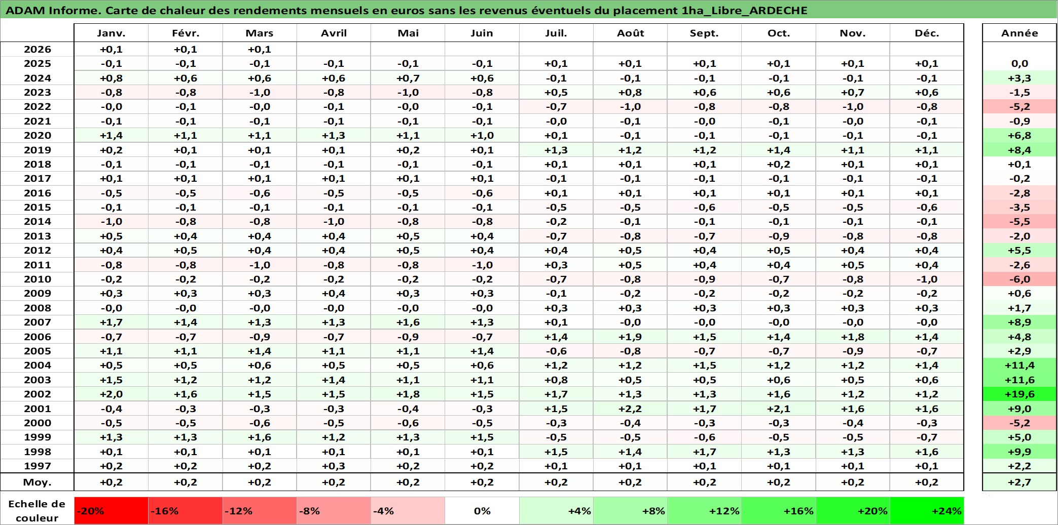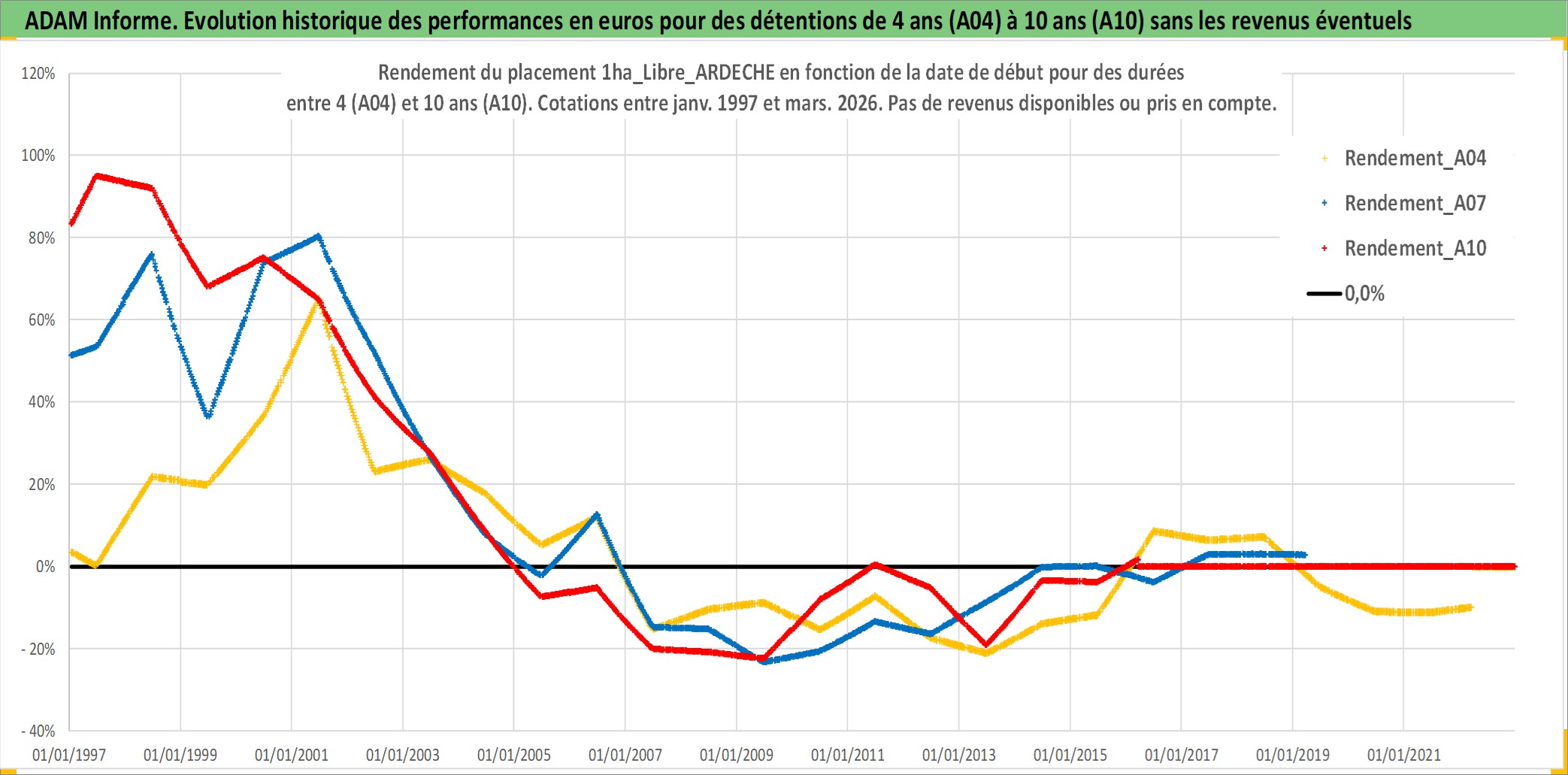 Site dédié aux investisseursPage dédiée sur site financeAnalyse des valorisations hebdomadaires de l'actif 1ha_Libre_ARDECHE. Cet actif est cote en EUR. Les valorisations couvrent les semaines 1997W01 a 2026W13. Les fermages de ce bien foncier sont pris egaux a 2,5% annuels de la valeur venale du bien.