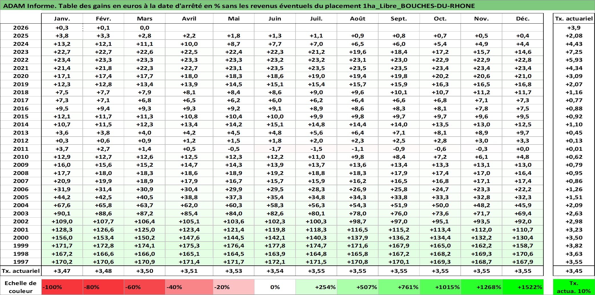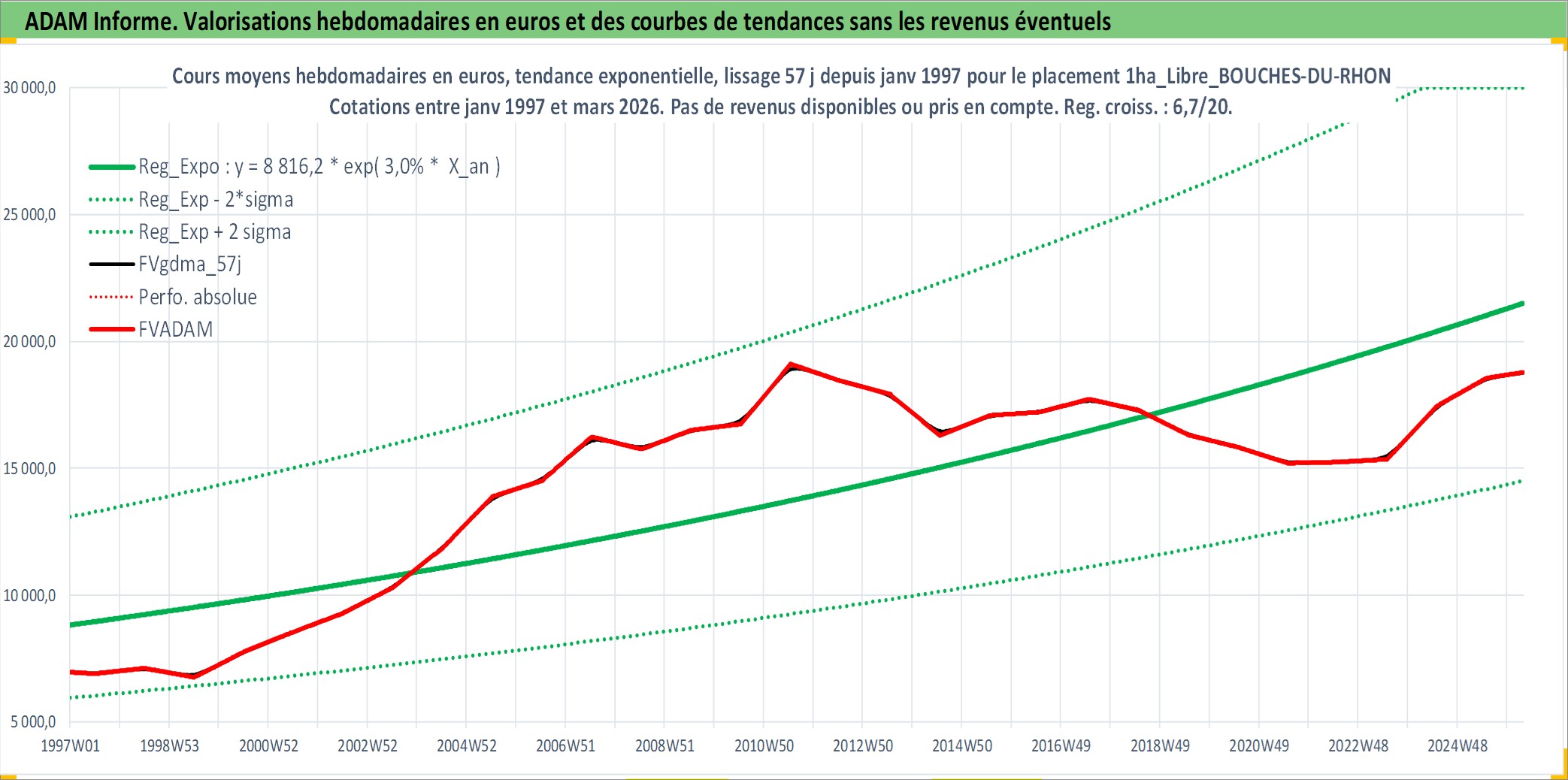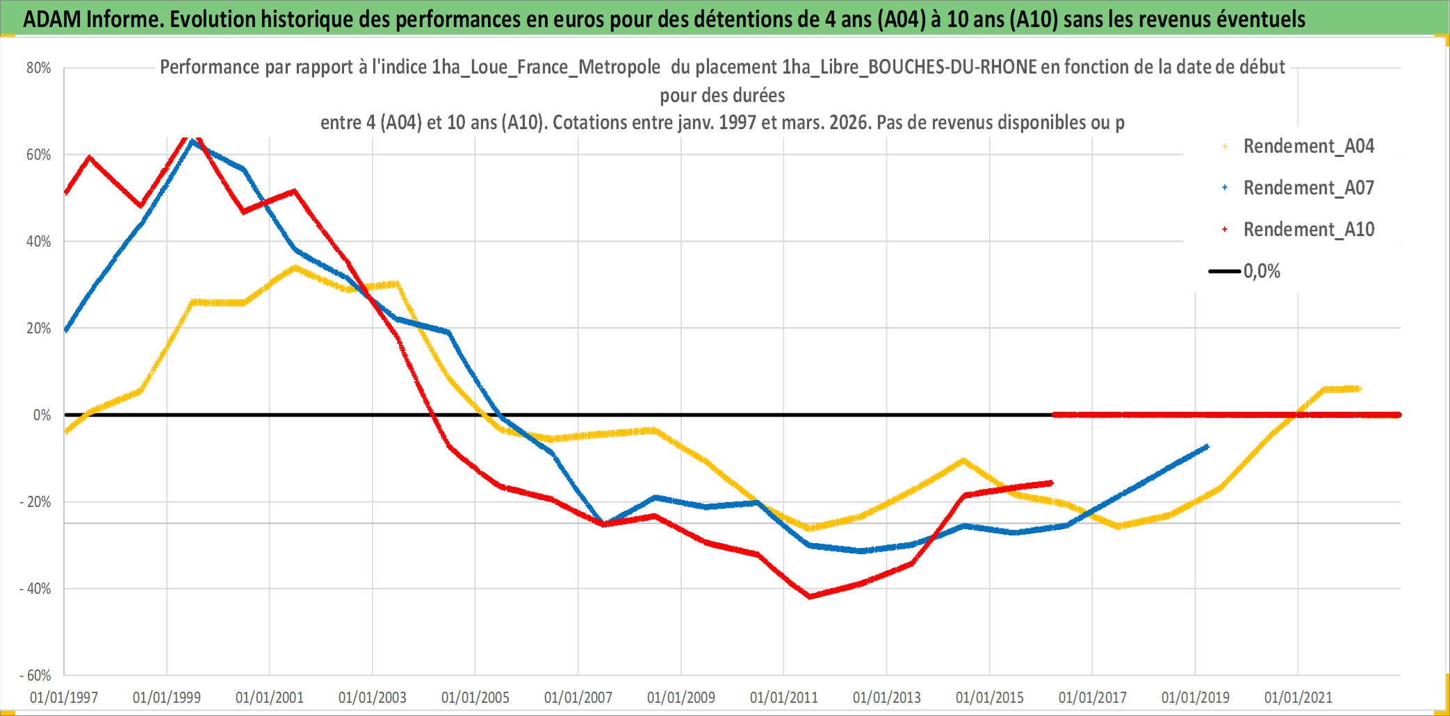 Site dédié aux investisseursPage dédiée sur site financeAnalyse des valorisations hebdomadaires de l'actif 1ha_Libre_BOUCHES-DU-RHONE. Cet actif est cote en EUR. Les valorisations couvrent les semaines 1997W01 a 2026W13. Les fermages de ce bien foncier sont pris egaux a 2,5% annuels de la valeur venale du bien.