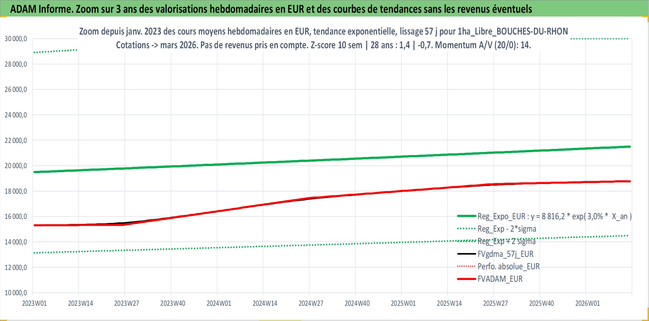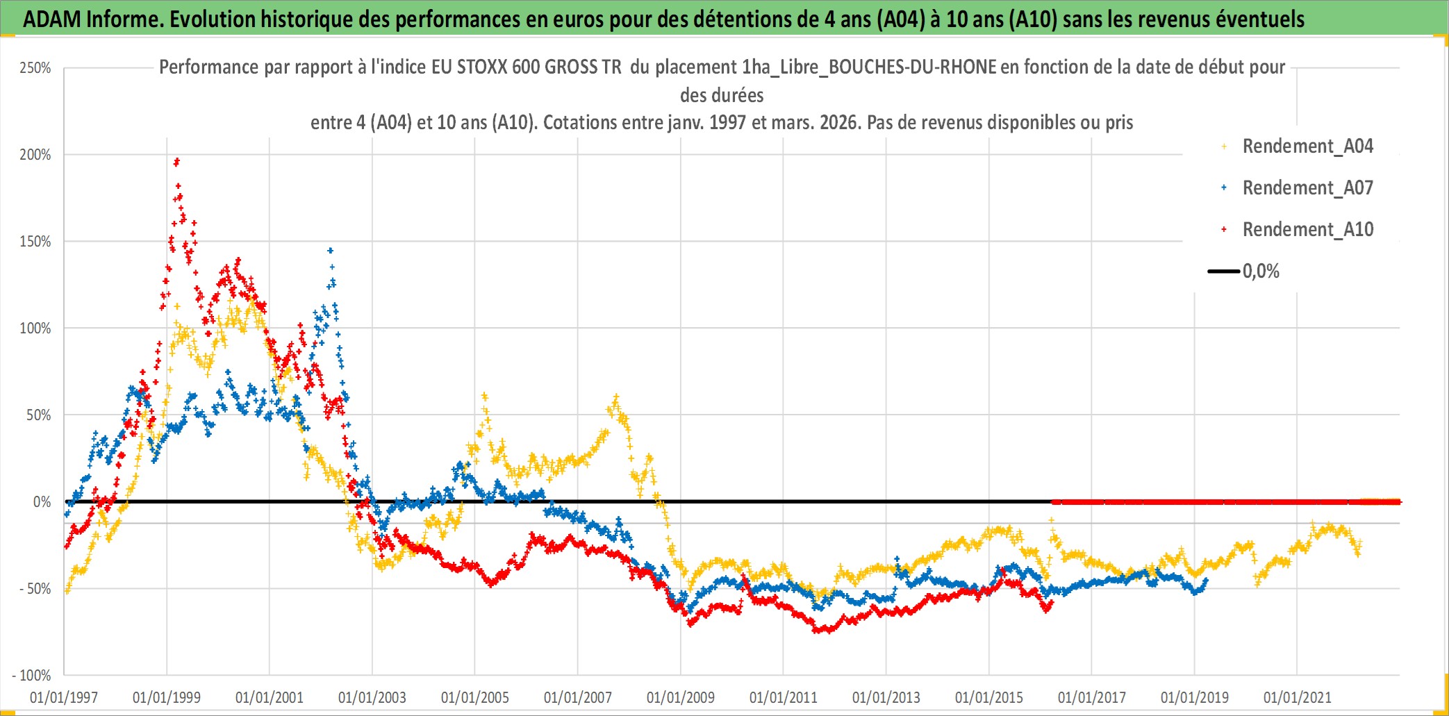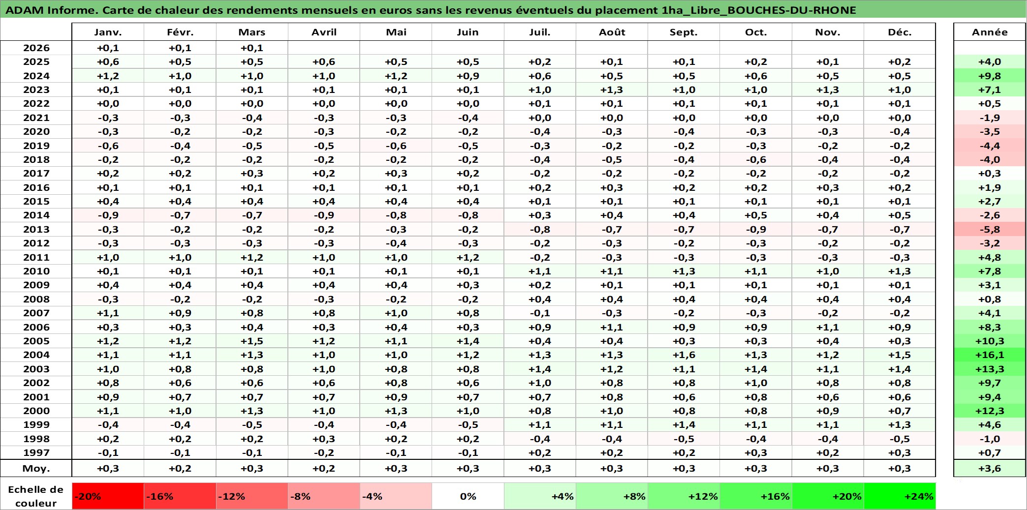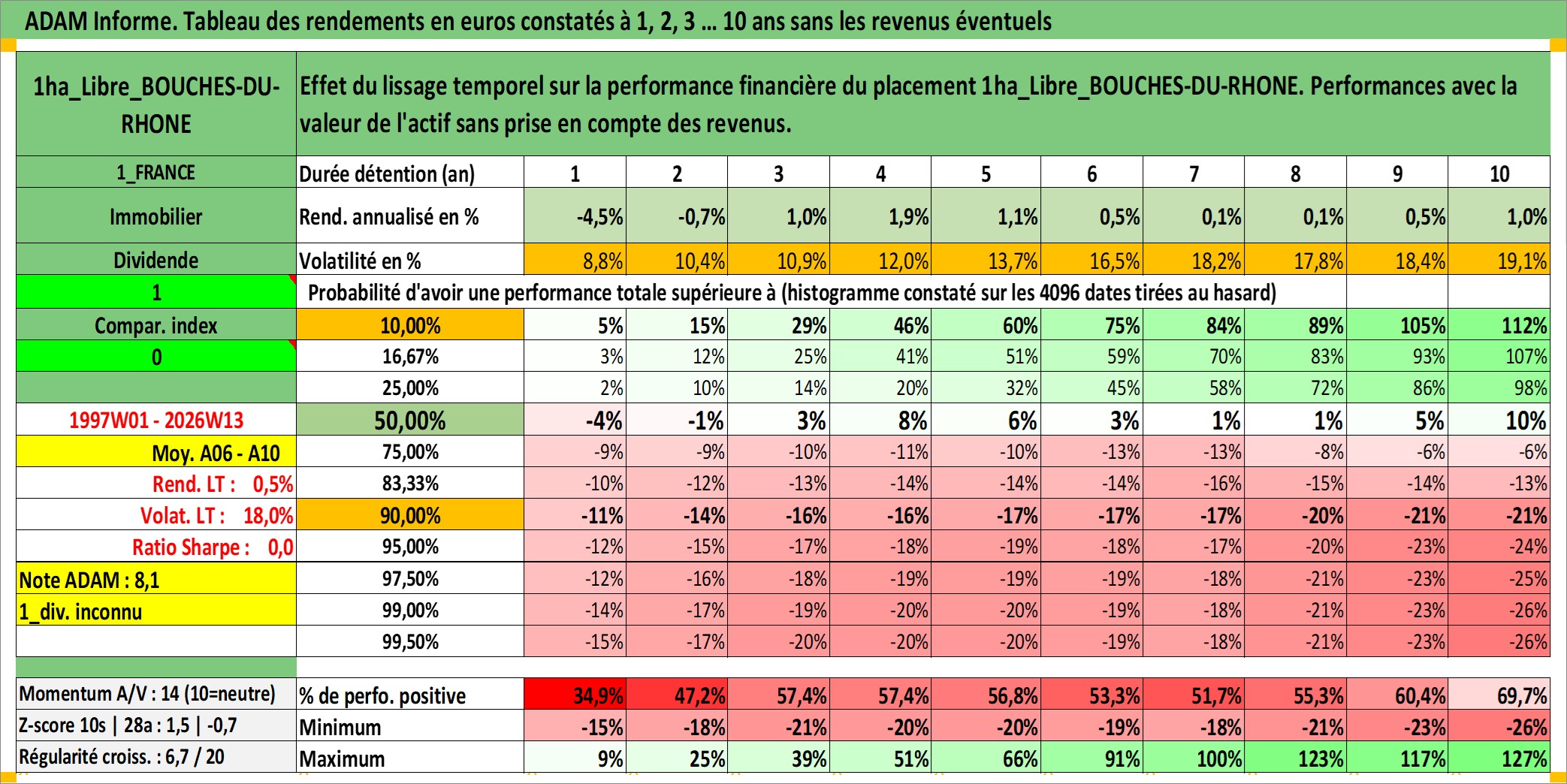Site dédié aux investisseursPage dédiée sur site financeAnalyse des valorisations hebdomadaires de l'actif 1ha_Libre_BOUCHES-DU-RHONE. Cet actif est cote en EUR. Les valorisations couvrent les semaines 1997W01 a 2026W13. Les fermages de ce bien foncier sont pris egaux a 2,5% annuels de la valeur venale du bien.
