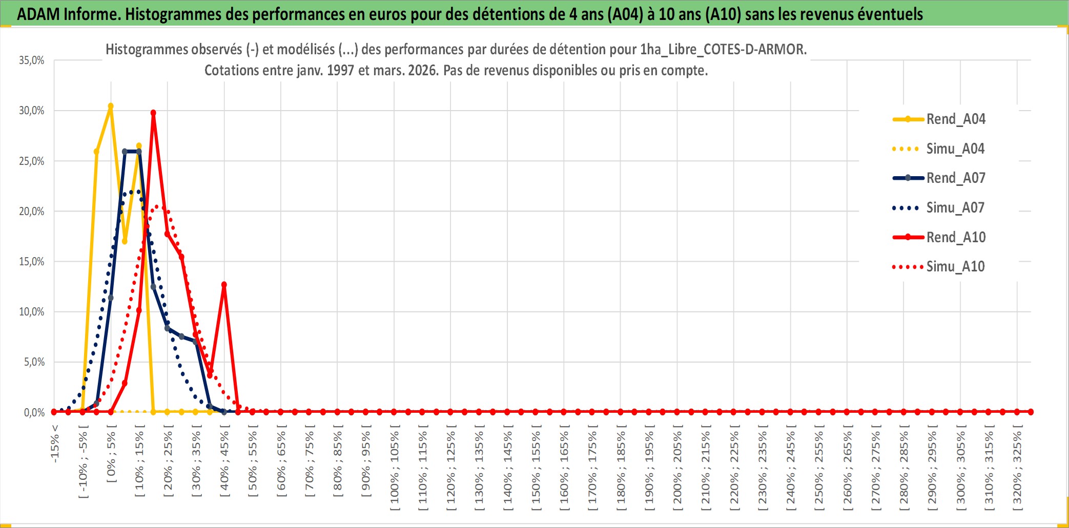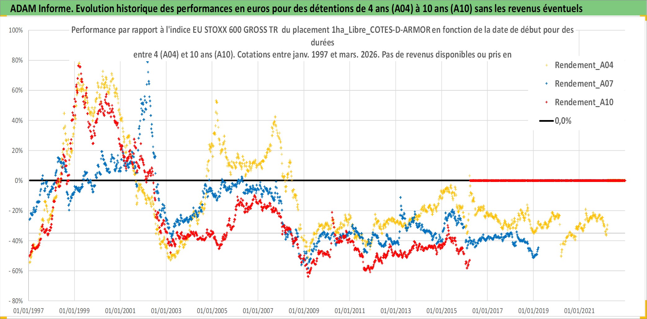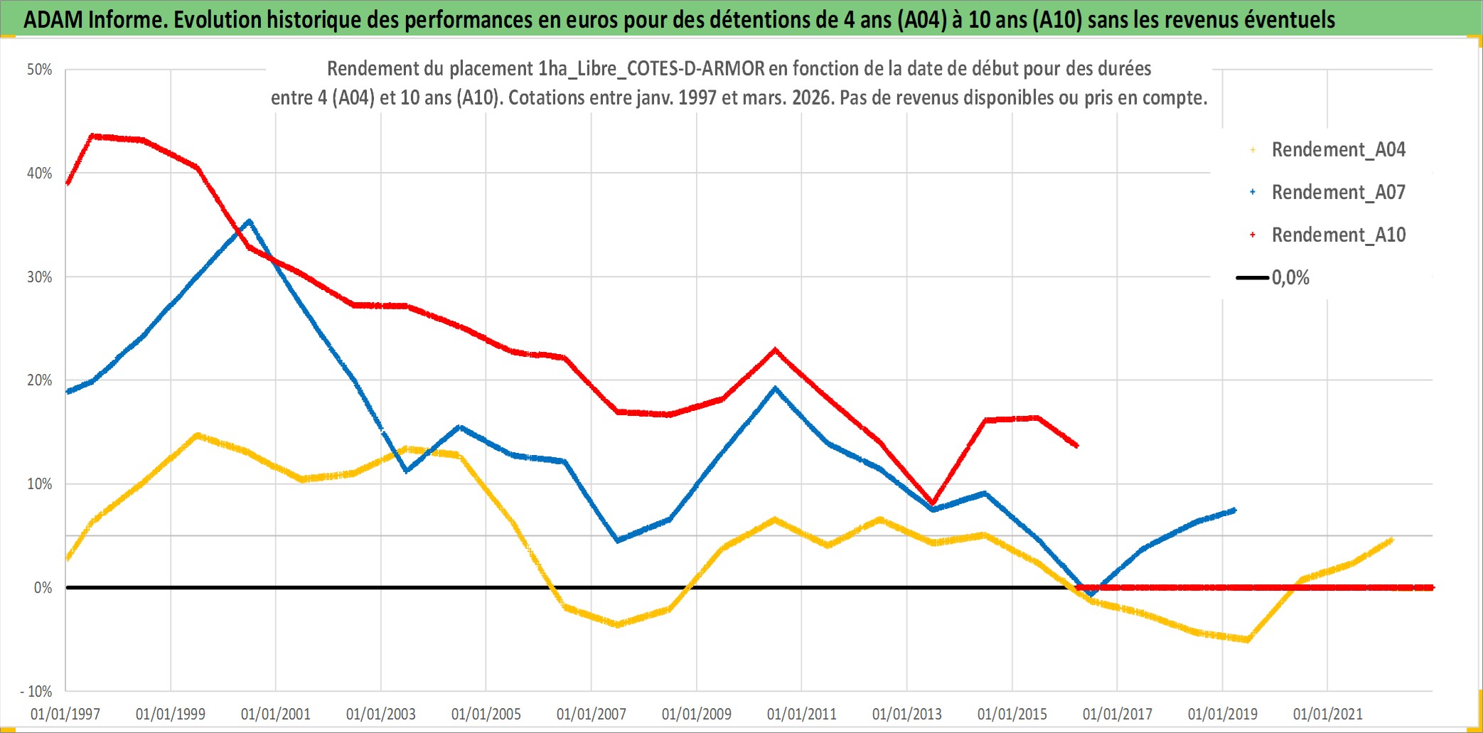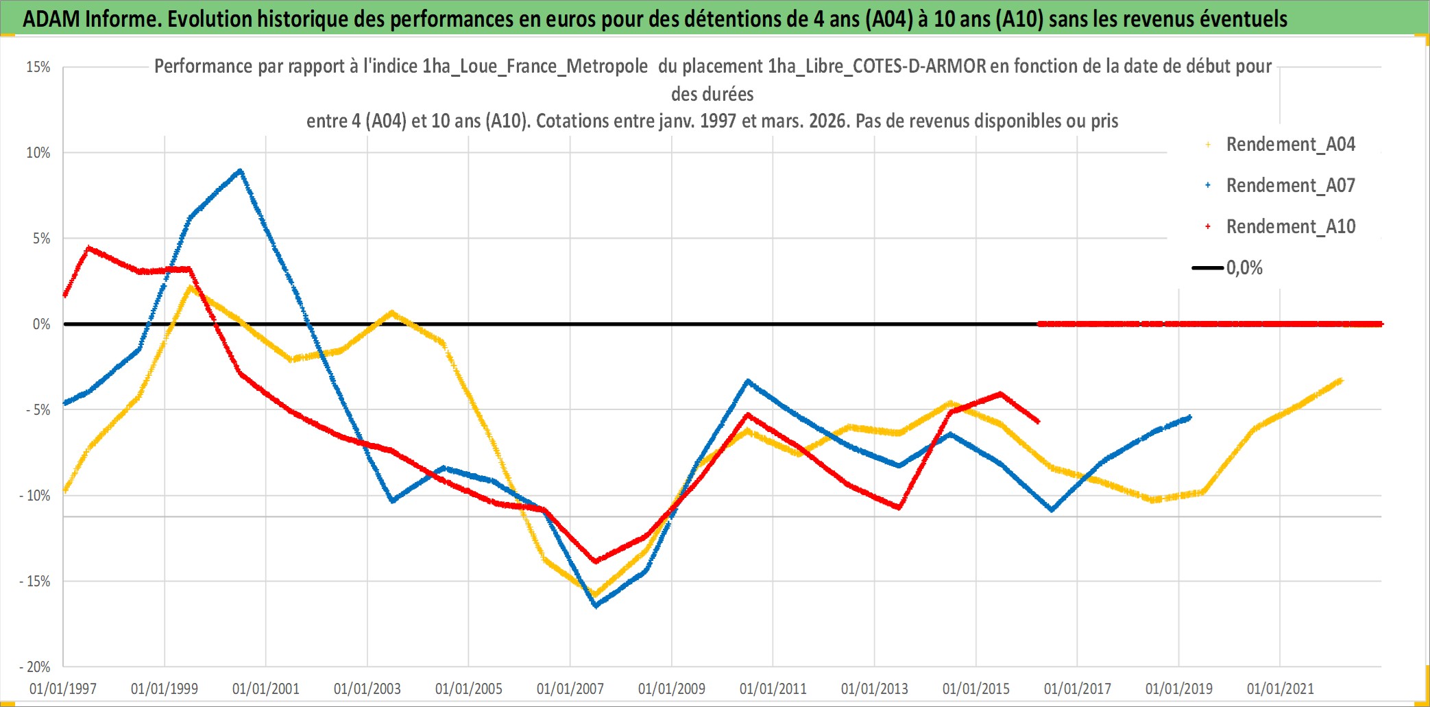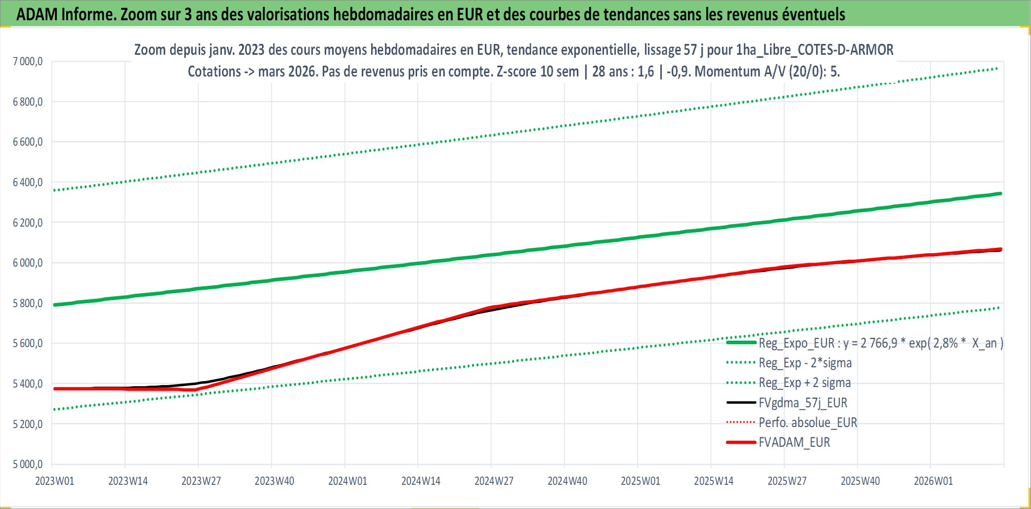 Site dédié aux investisseursPage dédiée sur site financeAnalyse des valorisations hebdomadaires de l'actif 1ha_Libre_COTES-D-ARMOR. Cet actif est cote en EUR. Les valorisations couvrent les semaines 1997W01 a 2026W13. Les fermages de ce bien foncier sont pris egaux a 2,5% annuels de la valeur venale du bien.