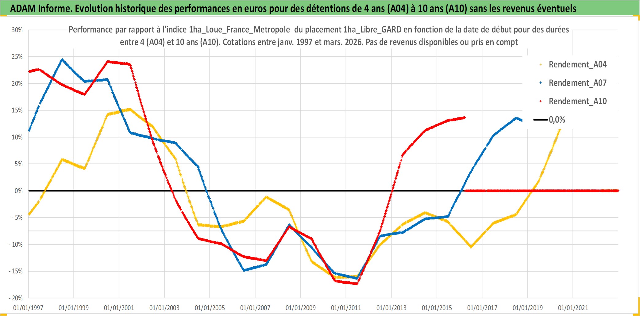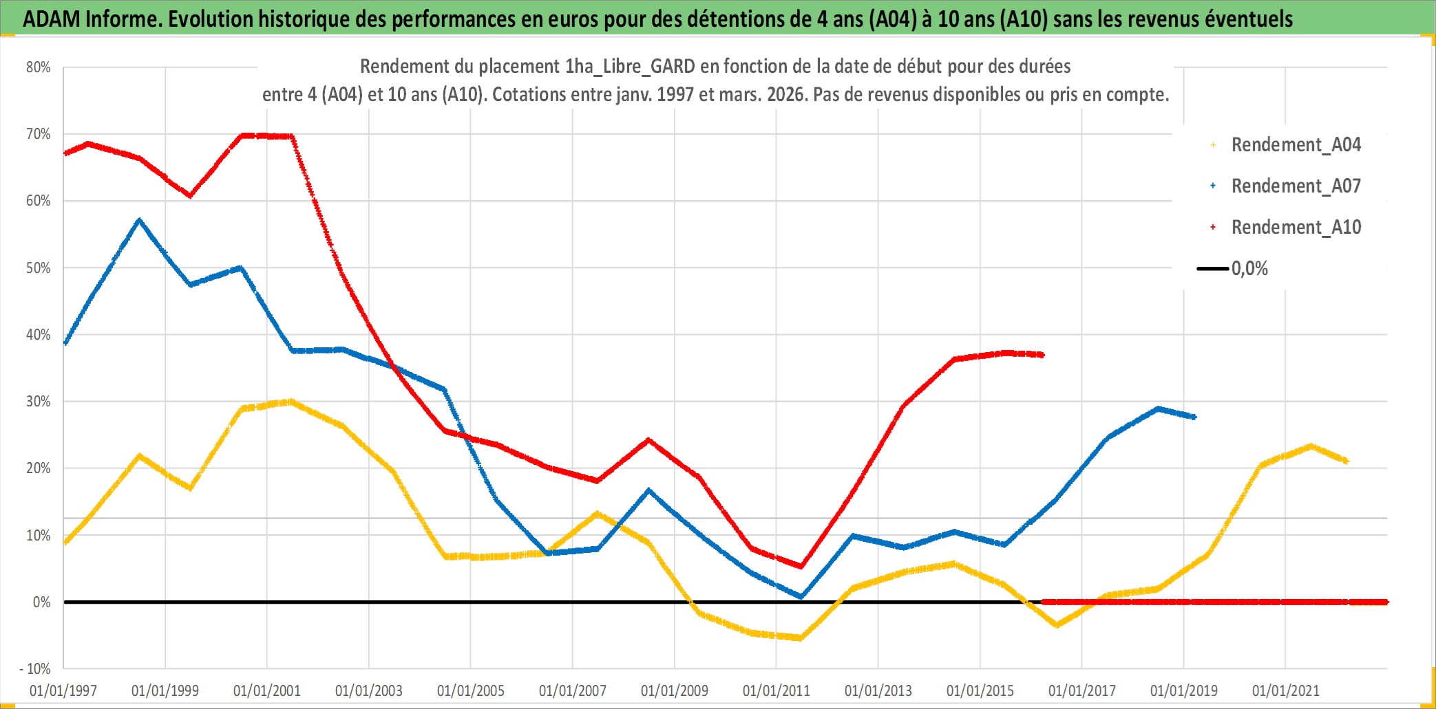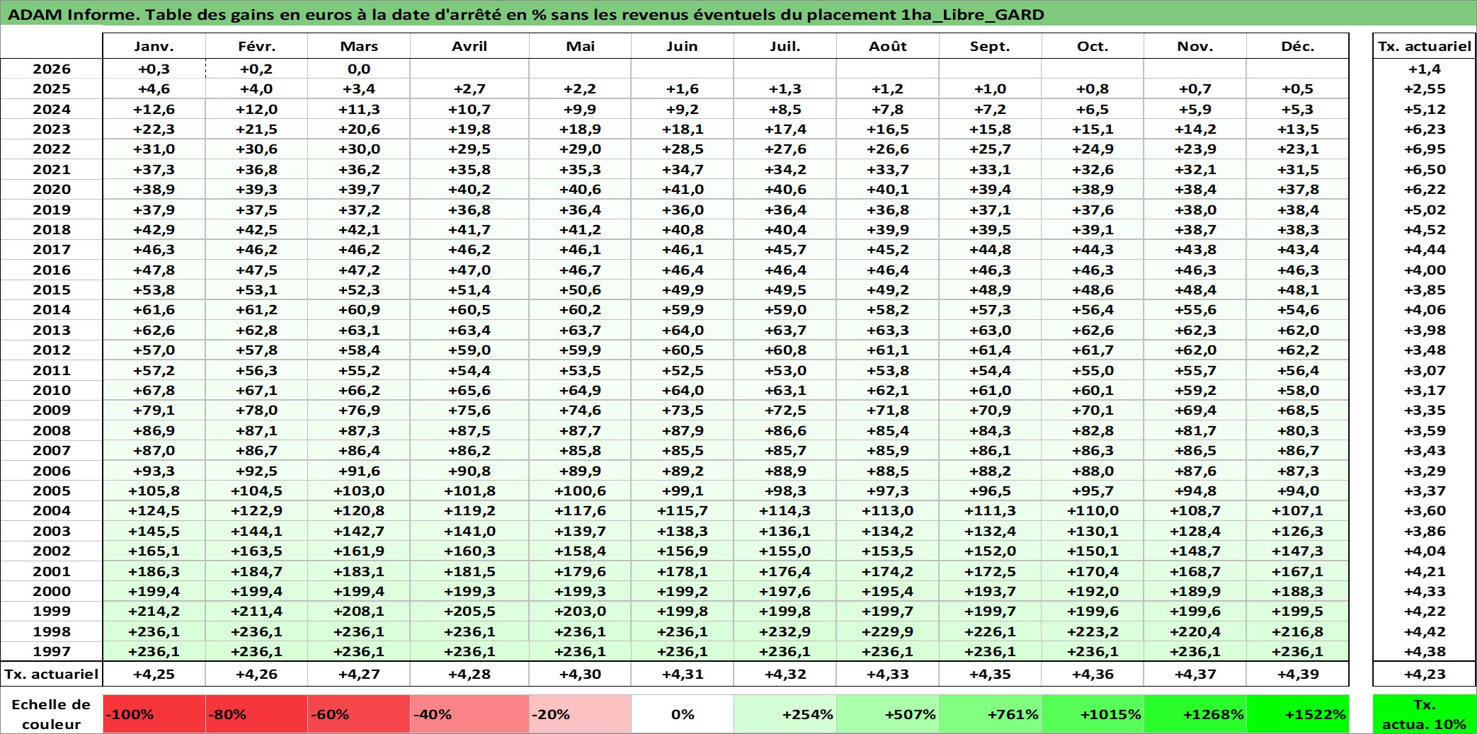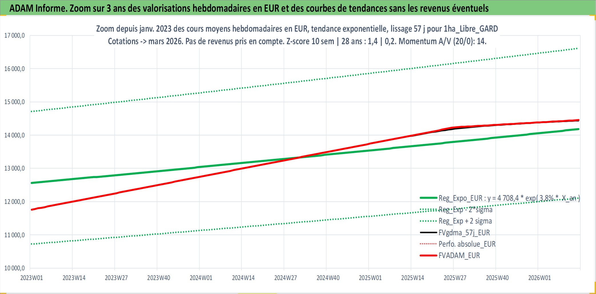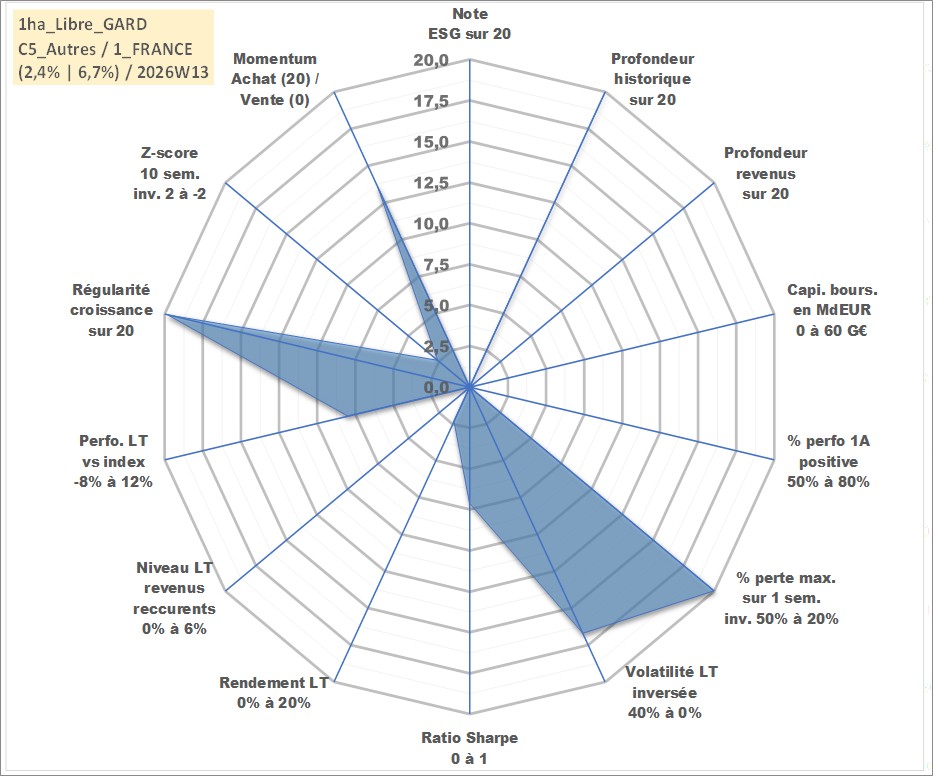 Site dédié aux investisseursPage dédiée sur site financeAnalyse des valorisations hebdomadaires de l'actif 1ha_Libre_GARD. Cet actif est cote en EUR. Les valorisations couvrent les semaines 1997W01 a 2026W13. Les fermages de ce bien foncier sont pris egaux a 2,5% annuels de la valeur venale du bien.