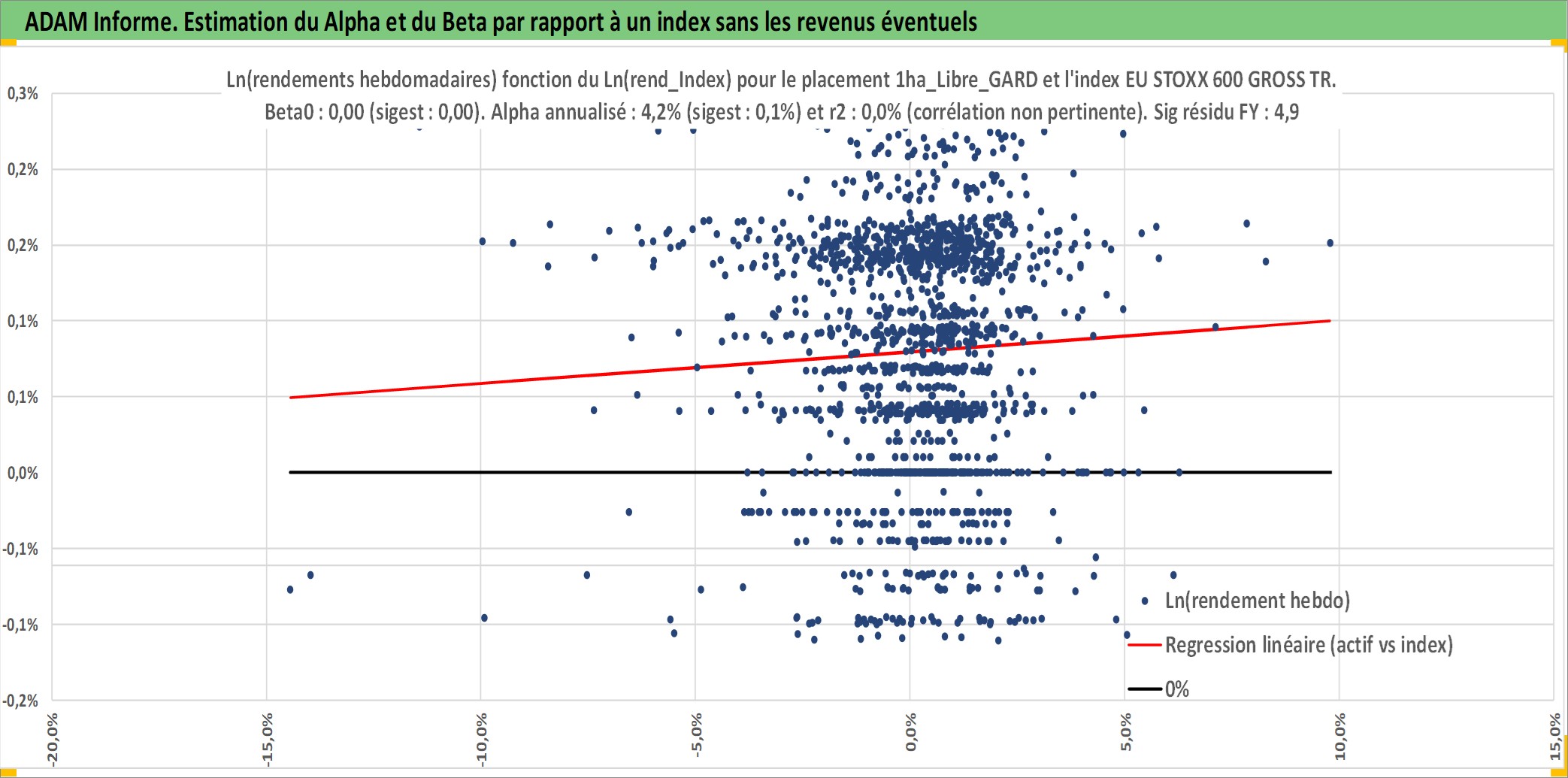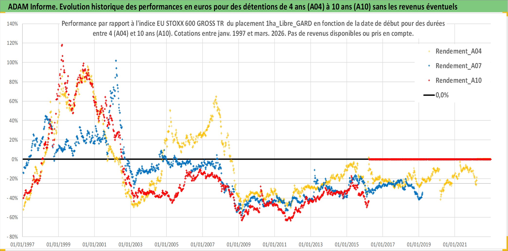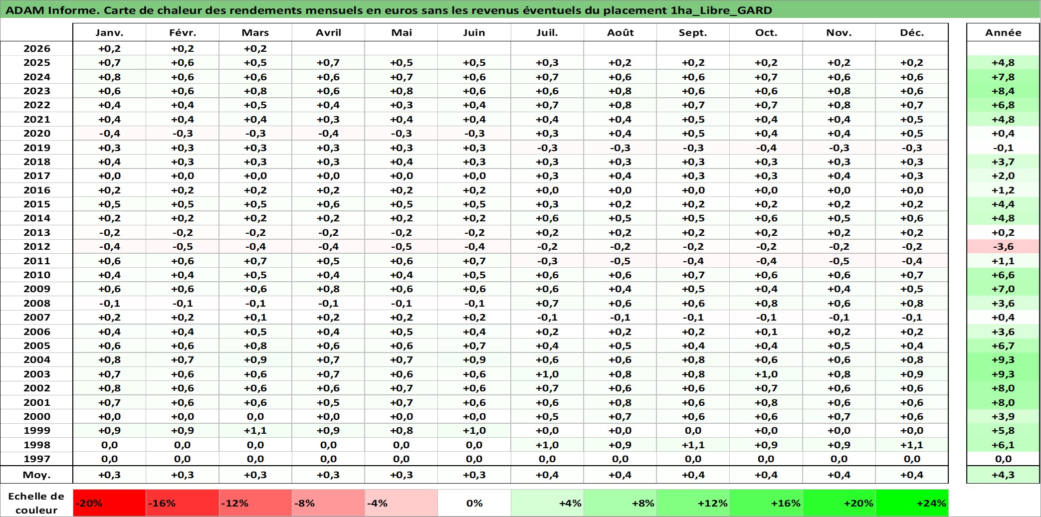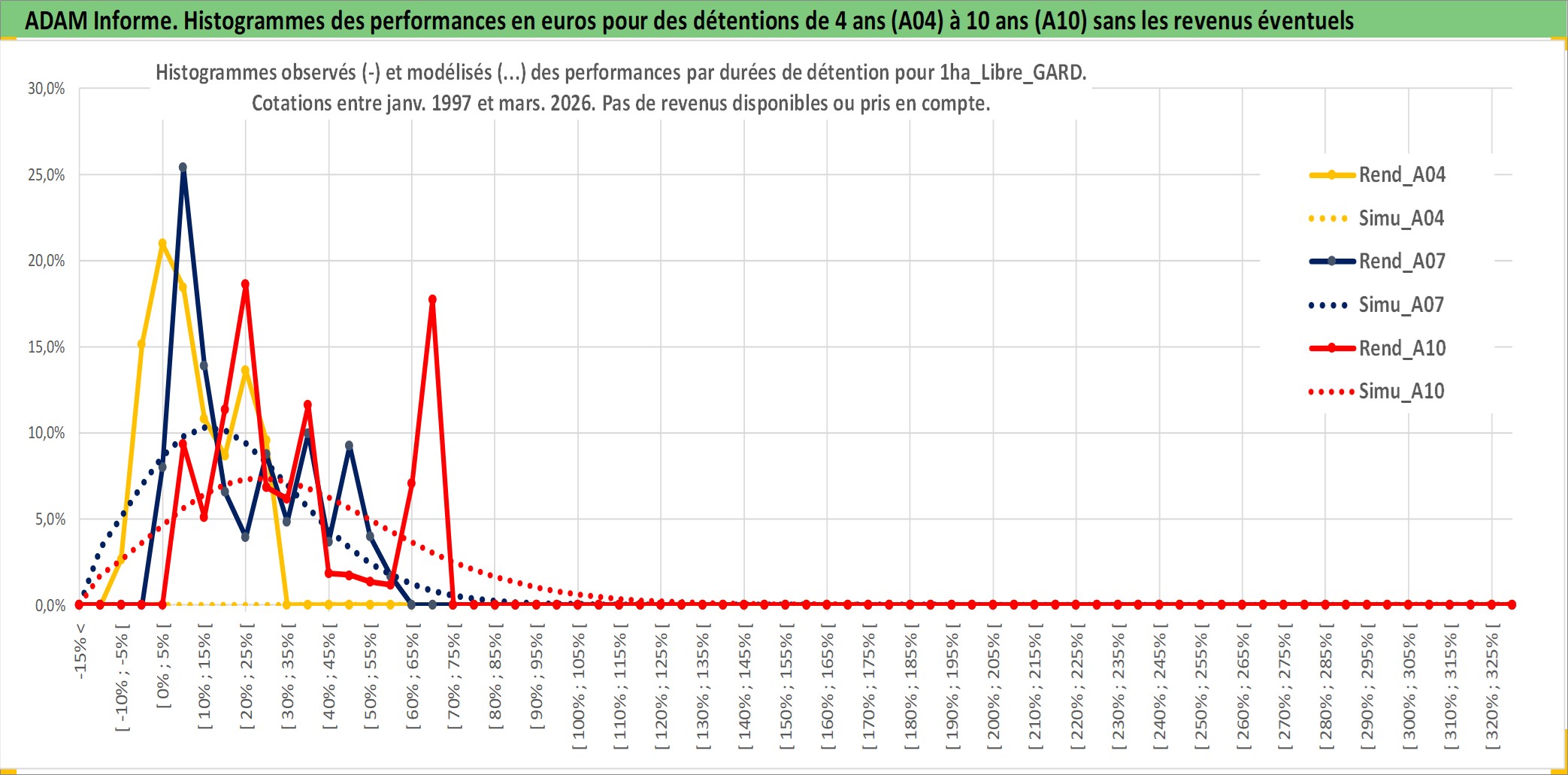 Site dédié aux investisseursPage dédiée sur site financeAnalyse des valorisations hebdomadaires de l'actif 1ha_Libre_GARD. Cet actif est cote en EUR. Les valorisations couvrent les semaines 1997W01 a 2026W13. Les fermages de ce bien foncier sont pris egaux a 2,5% annuels de la valeur venale du bien.