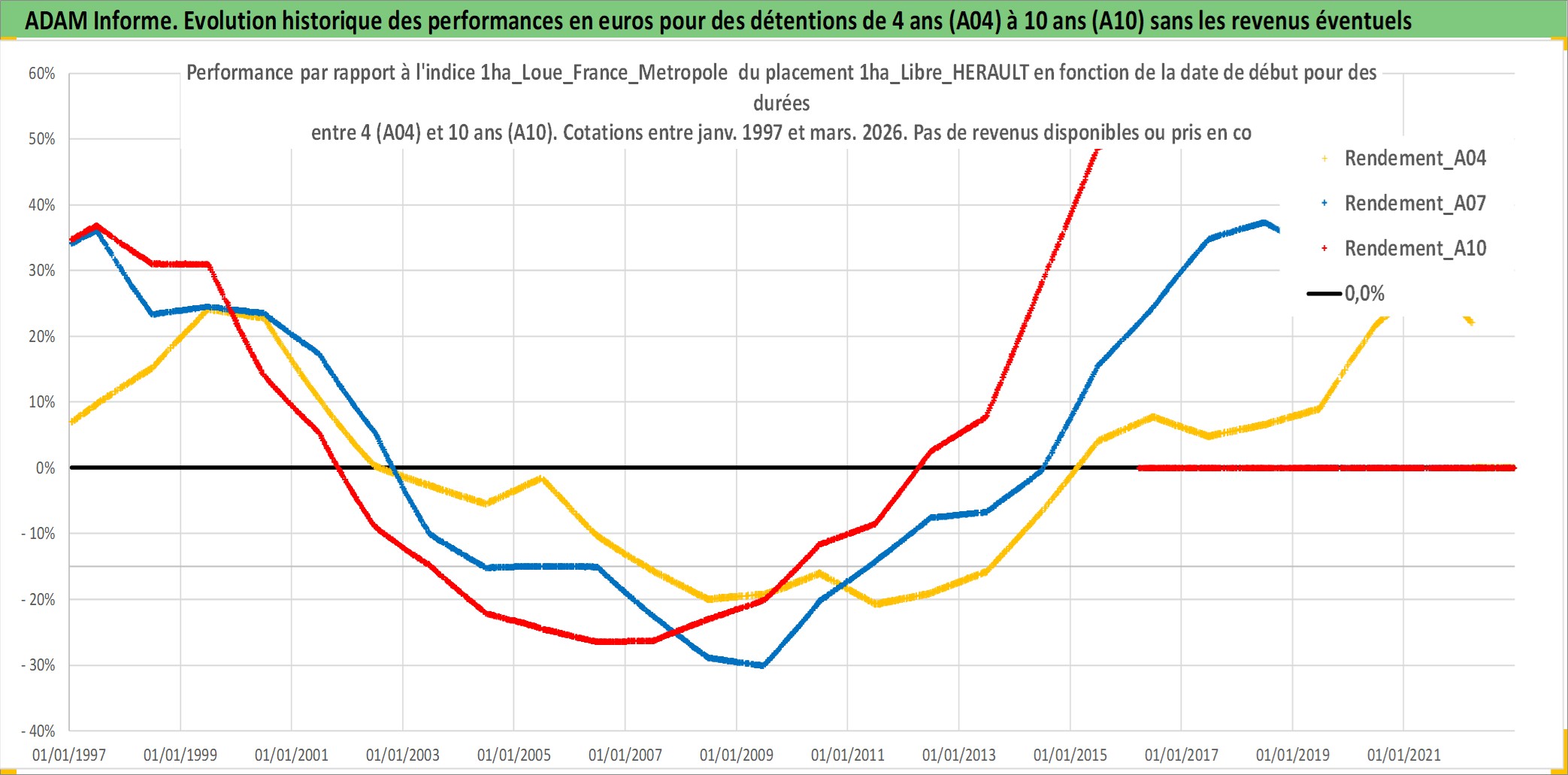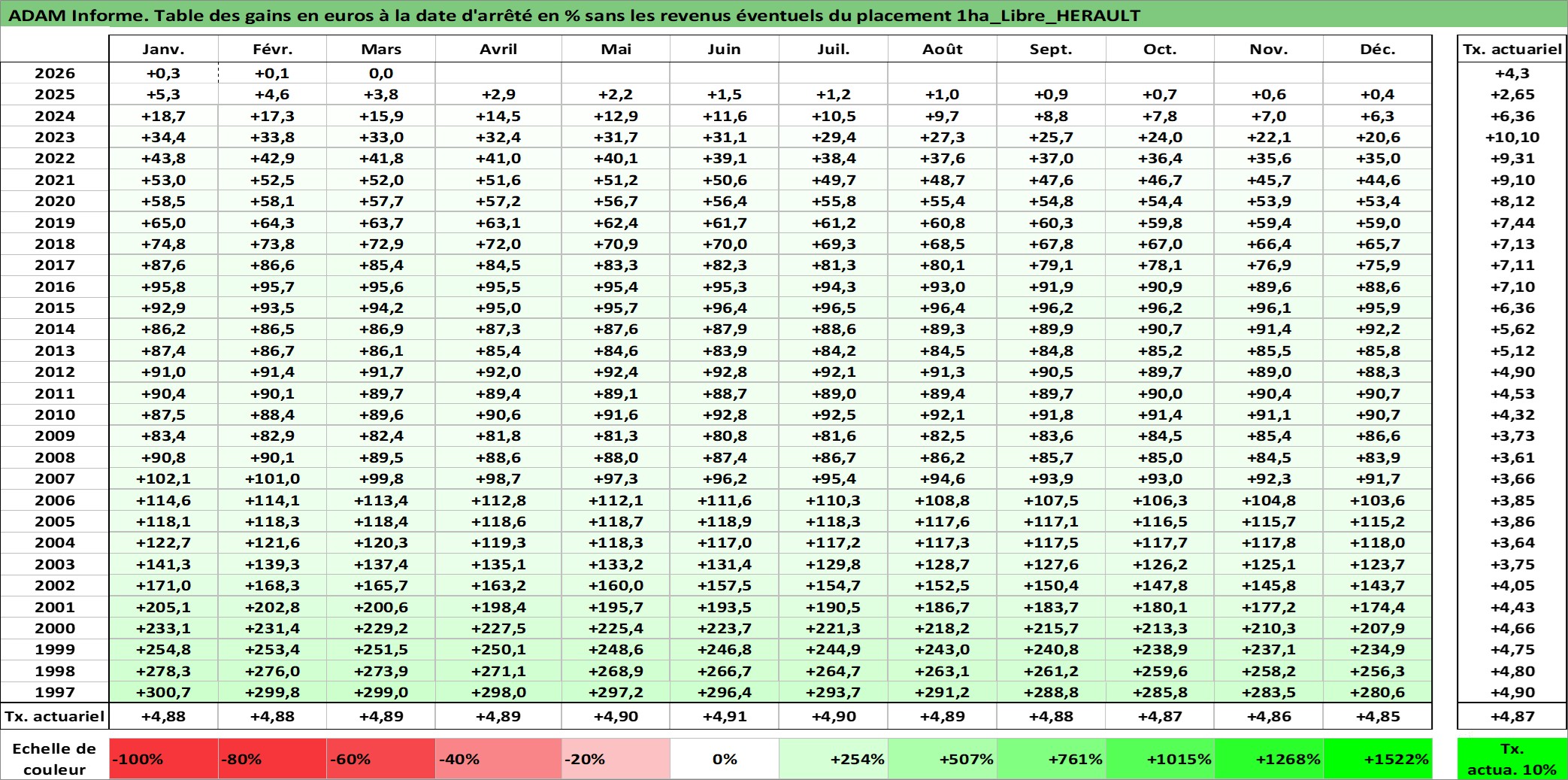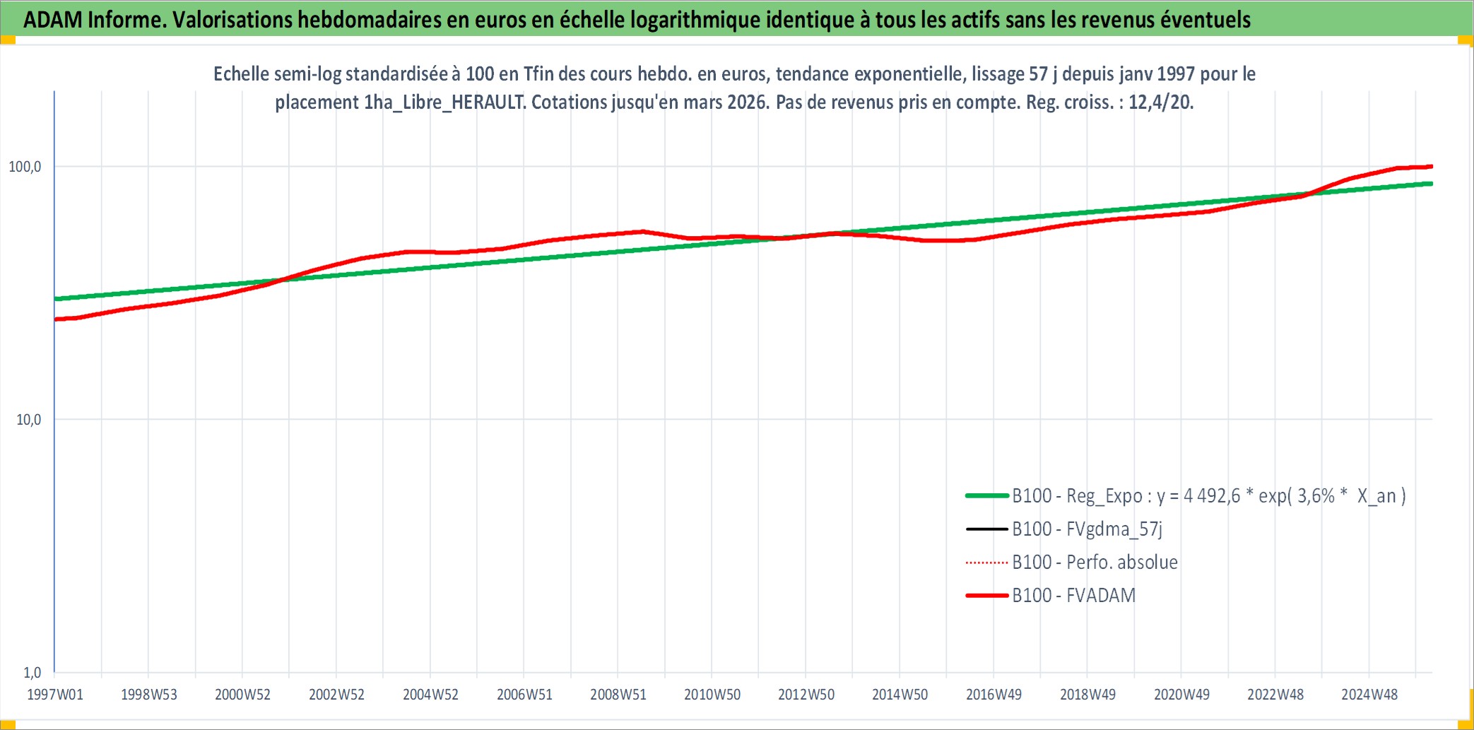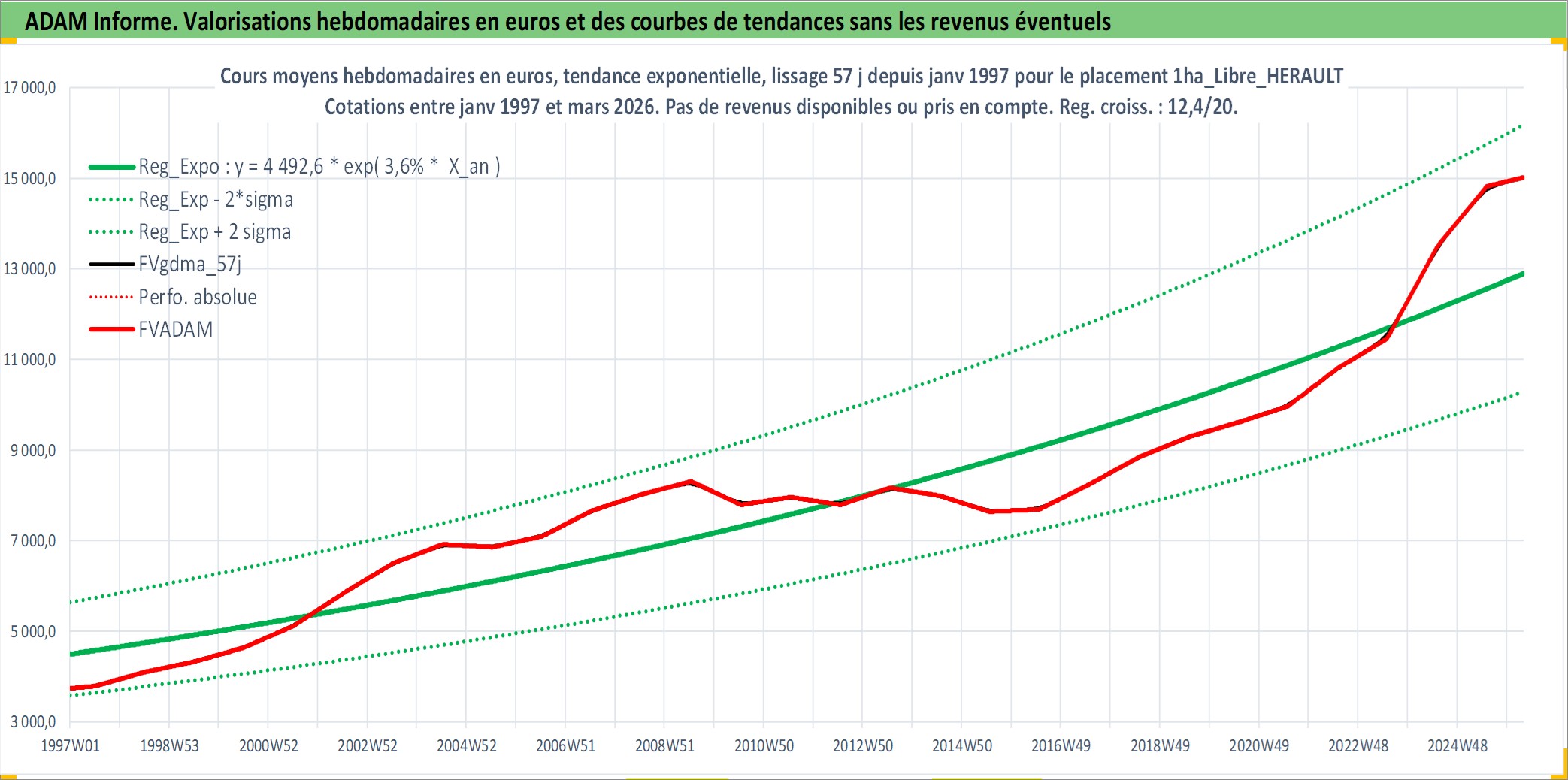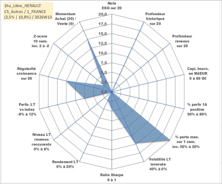Site dédié aux investisseursPage dédiée sur site financeAnalyse des valorisations hebdomadaires de l'actif 1ha_Libre_HERAULT. Cet actif est cote en EUR. Les valorisations couvrent les semaines 1997W01 a 2026W13. Les fermages de ce bien foncier sont pris egaux a 2,5% annuels de la valeur venale du bien.
