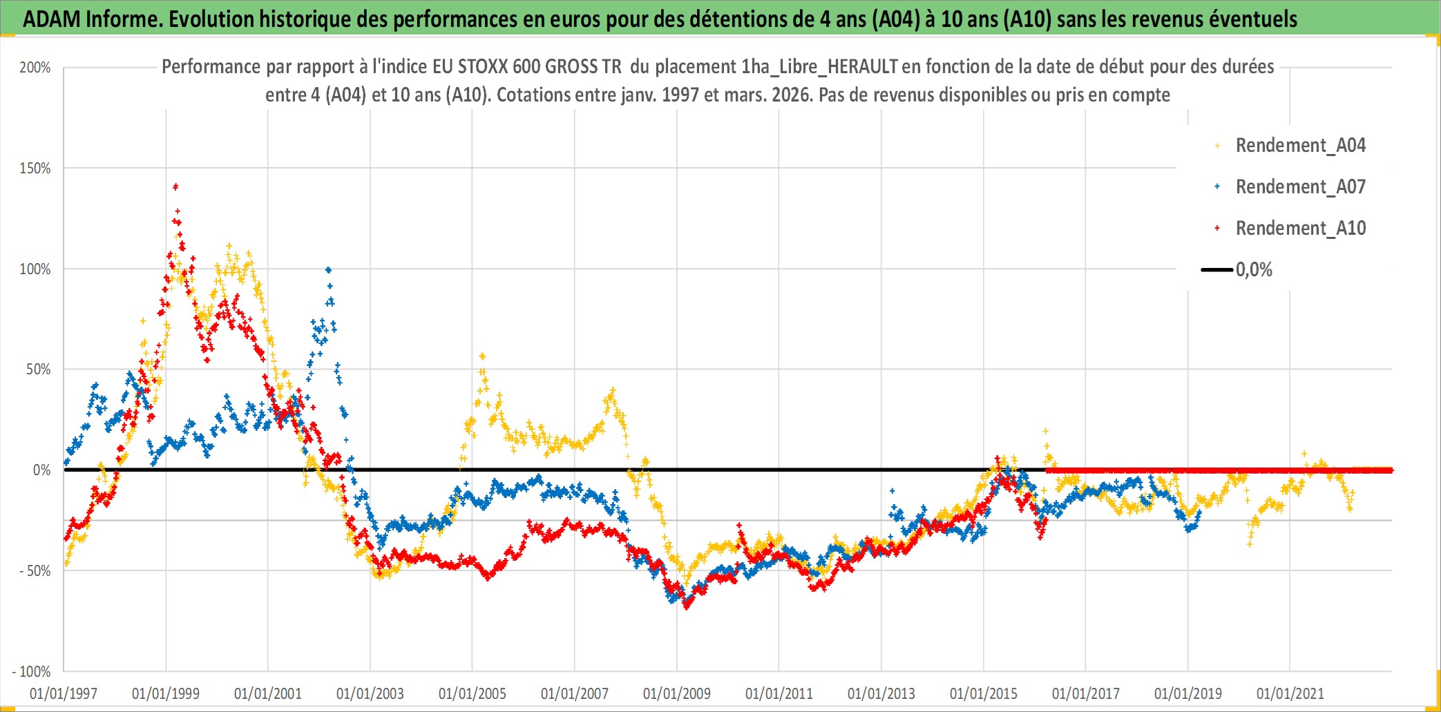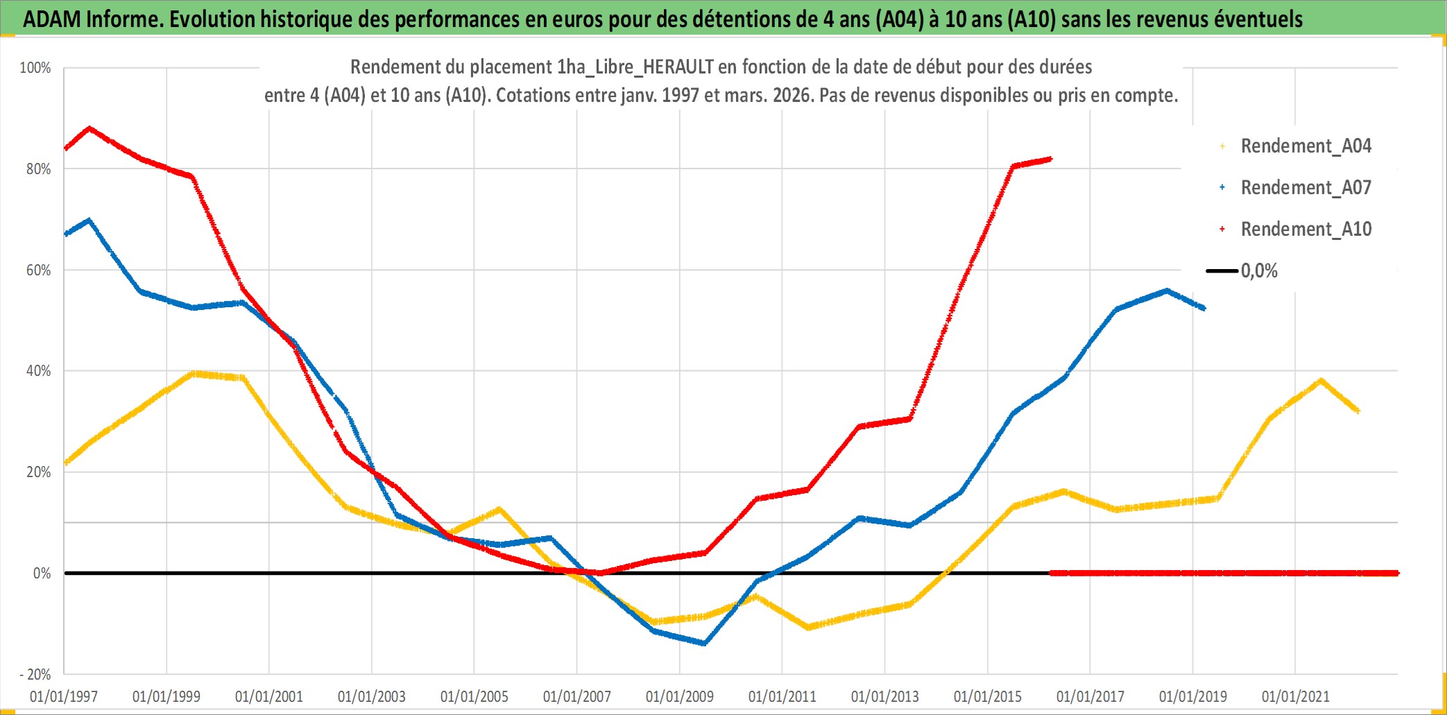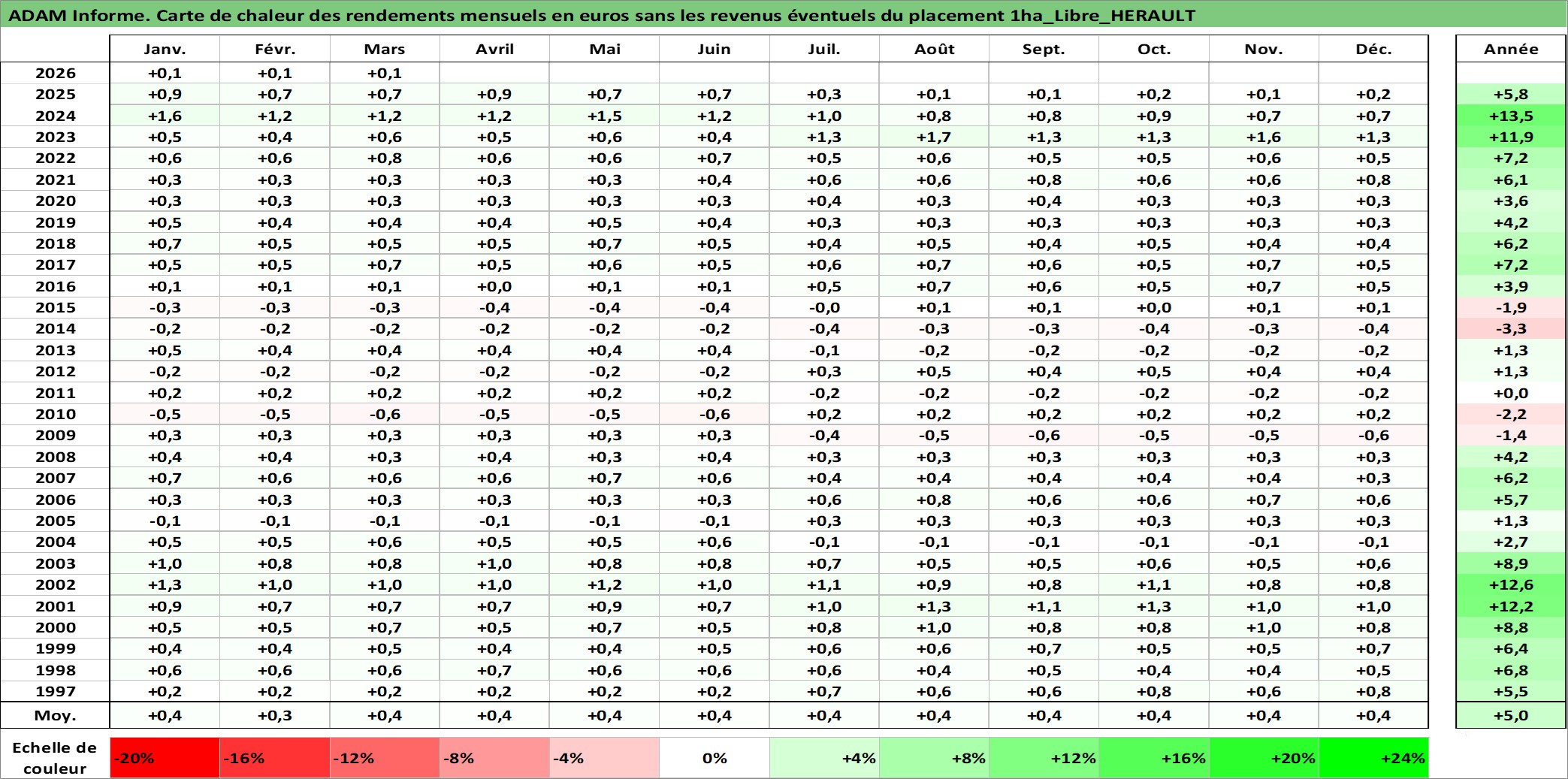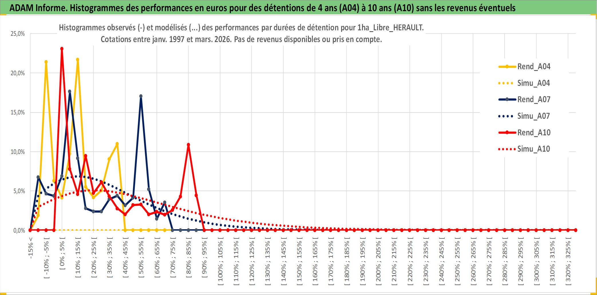 Site dédié aux investisseursPage dédiée sur site financeAnalyse des valorisations hebdomadaires de l'actif 1ha_Libre_HERAULT. Cet actif est cote en EUR. Les valorisations couvrent les semaines 1997W01 a 2026W13. Les fermages de ce bien foncier sont pris egaux a 2,5% annuels de la valeur venale du bien.