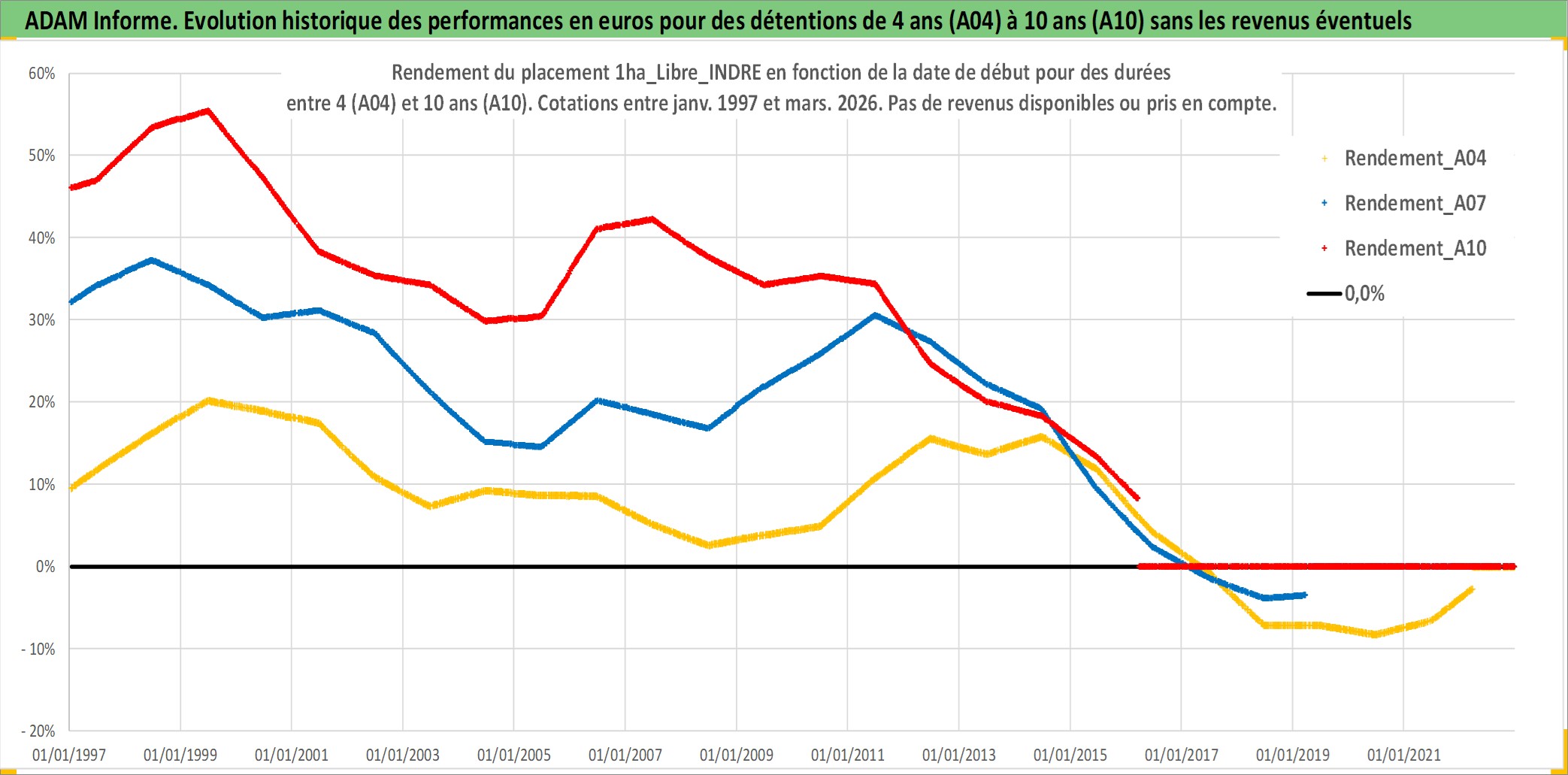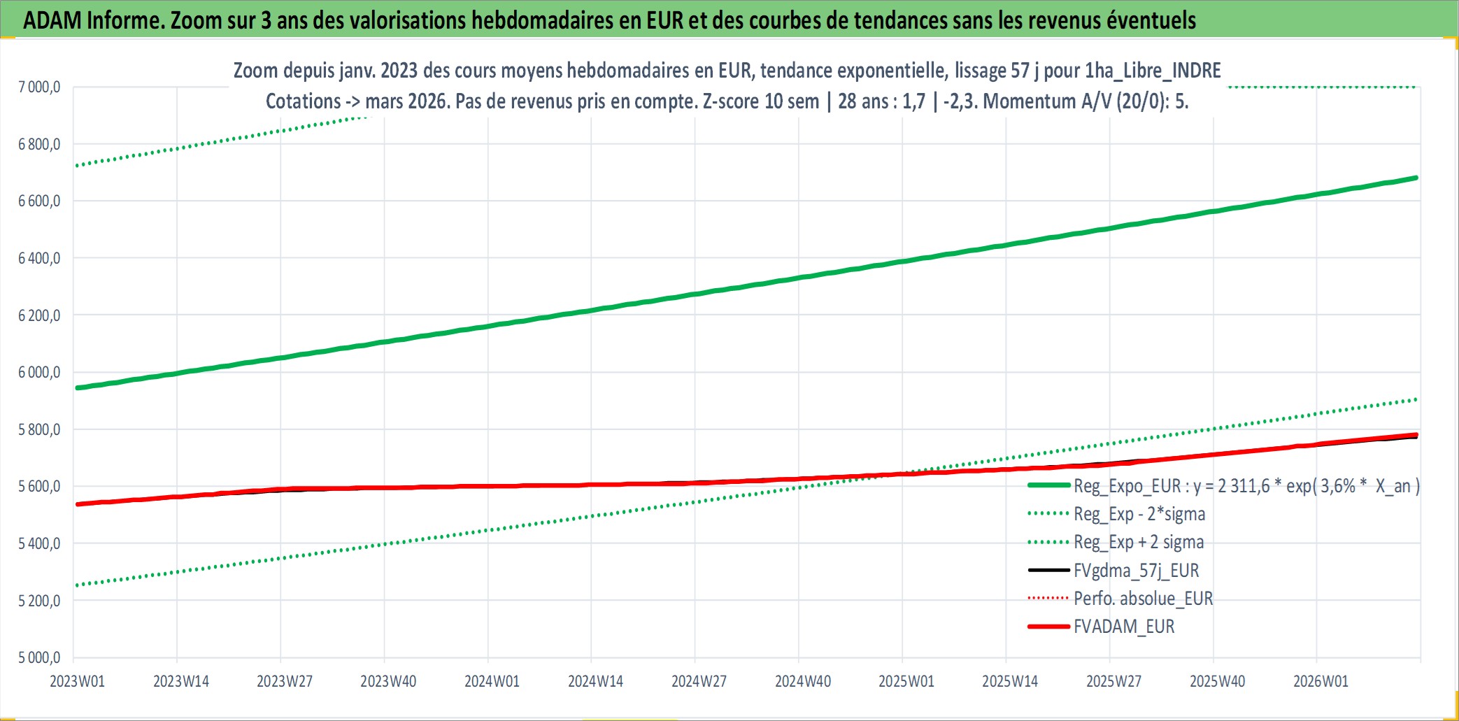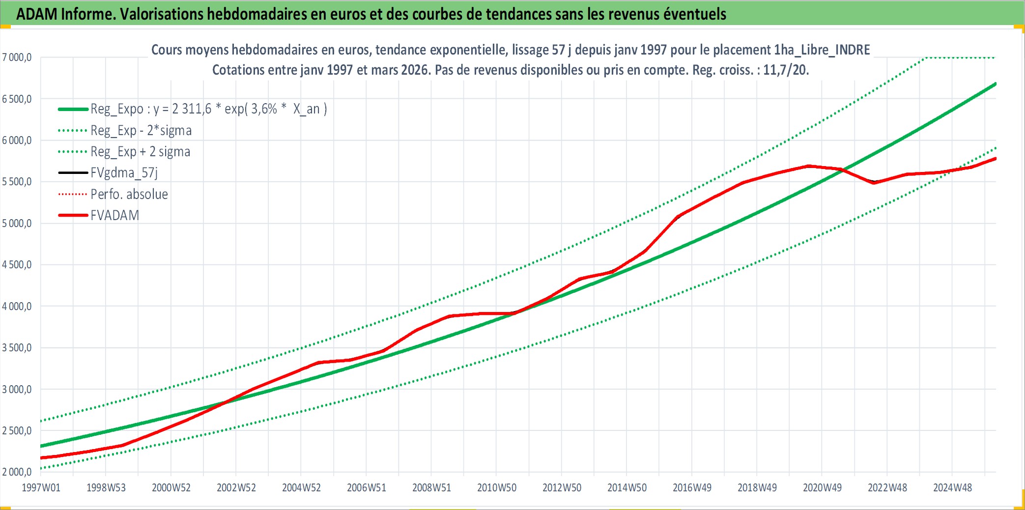 Site dédié aux investisseursPage dédiée sur site financeAnalyse des valorisations hebdomadaires de l'actif 1ha_Libre_INDRE. Cet actif est cote en EUR. Les valorisations couvrent les semaines 1997W01 a 2026W13. Les fermages de ce bien foncier sont pris egaux a 2,5% annuels de la valeur venale du bien.