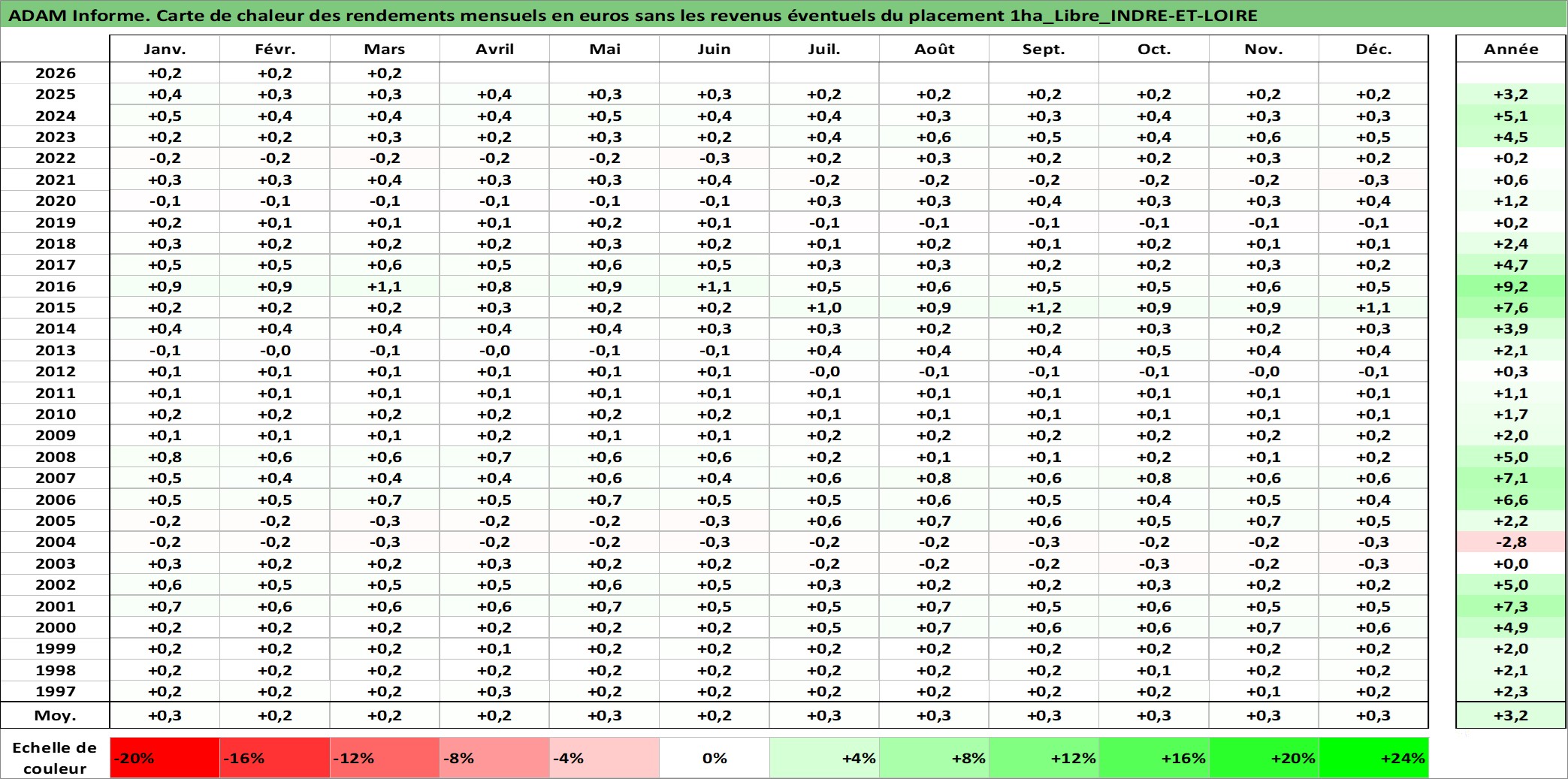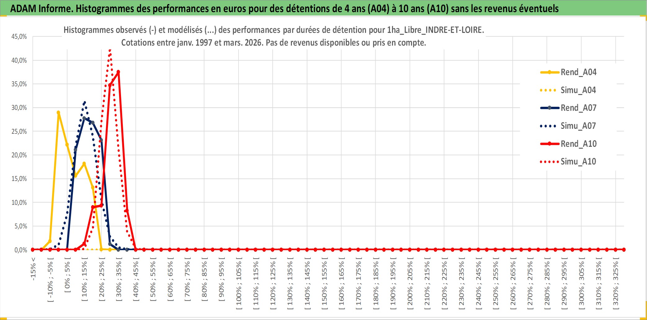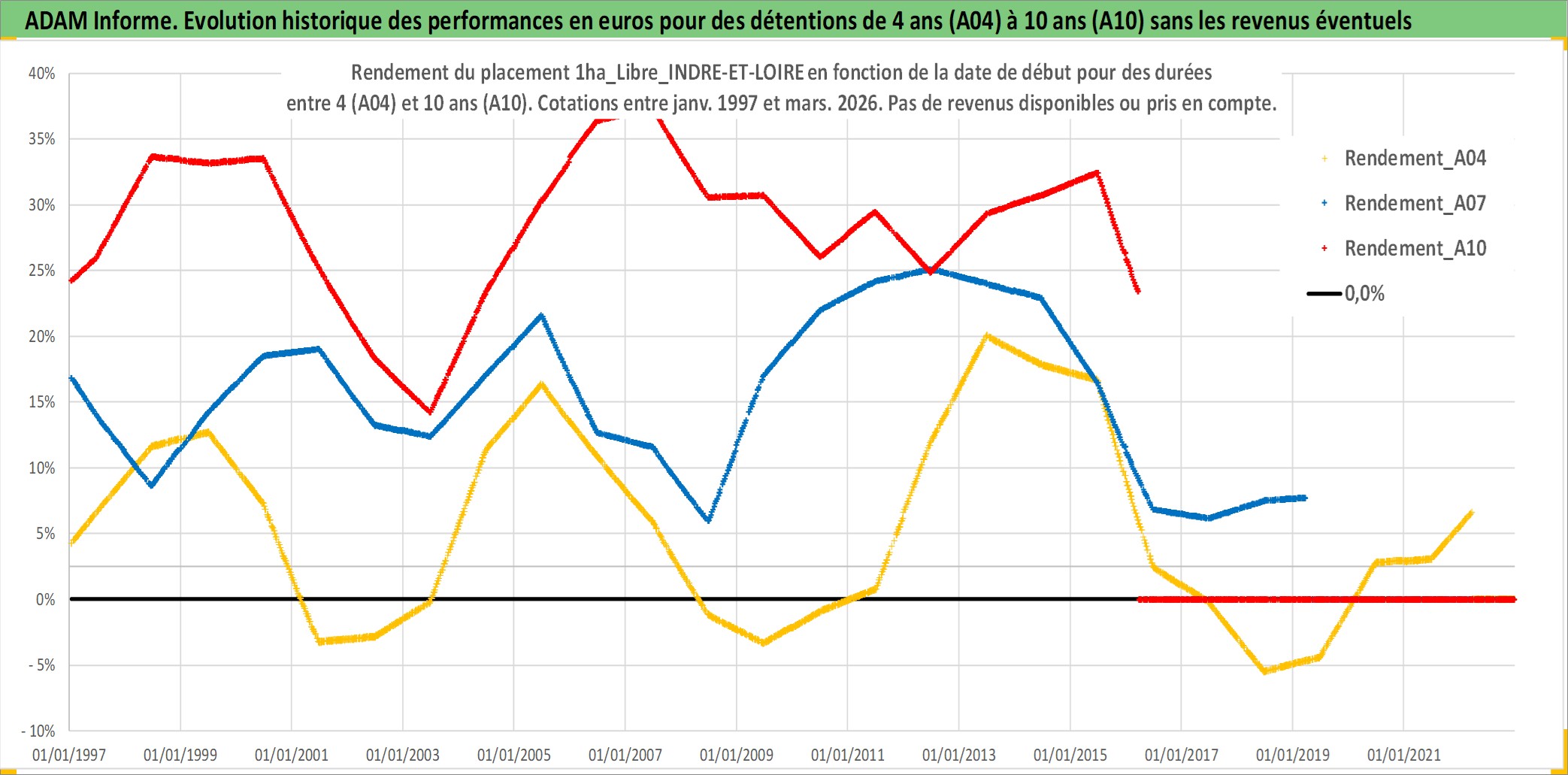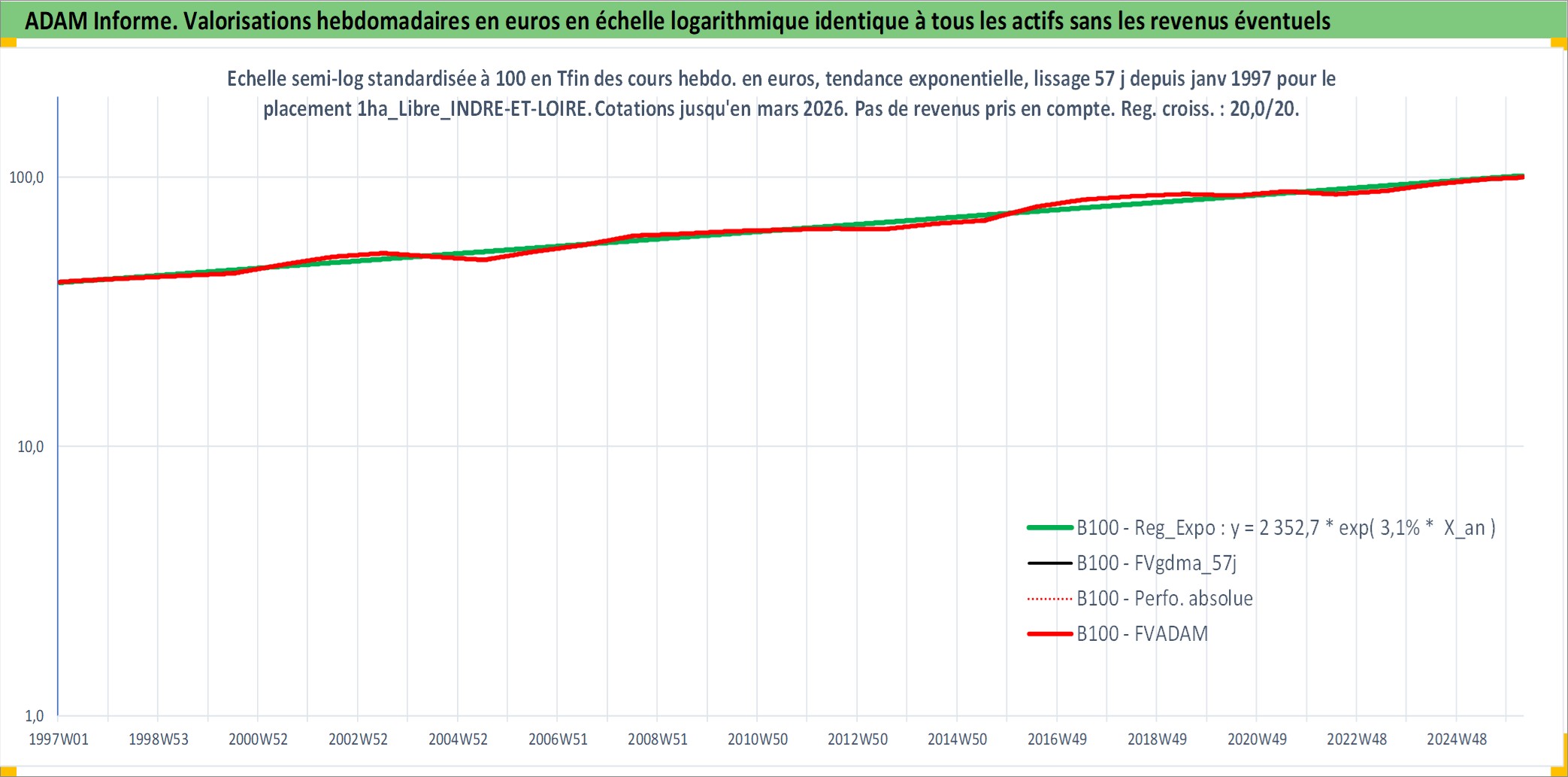 Site dédié aux investisseursPage dédiée sur site financeAnalyse des valorisations hebdomadaires de l'actif 1ha_Libre_INDRE-ET-LOIRE. Cet actif est cote en EUR. Les valorisations couvrent les semaines 1997W01 a 2026W13. Les fermages de ce bien foncier sont pris egaux a 2,5% annuels de la valeur venale du bien.