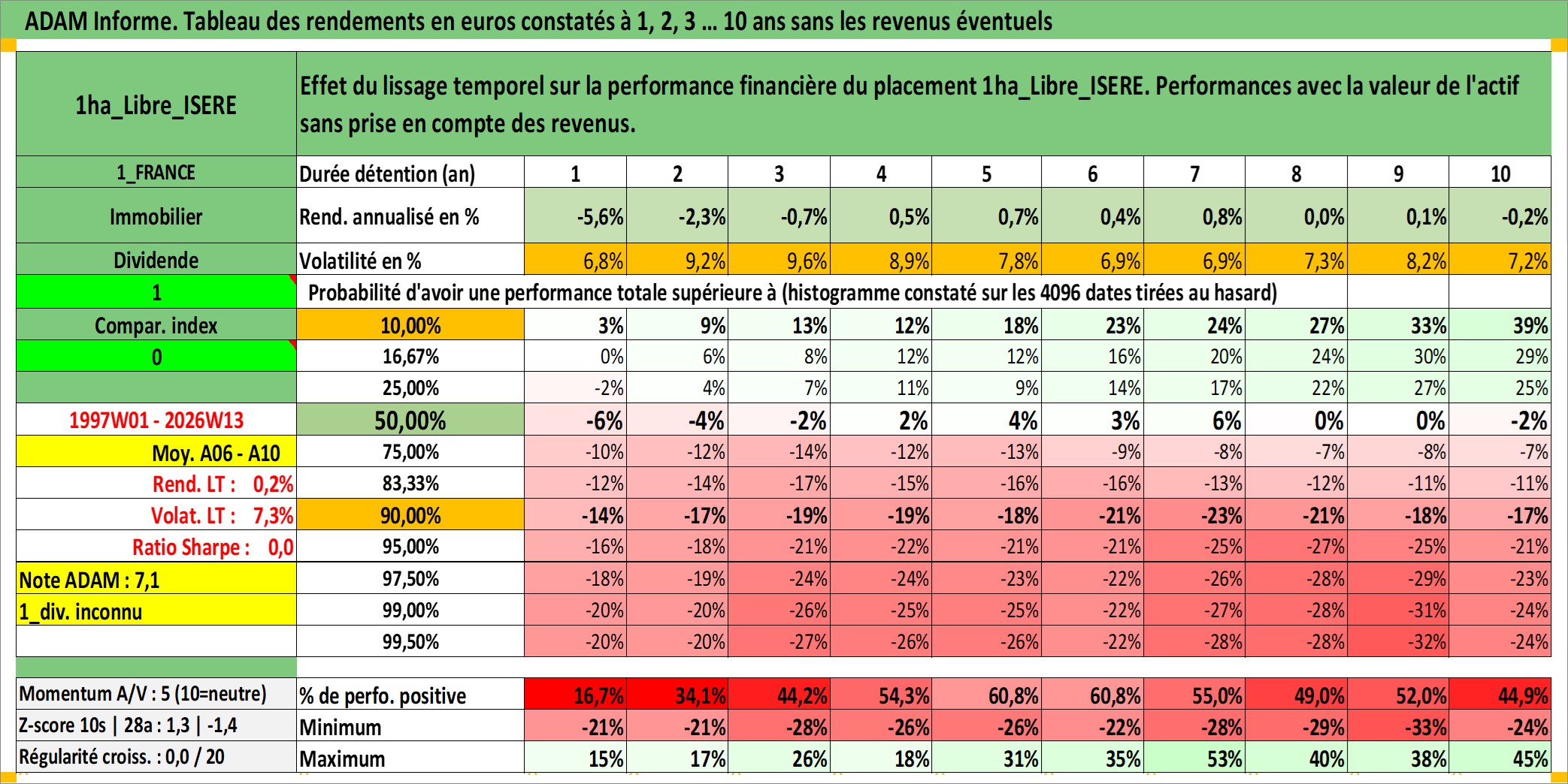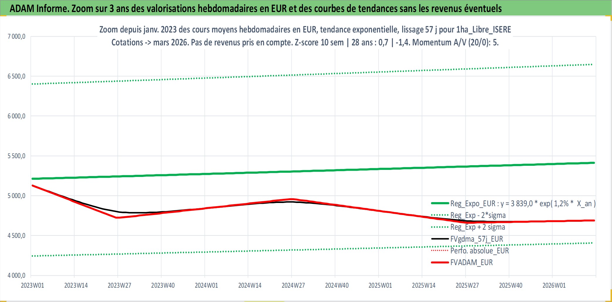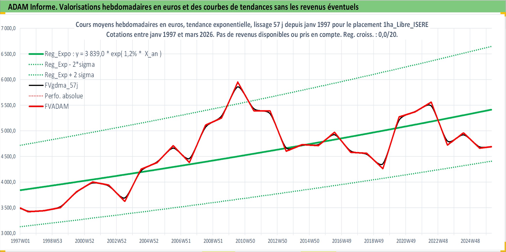 Site dédié aux investisseursPage dédiée sur site financeAnalyse des valorisations hebdomadaires de l'actif 1ha_Libre_ISERE. Cet actif est cote en EUR. Les valorisations couvrent les semaines 1997W01 a 2026W13. Les fermages de ce bien foncier sont pris egaux a 2,5% annuels de la valeur venale du bien.