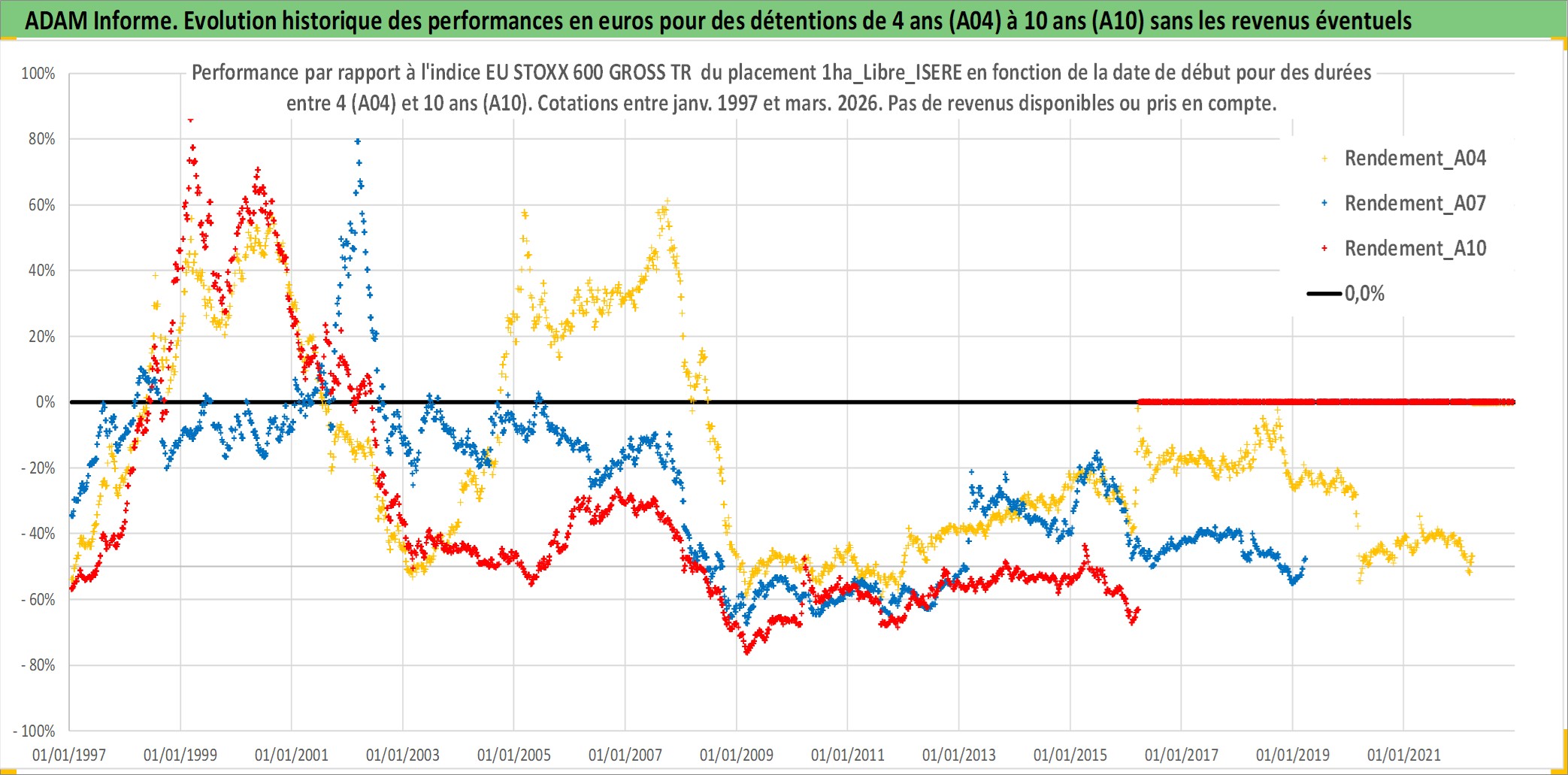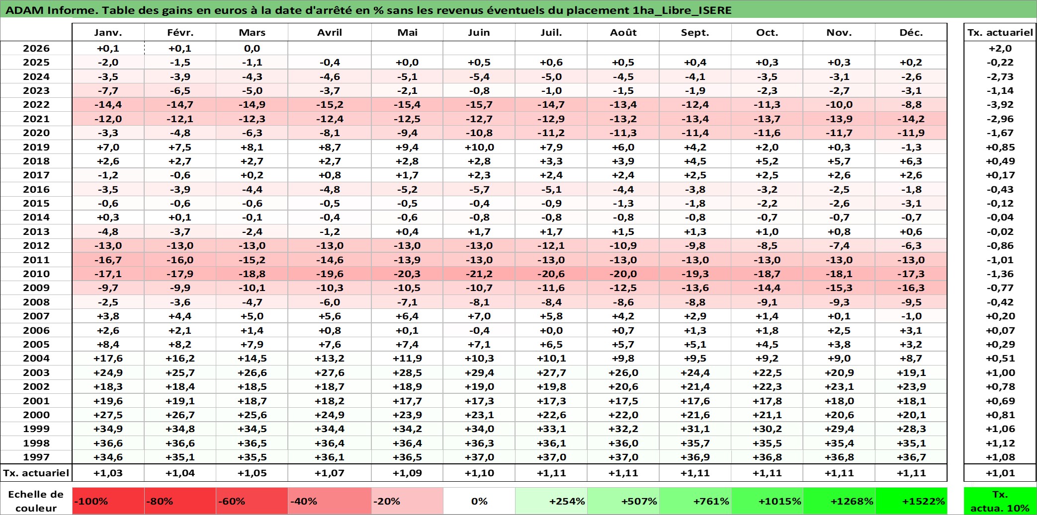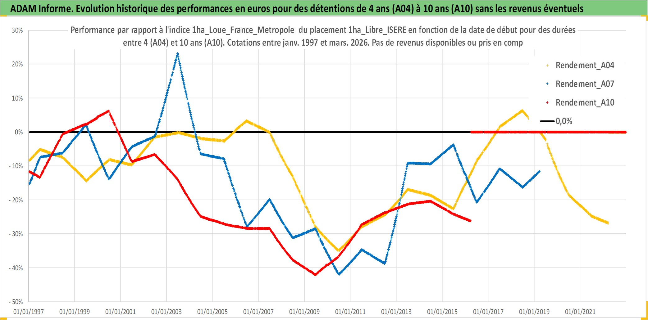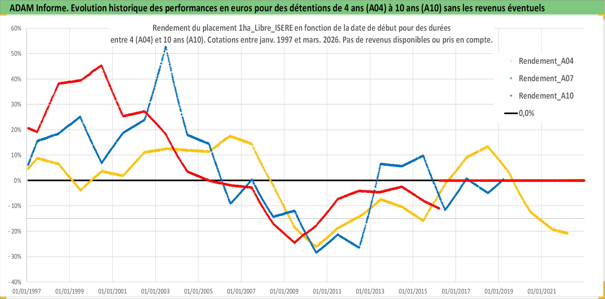 Site dédié aux investisseursPage dédiée sur site financeAnalyse des valorisations hebdomadaires de l'actif 1ha_Libre_ISERE. Cet actif est cote en EUR. Les valorisations couvrent les semaines 1997W01 a 2026W13. Les fermages de ce bien foncier sont pris egaux a 2,5% annuels de la valeur venale du bien.