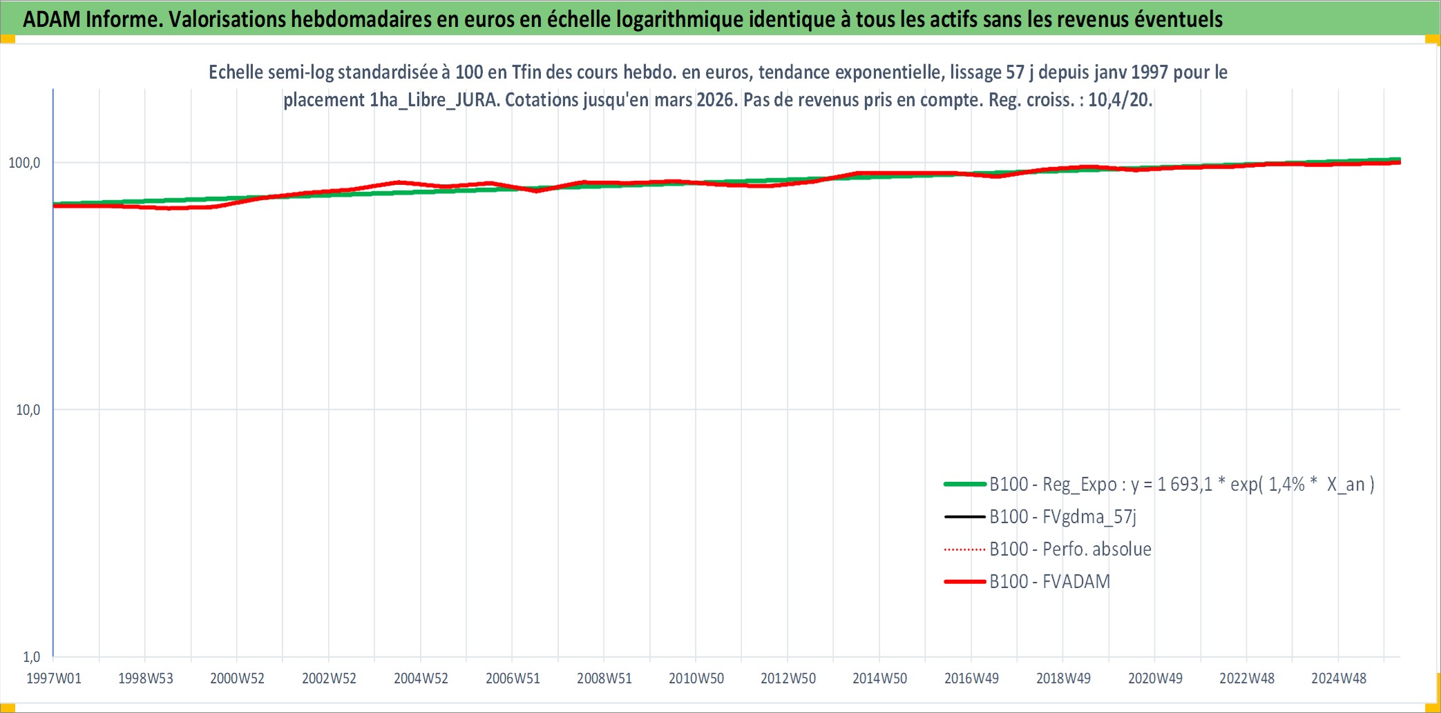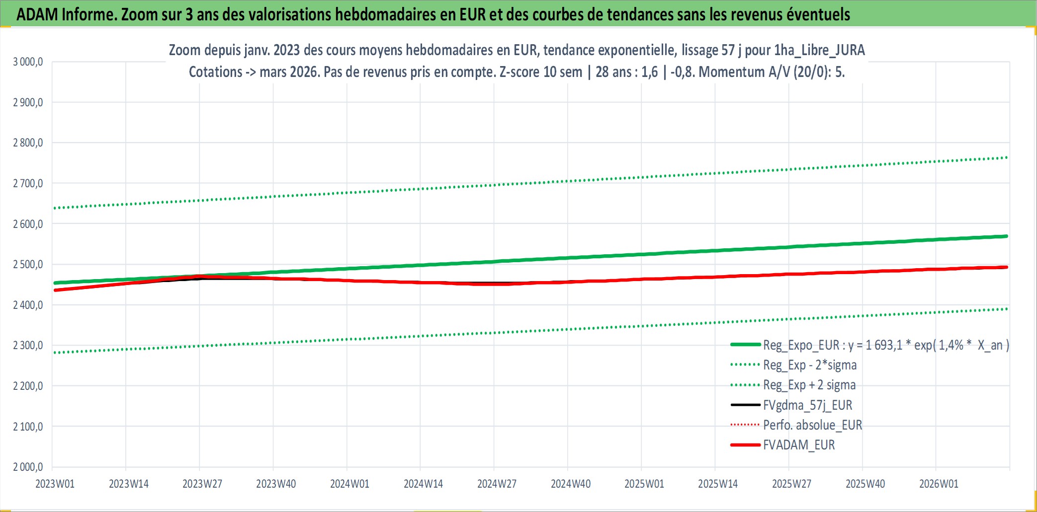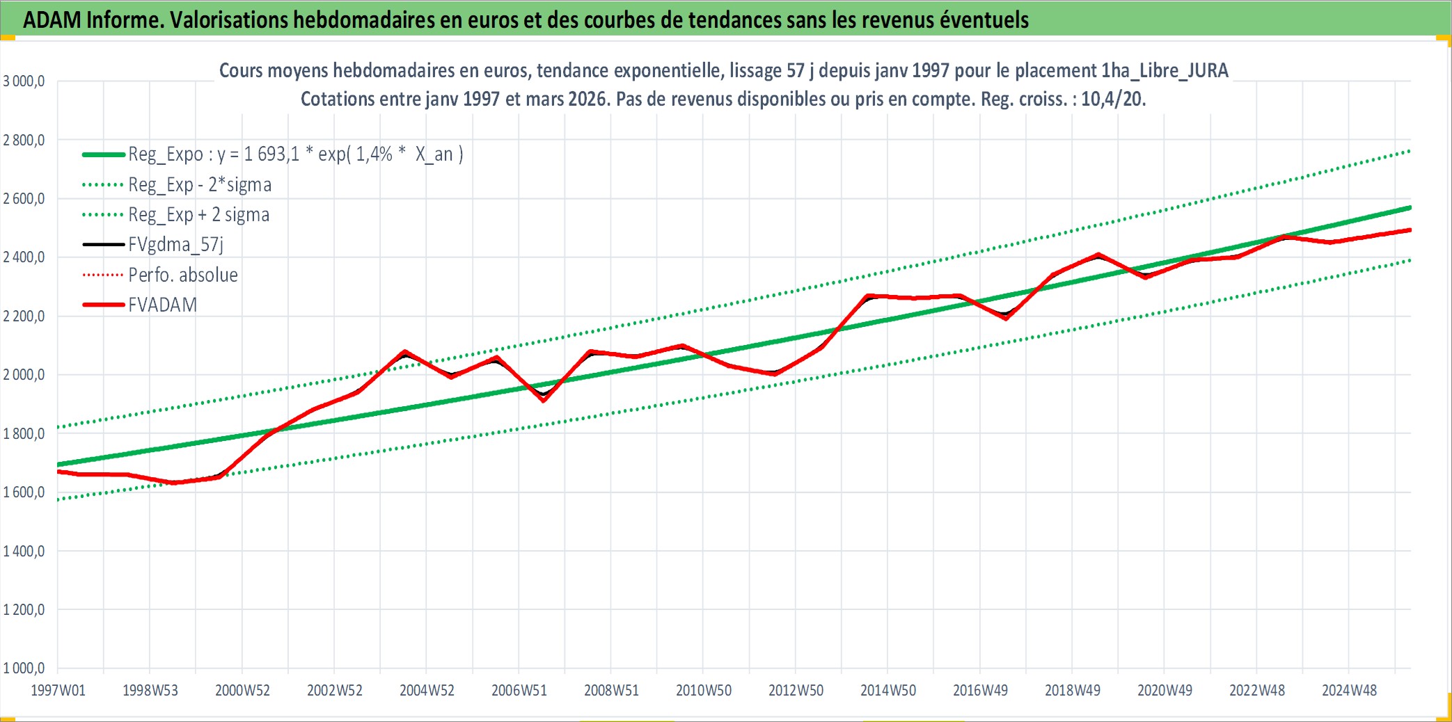 Site dédié aux investisseursPage dédiée sur site financeAnalyse des valorisations hebdomadaires de l'actif 1ha_Libre_JURA. Cet actif est cote en EUR. Les valorisations couvrent les semaines 1997W01 a 2026W13. Les fermages de ce bien foncier sont pris egaux a 2,5% annuels de la valeur venale du bien.