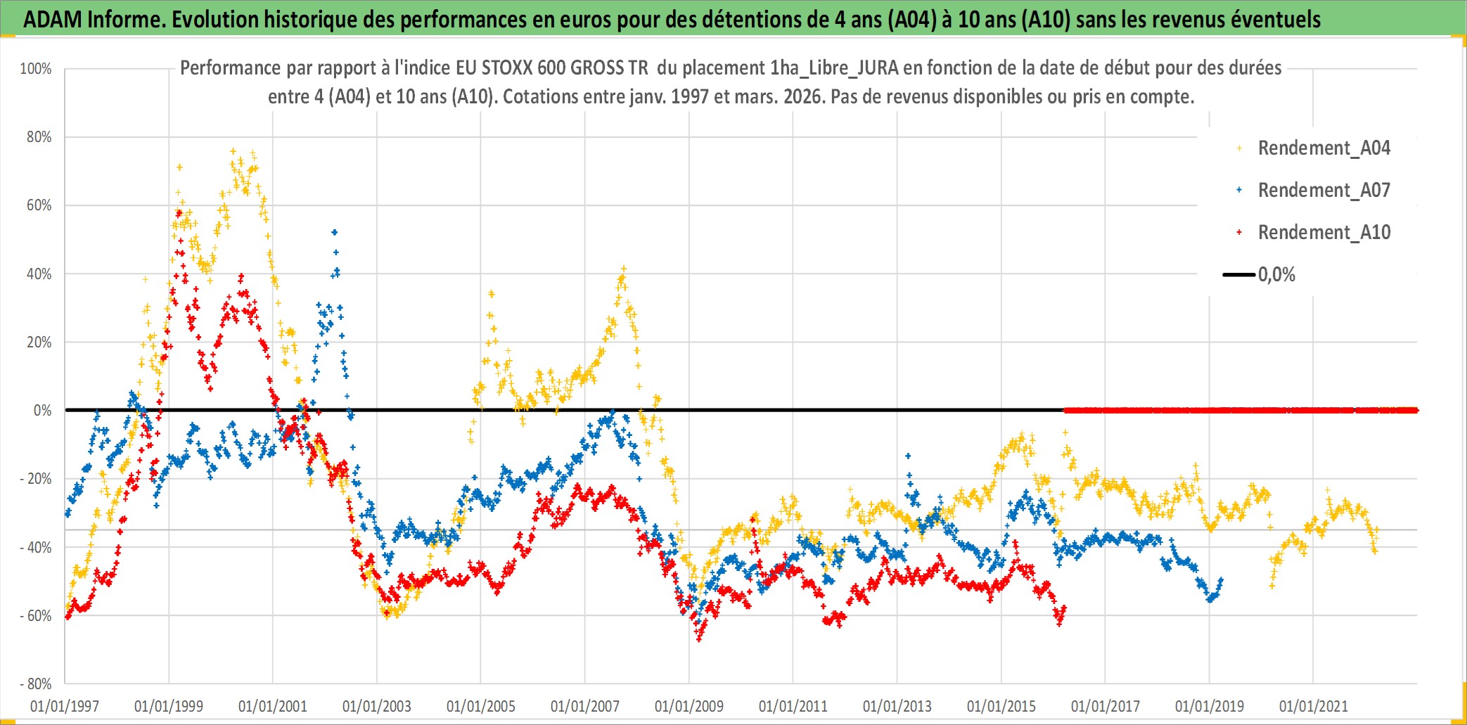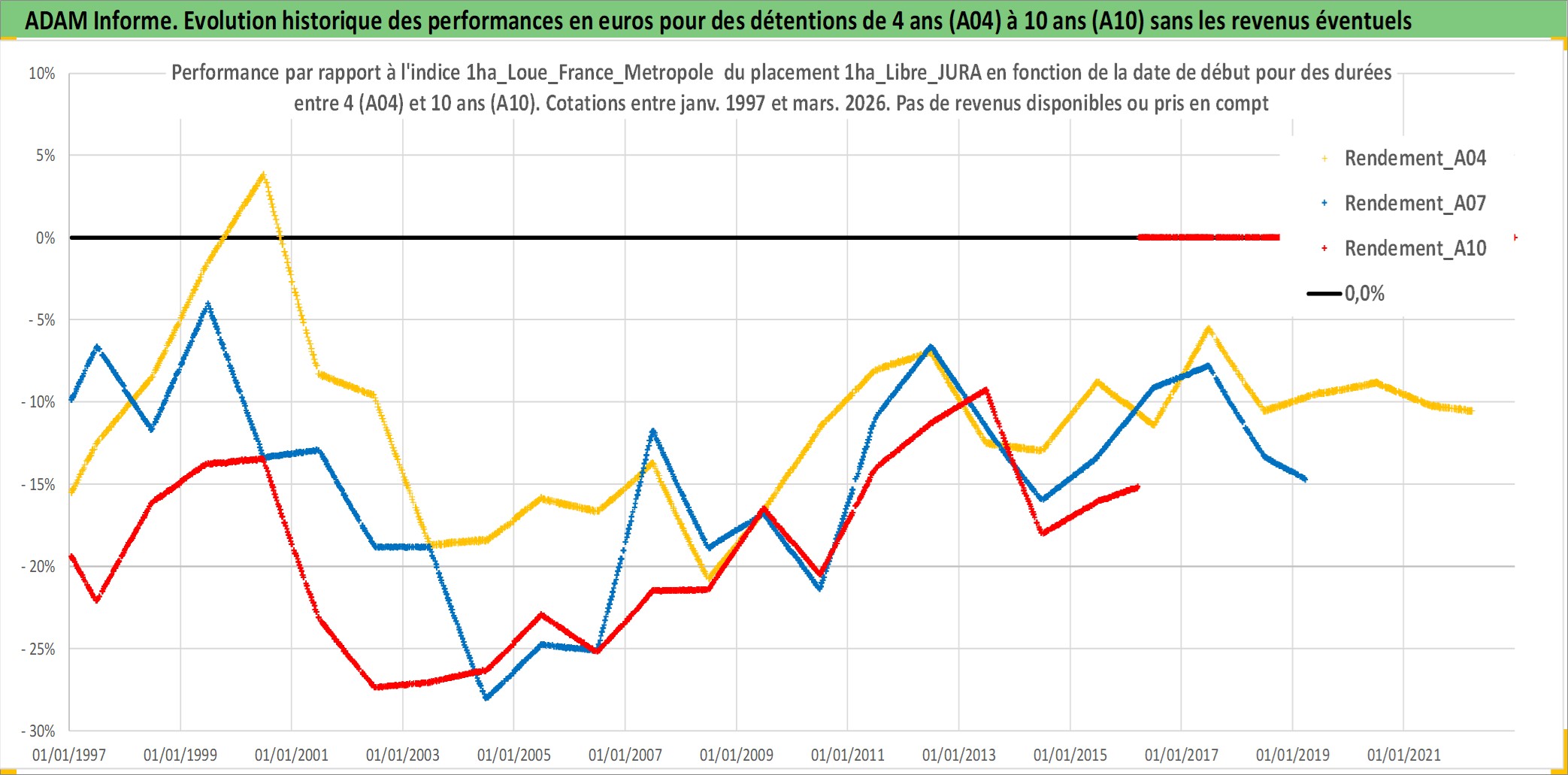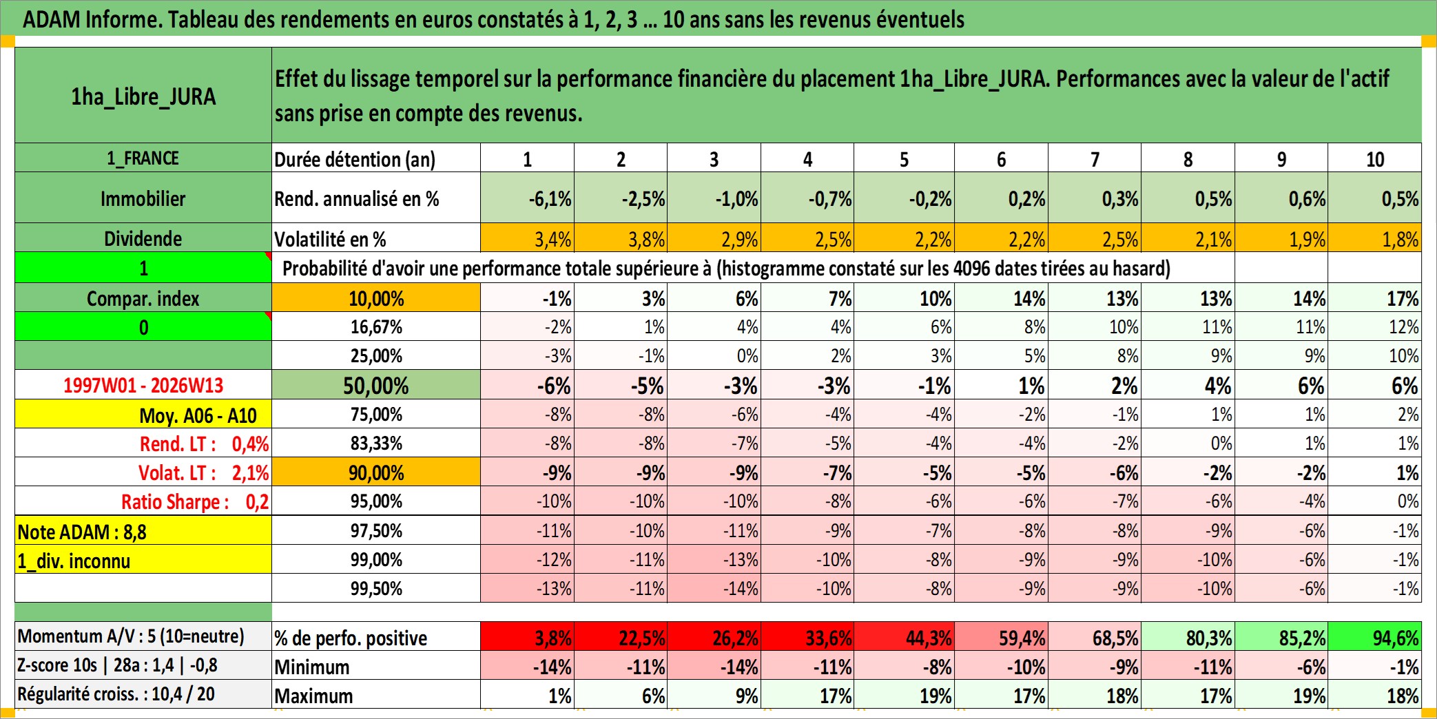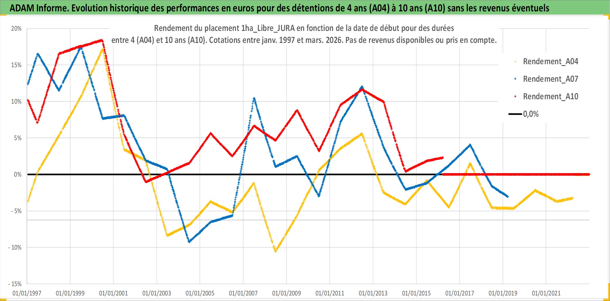 Site dédié aux investisseursPage dédiée sur site financeAnalyse des valorisations hebdomadaires de l'actif 1ha_Libre_JURA. Cet actif est cote en EUR. Les valorisations couvrent les semaines 1997W01 a 2026W13. Les fermages de ce bien foncier sont pris egaux a 2,5% annuels de la valeur venale du bien.