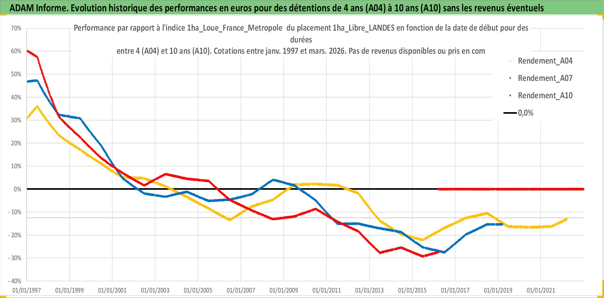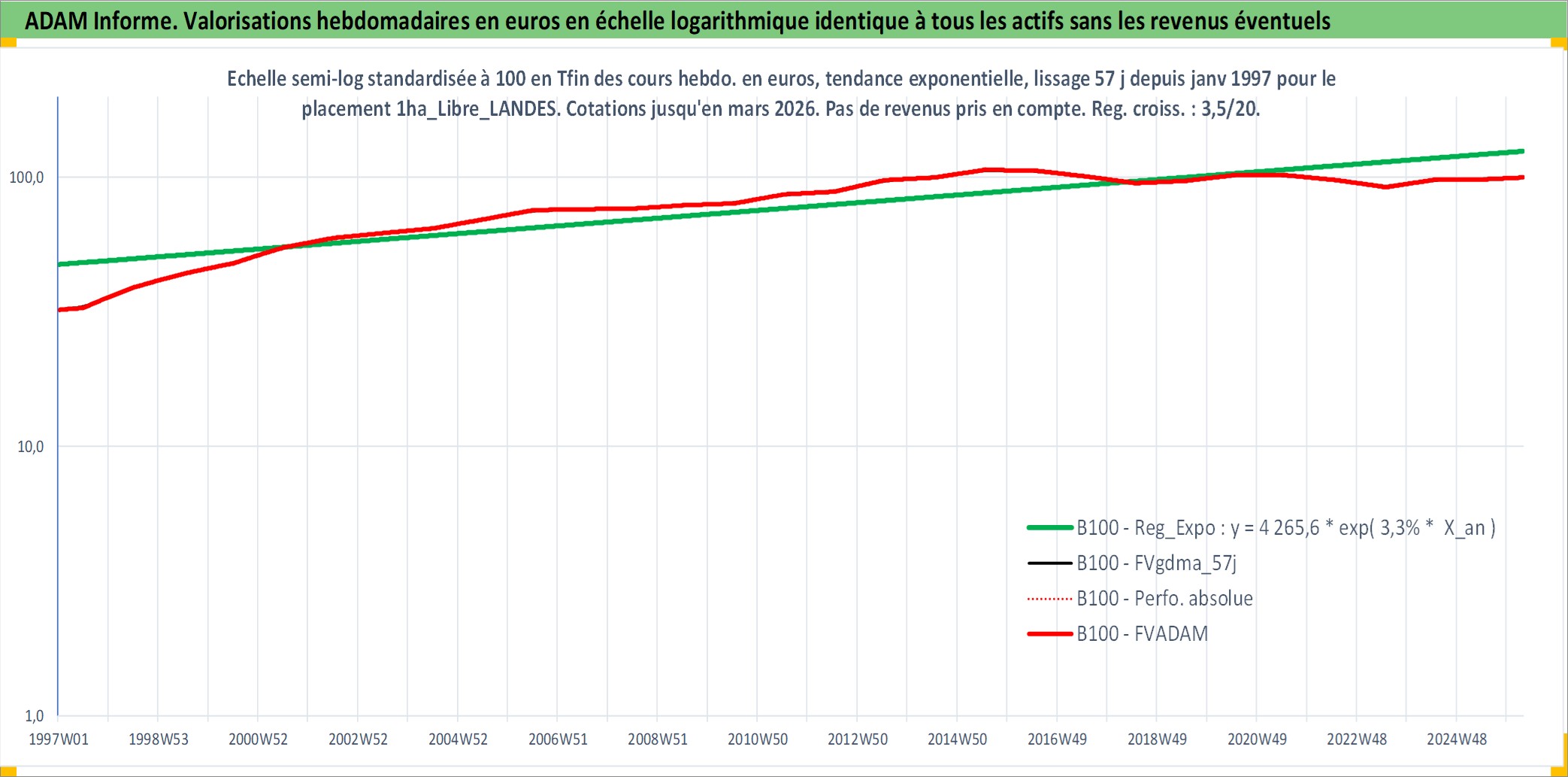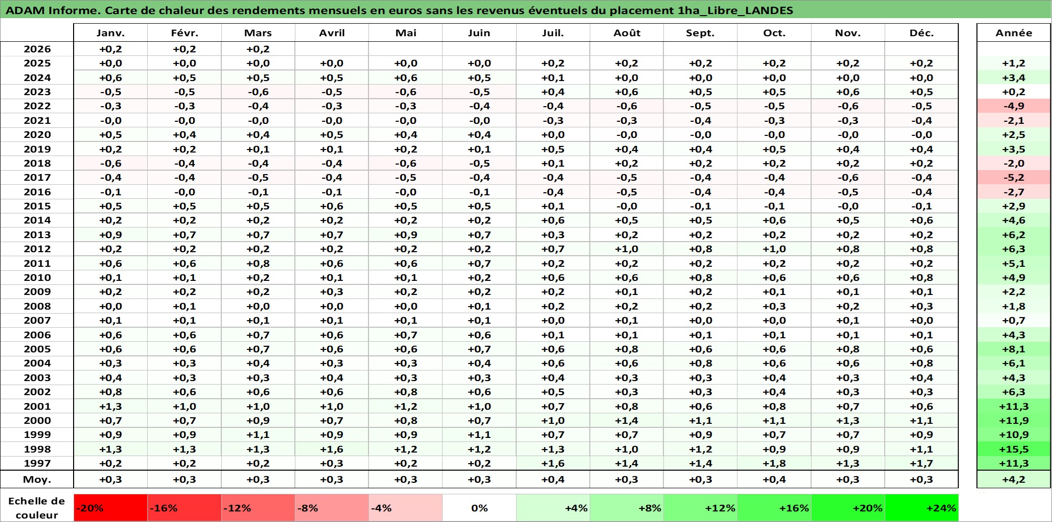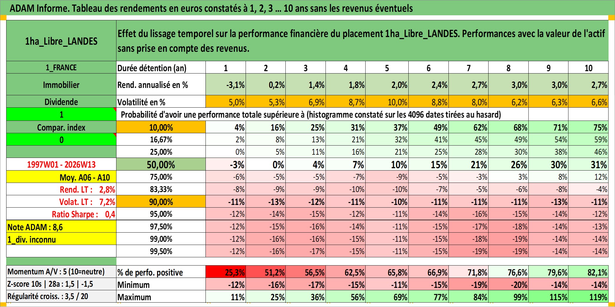 Site dédié aux investisseursPage dédiée sur site financeAnalyse des valorisations hebdomadaires de l'actif 1ha_Libre_LANDES. Cet actif est cote en EUR. Les valorisations couvrent les semaines 1997W01 a 2026W13. Les fermages de ce bien foncier sont pris egaux a 2,5% annuels de la valeur venale du bien.