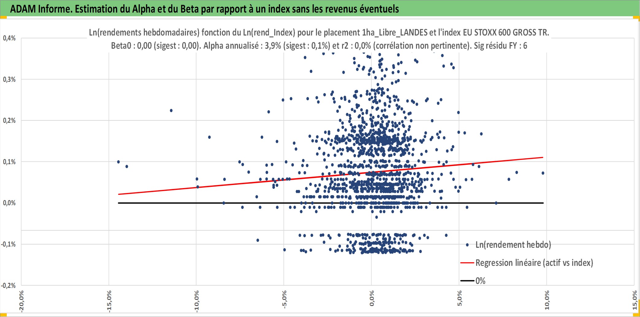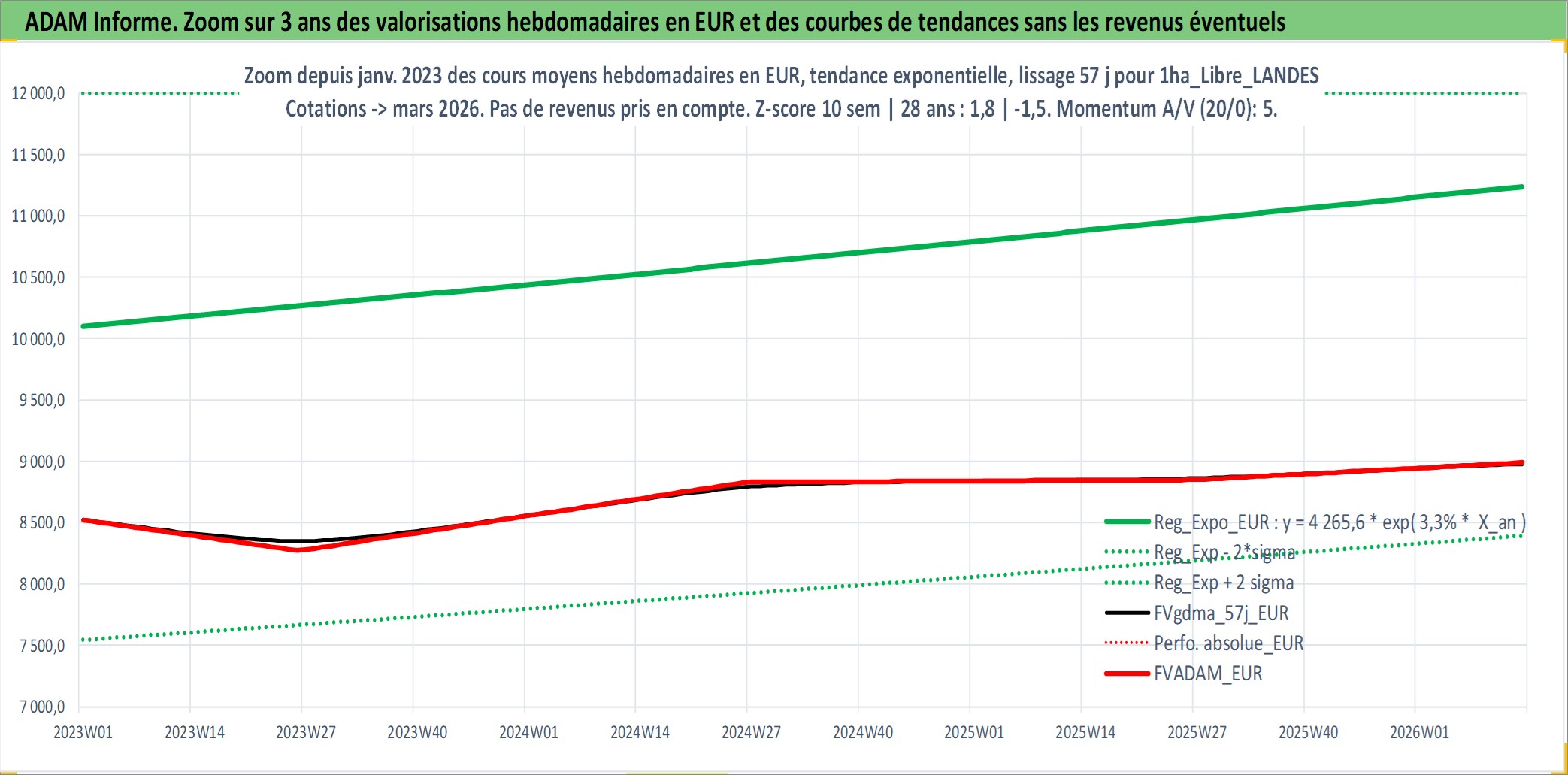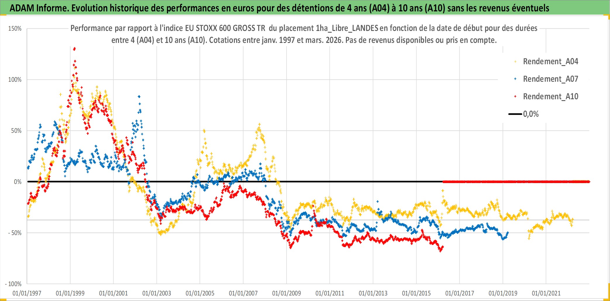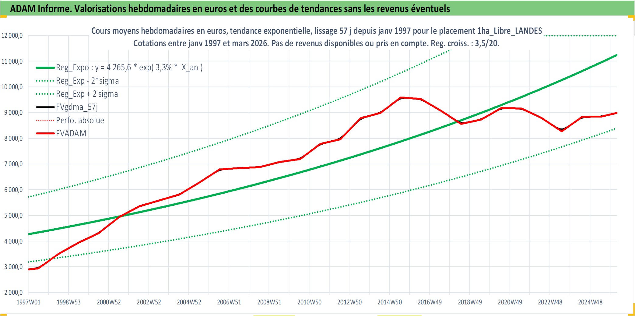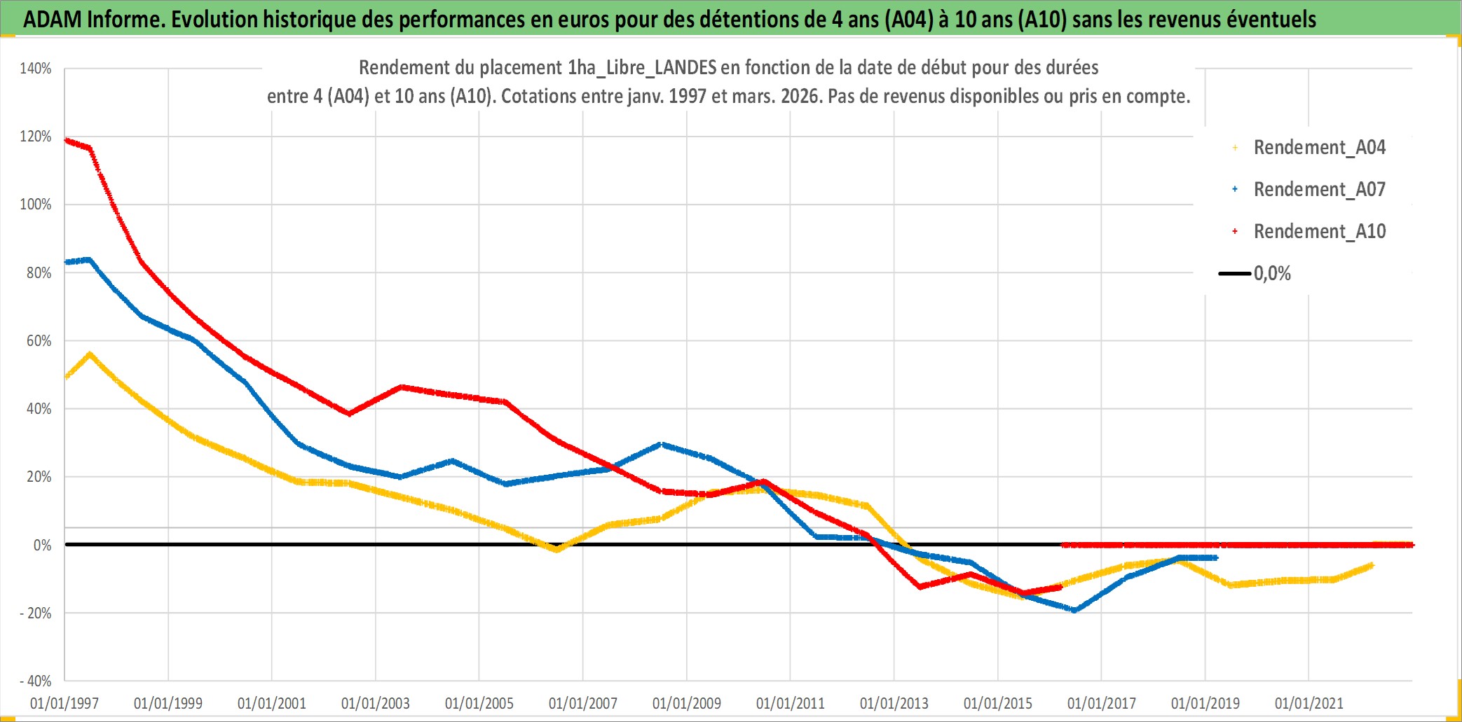 Site dédié aux investisseursPage dédiée sur site financeAnalyse des valorisations hebdomadaires de l'actif 1ha_Libre_LANDES. Cet actif est cote en EUR. Les valorisations couvrent les semaines 1997W01 a 2026W13. Les fermages de ce bien foncier sont pris egaux a 2,5% annuels de la valeur venale du bien.