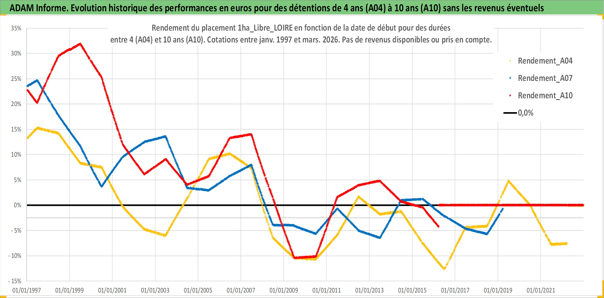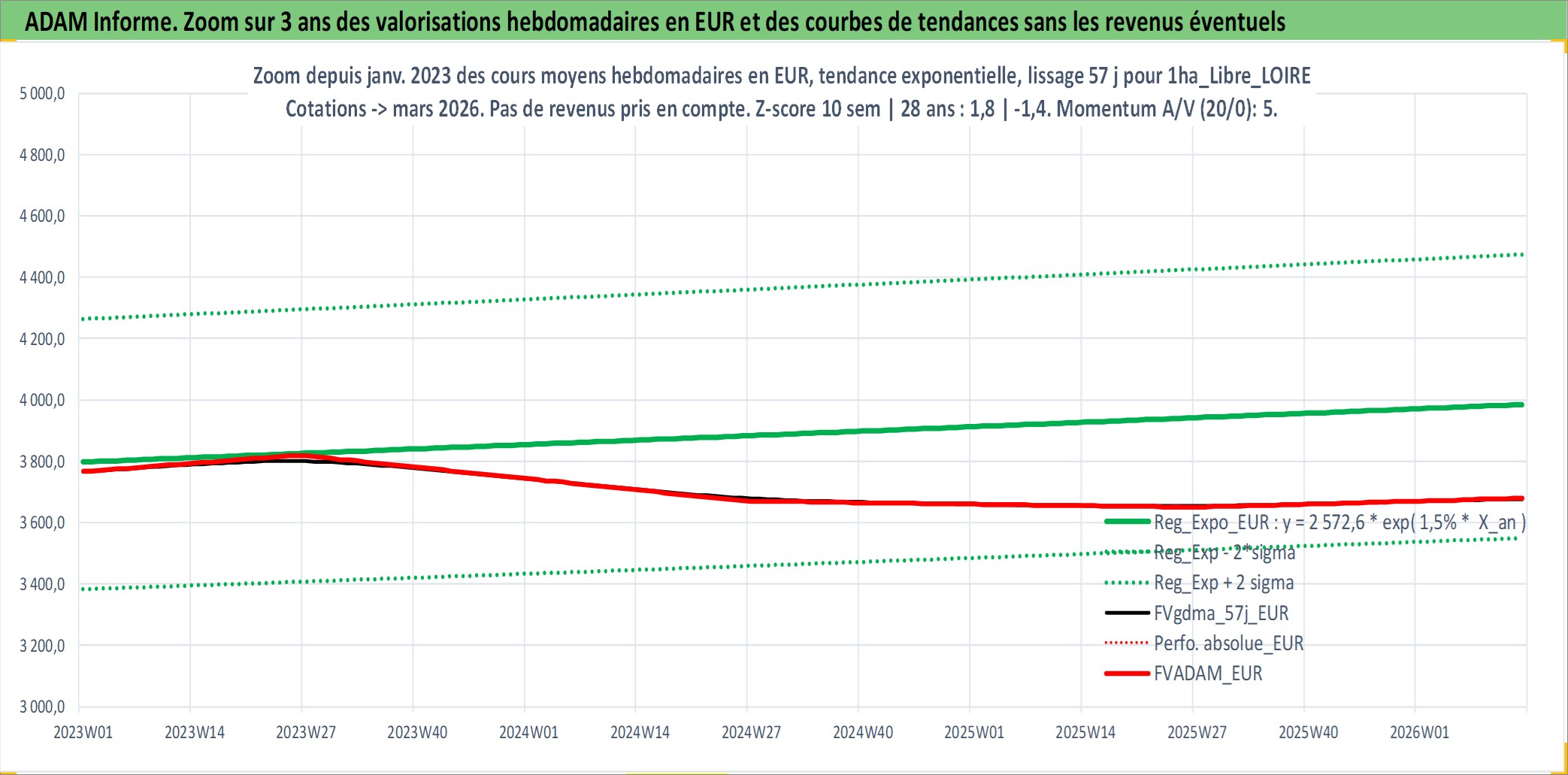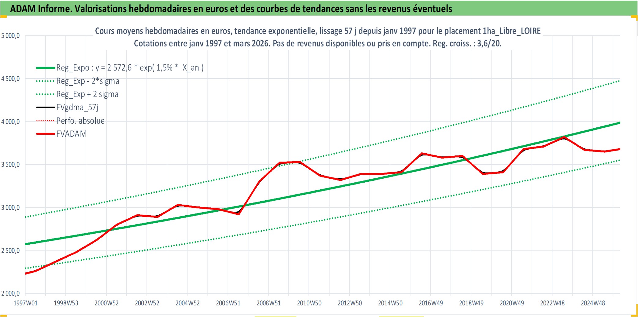 Site dédié aux investisseursPage dédiée sur site financeAnalyse des valorisations hebdomadaires de l'actif 1ha_Libre_LOIRE. Cet actif est cote en EUR. Les valorisations couvrent les semaines 1997W01 a 2026W13. Les fermages de ce bien foncier sont pris egaux a 2,5% annuels de la valeur venale du bien.