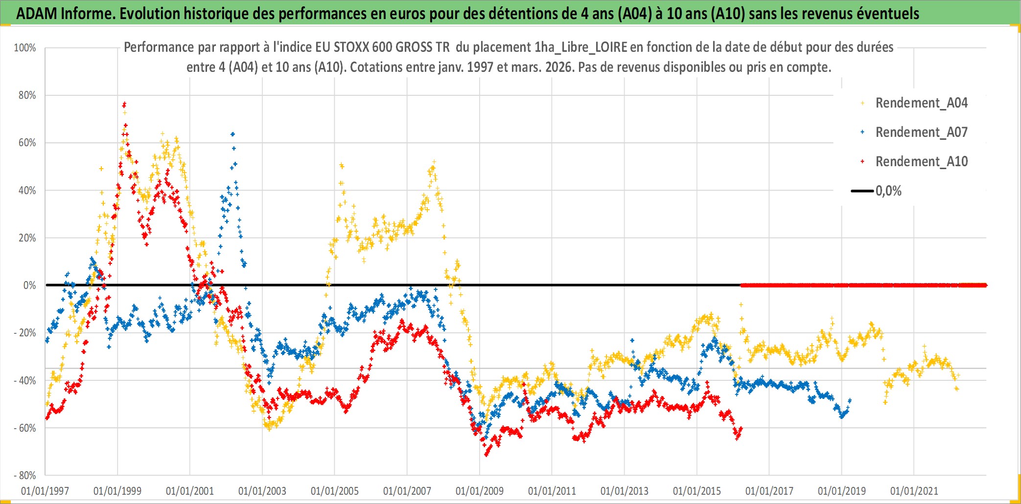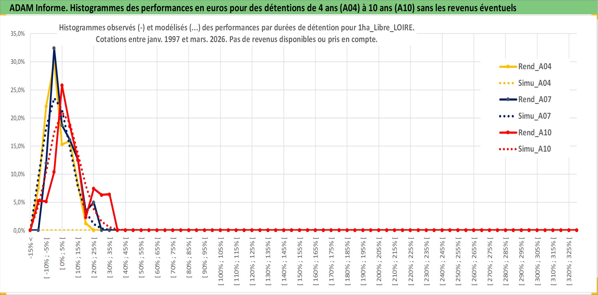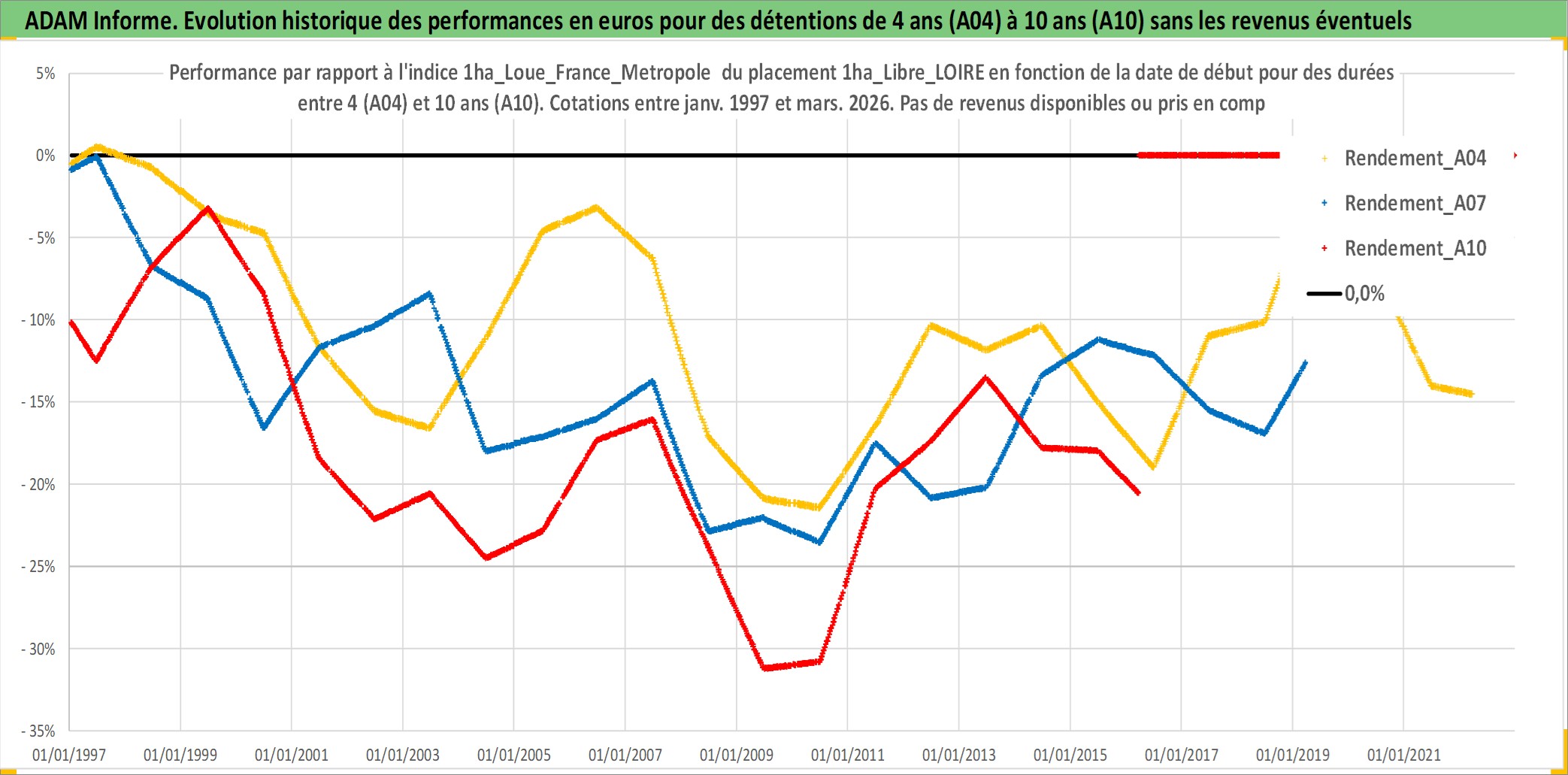 Site dédié aux investisseursPage dédiée sur site financeAnalyse des valorisations hebdomadaires de l'actif 1ha_Libre_LOIRE. Cet actif est cote en EUR. Les valorisations couvrent les semaines 1997W01 a 2026W13. Les fermages de ce bien foncier sont pris egaux a 2,5% annuels de la valeur venale du bien.
