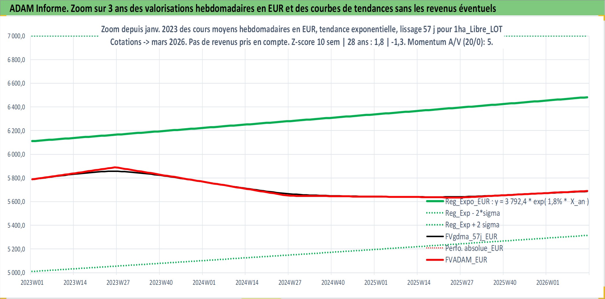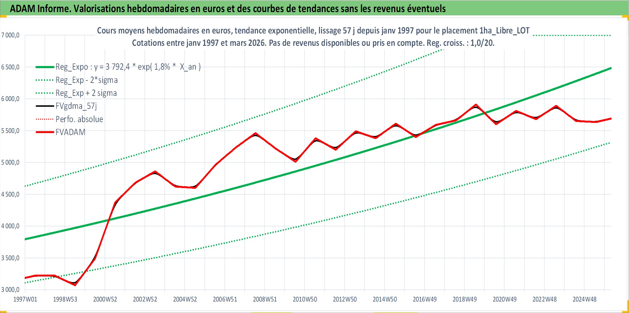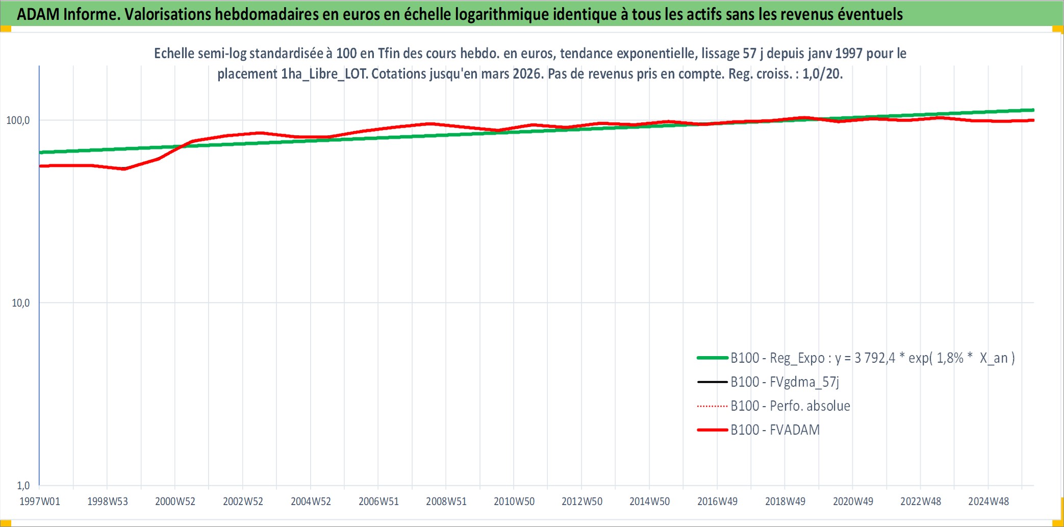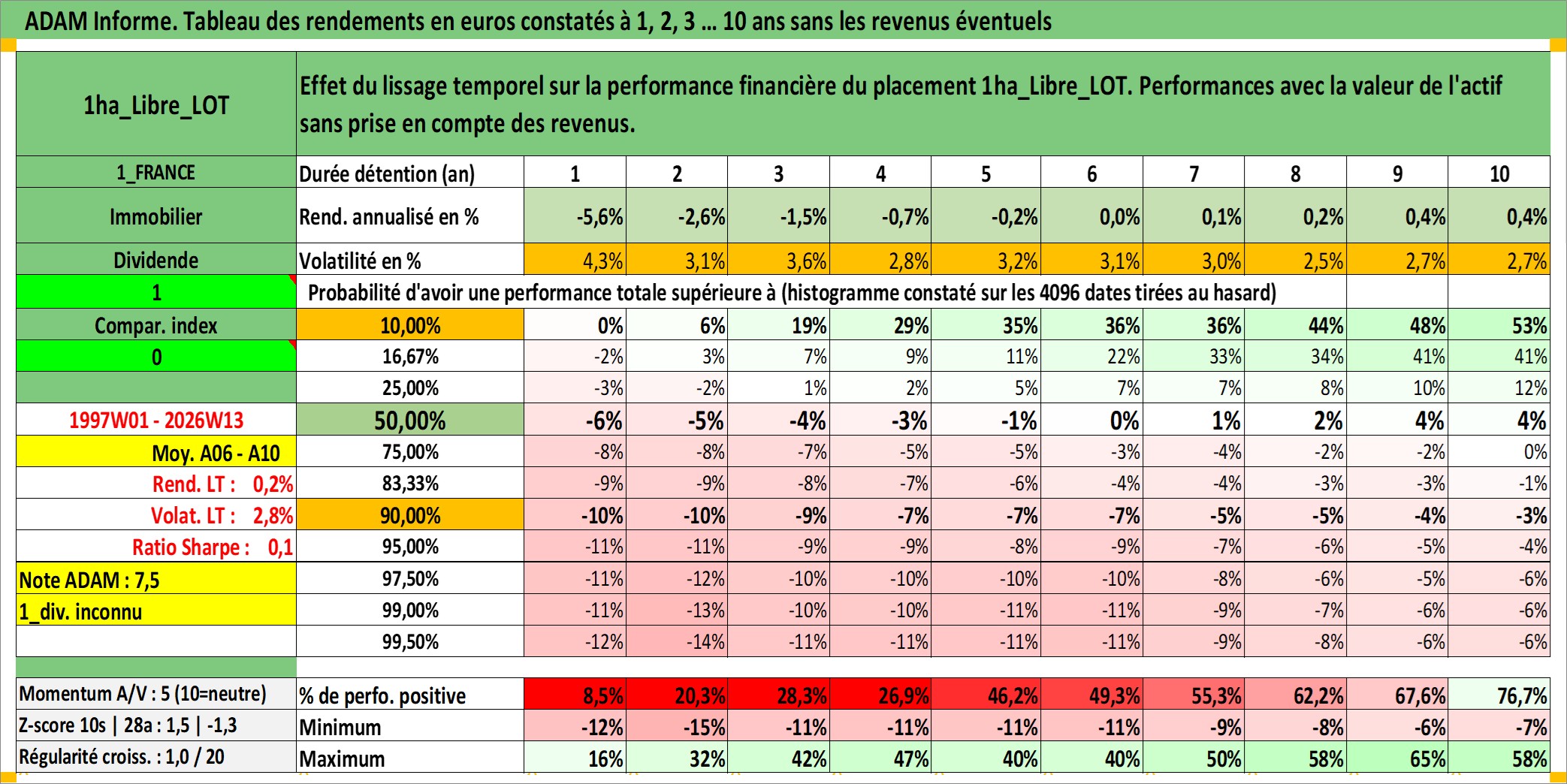 Site dédié aux investisseursPage dédiée sur site financeAnalyse des valorisations hebdomadaires de l'actif 1ha_Libre_LOT. Cet actif est cote en EUR. Les valorisations couvrent les semaines 1997W01 a 2026W13. Les fermages de ce bien foncier sont pris egaux a 2,5% annuels de la valeur venale du bien.