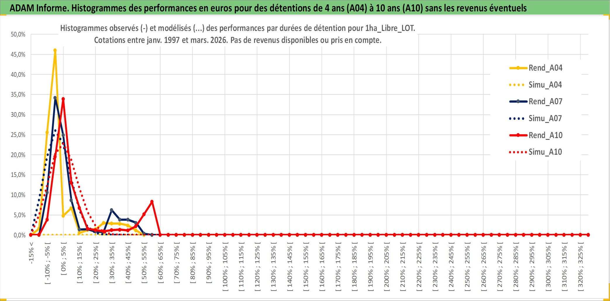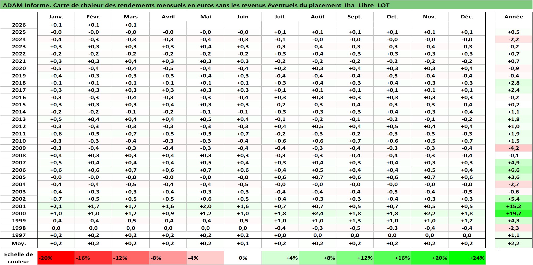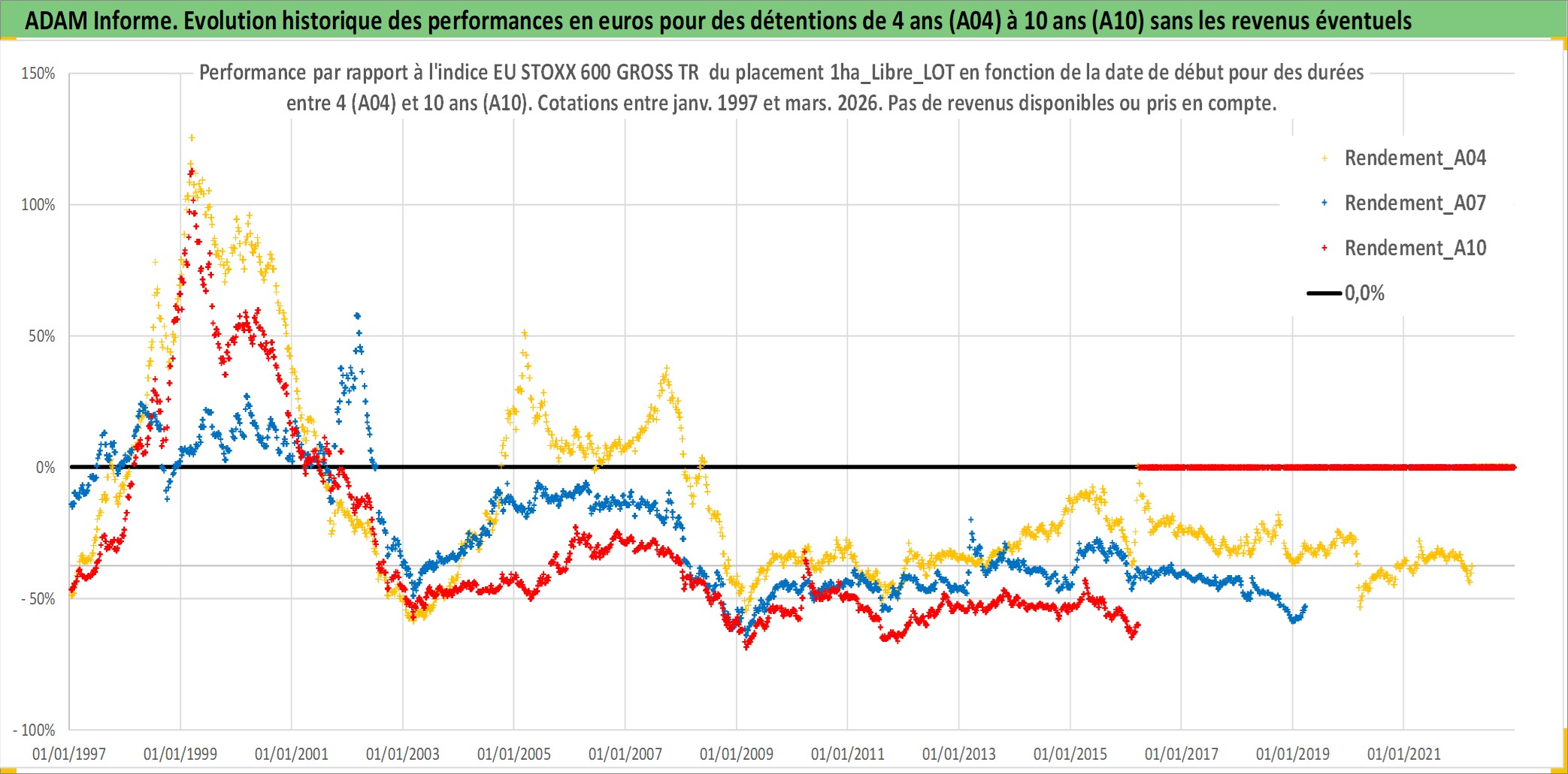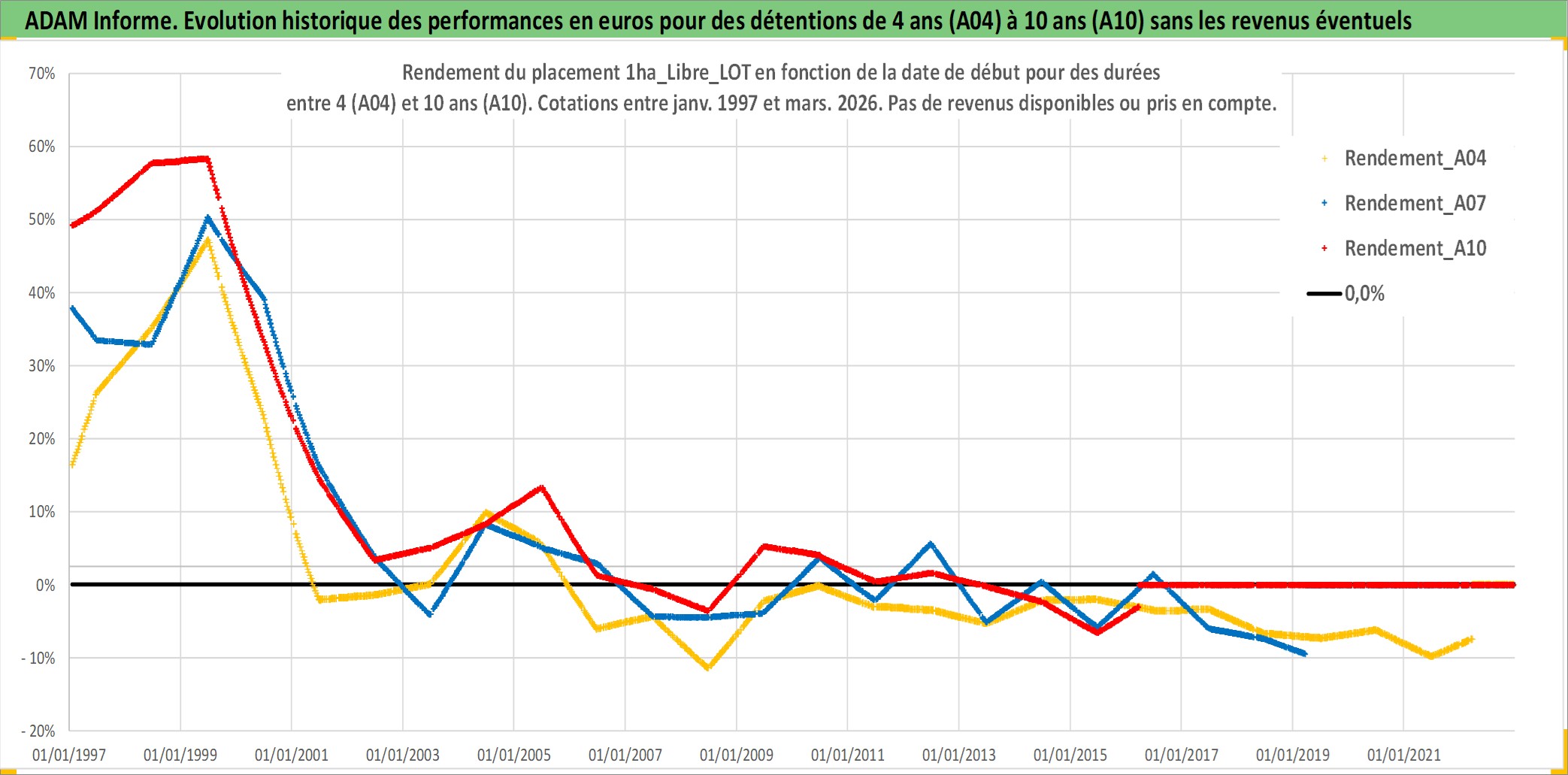 Site dédié aux investisseursPage dédiée sur site financeAnalyse des valorisations hebdomadaires de l'actif 1ha_Libre_LOT. Cet actif est cote en EUR. Les valorisations couvrent les semaines 1997W01 a 2026W13. Les fermages de ce bien foncier sont pris egaux a 2,5% annuels de la valeur venale du bien.