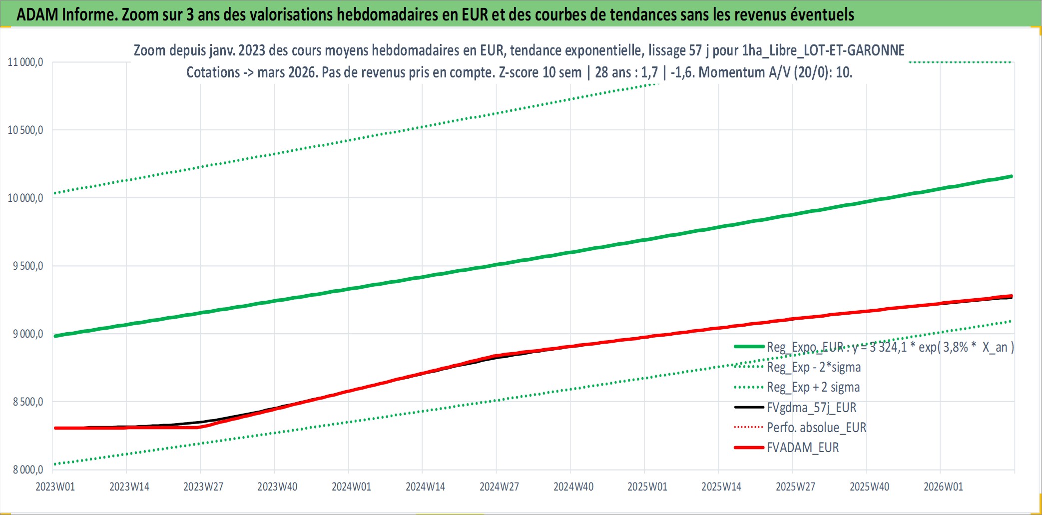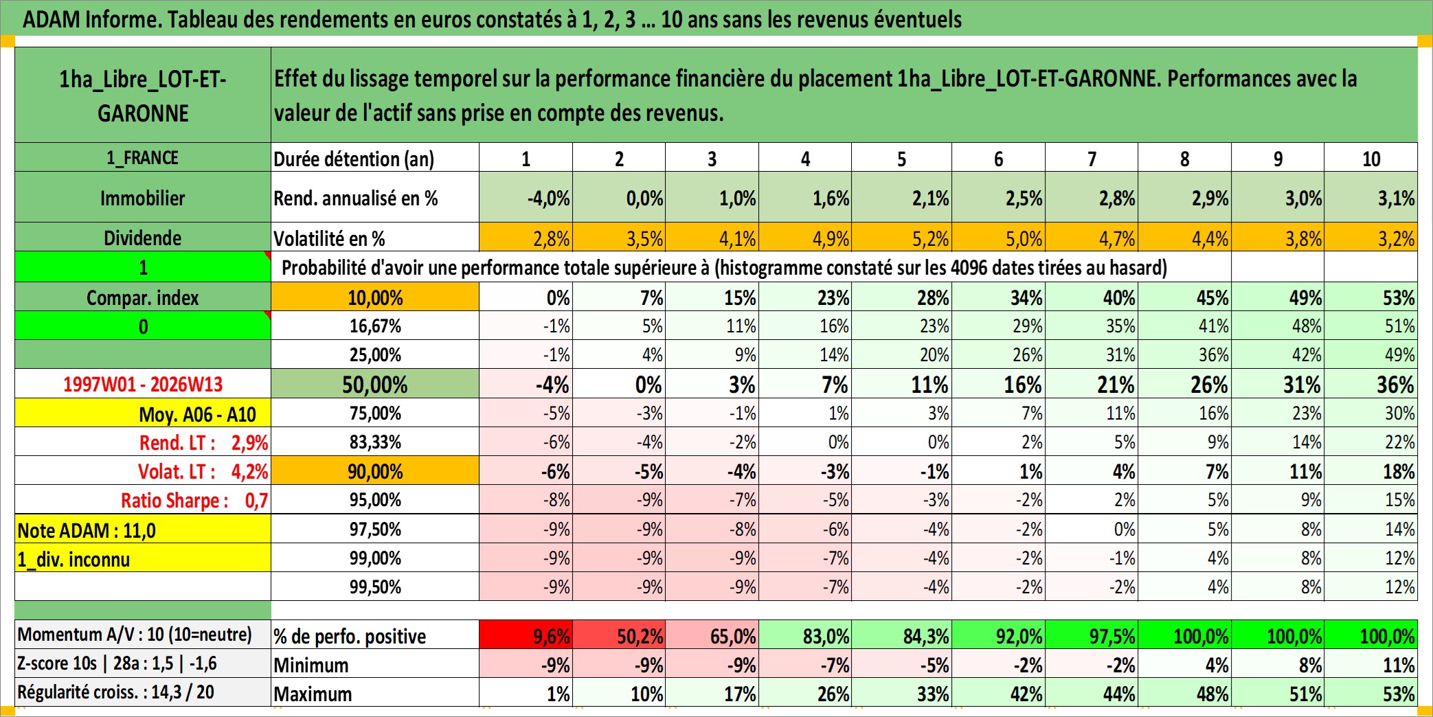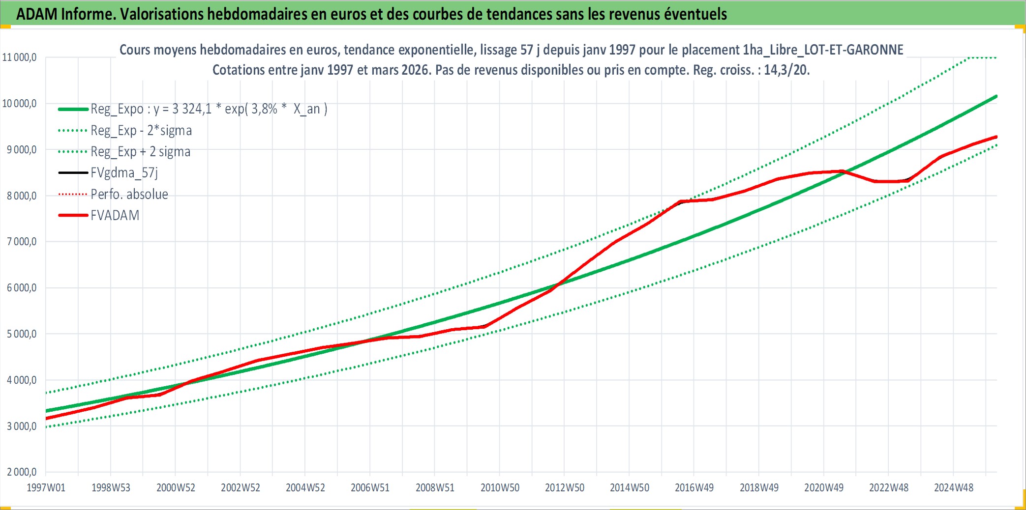 Site dédié aux investisseursPage dédiée sur site financeAnalyse des valorisations hebdomadaires de l'actif 1ha_Libre_LOT-ET-GARONNE. Cet actif est cote en EUR. Les valorisations couvrent les semaines 1997W01 a 2026W13. Les fermages de ce bien foncier sont pris egaux a 2,5% annuels de la valeur venale du bien.