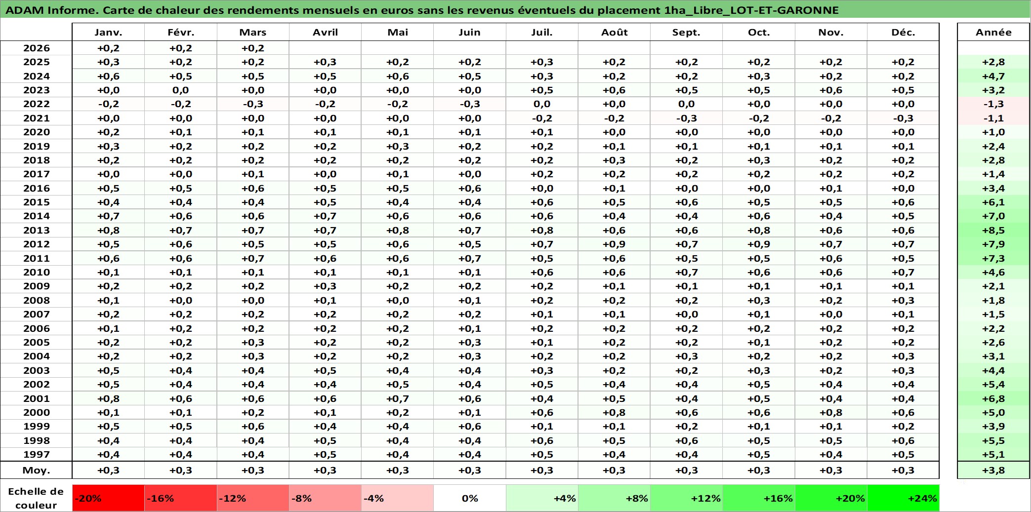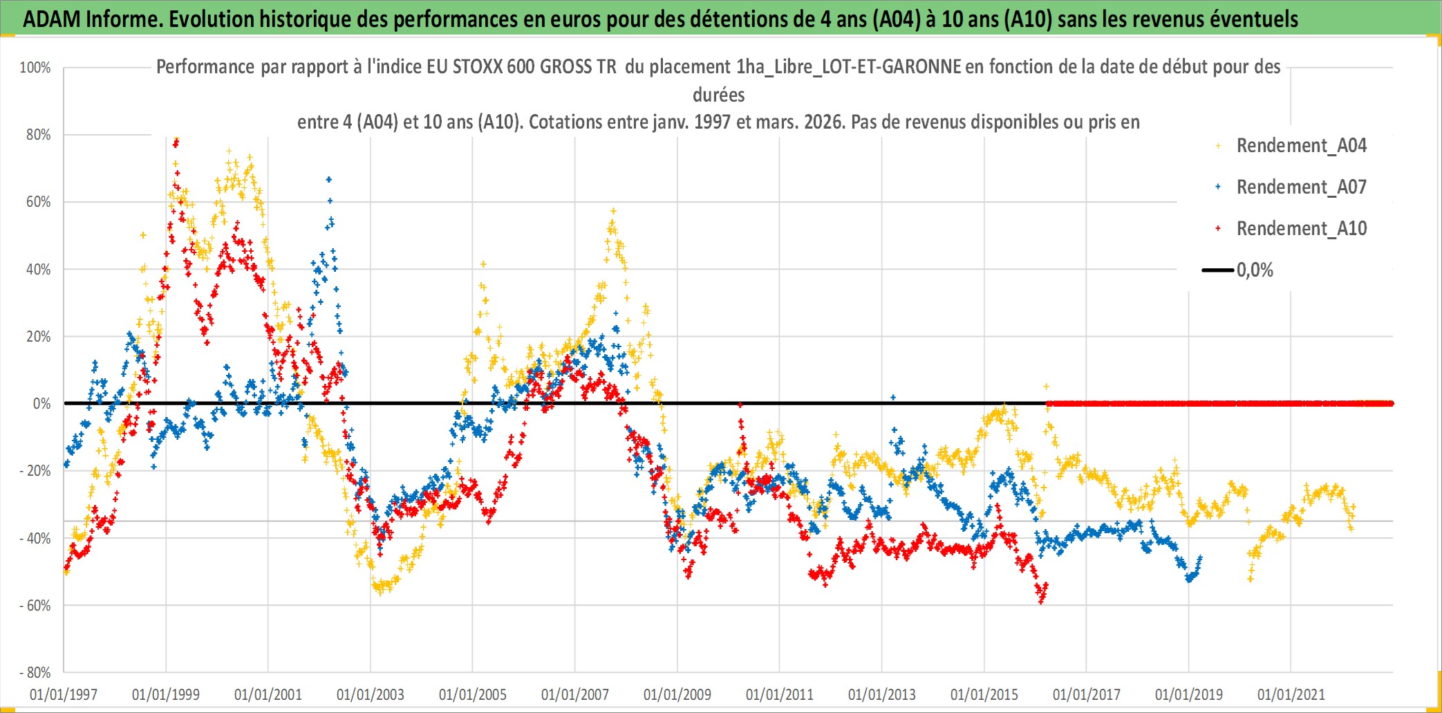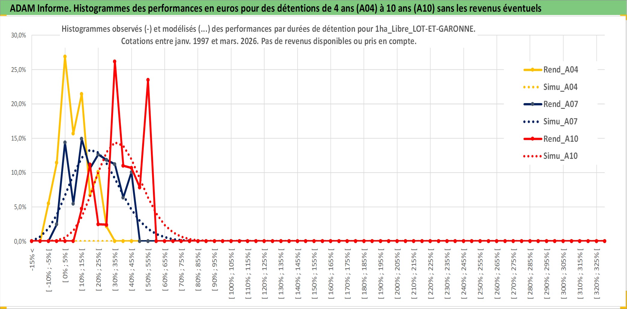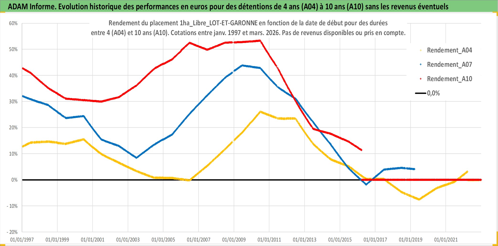 Site dédié aux investisseursPage dédiée sur site financeAnalyse des valorisations hebdomadaires de l'actif 1ha_Libre_LOT-ET-GARONNE. Cet actif est cote en EUR. Les valorisations couvrent les semaines 1997W01 a 2026W13. Les fermages de ce bien foncier sont pris egaux a 2,5% annuels de la valeur venale du bien.
