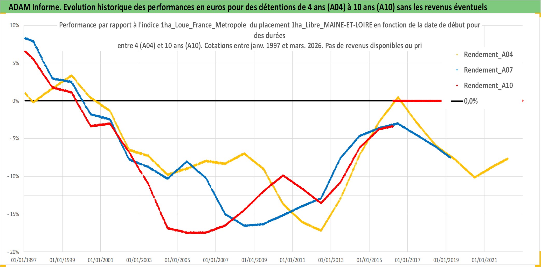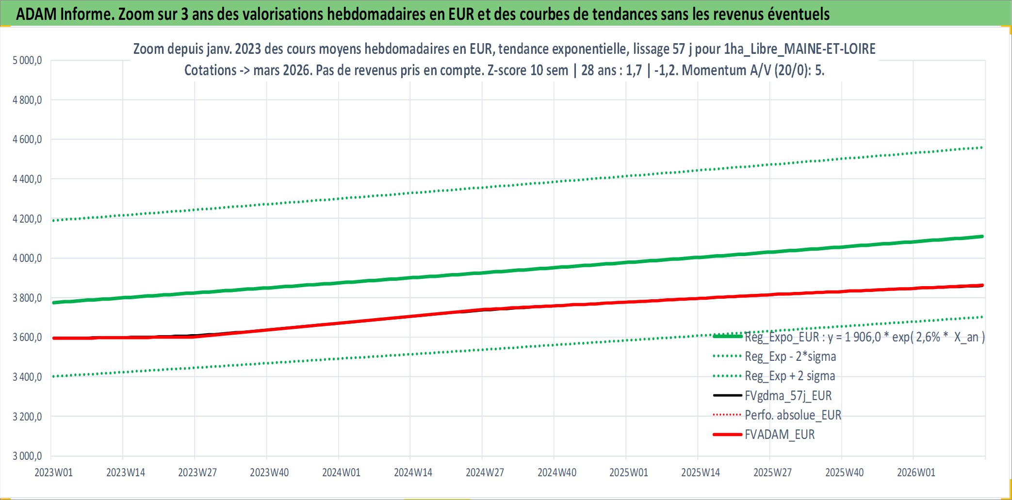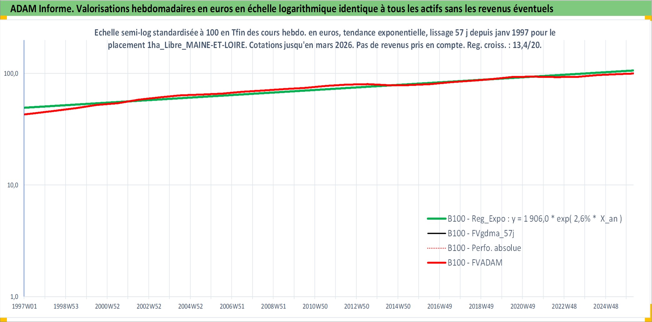 Site dédié aux investisseursPage dédiée sur site financeAnalyse des valorisations hebdomadaires de l'actif 1ha_Libre_MAINE-ET-LOIRE. Cet actif est cote en EUR. Les valorisations couvrent les semaines 1997W01 a 2026W13. Les fermages de ce bien foncier sont pris egaux a 2,5% annuels de la valeur venale du bien.