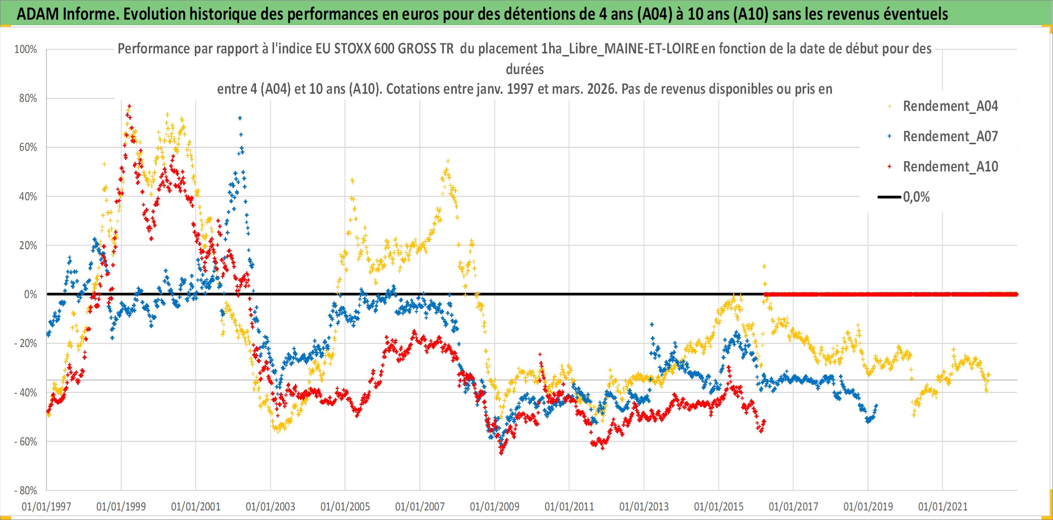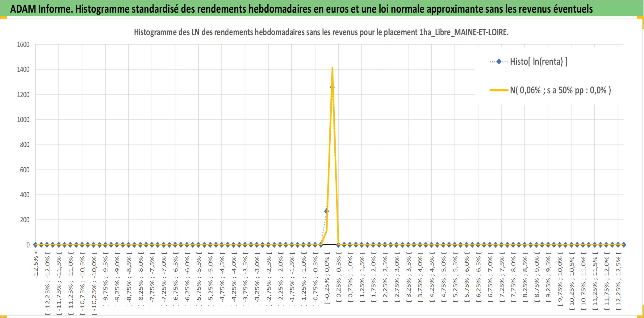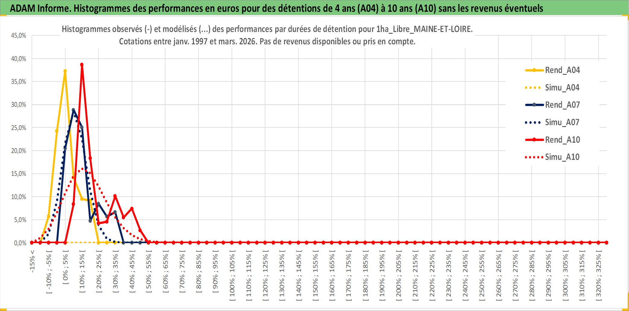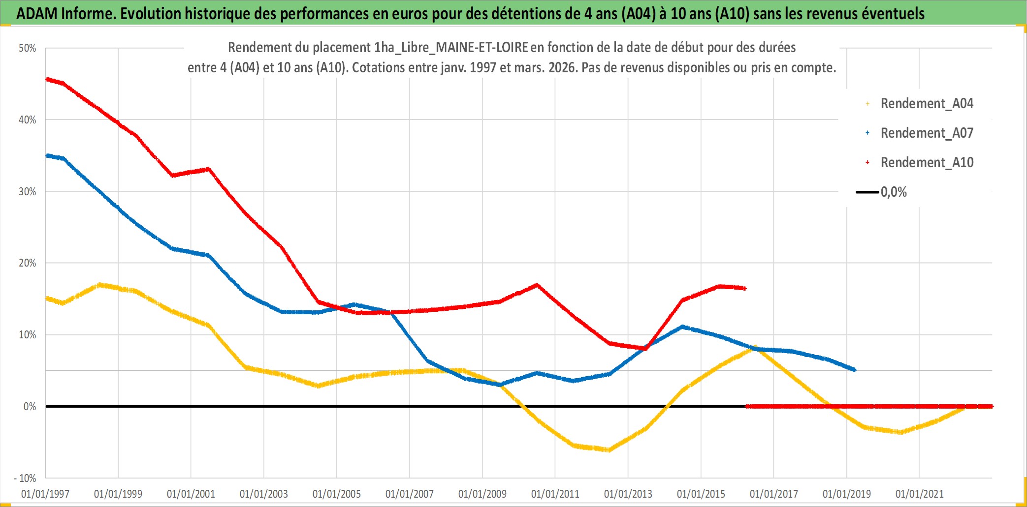 Site dédié aux investisseursPage dédiée sur site financeAnalyse des valorisations hebdomadaires de l'actif 1ha_Libre_MAINE-ET-LOIRE. Cet actif est cote en EUR. Les valorisations couvrent les semaines 1997W01 a 2026W13. Les fermages de ce bien foncier sont pris egaux a 2,5% annuels de la valeur venale du bien.