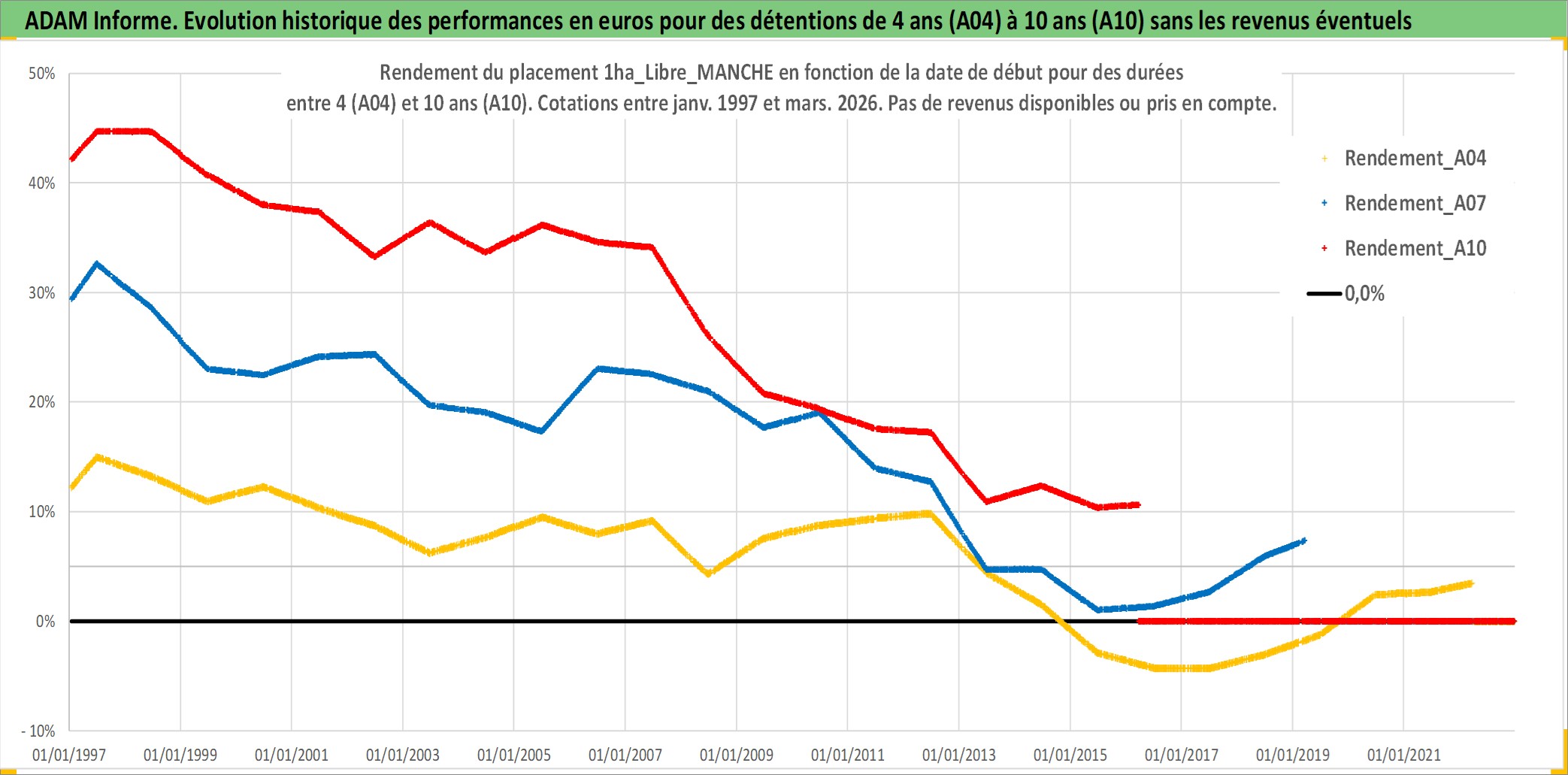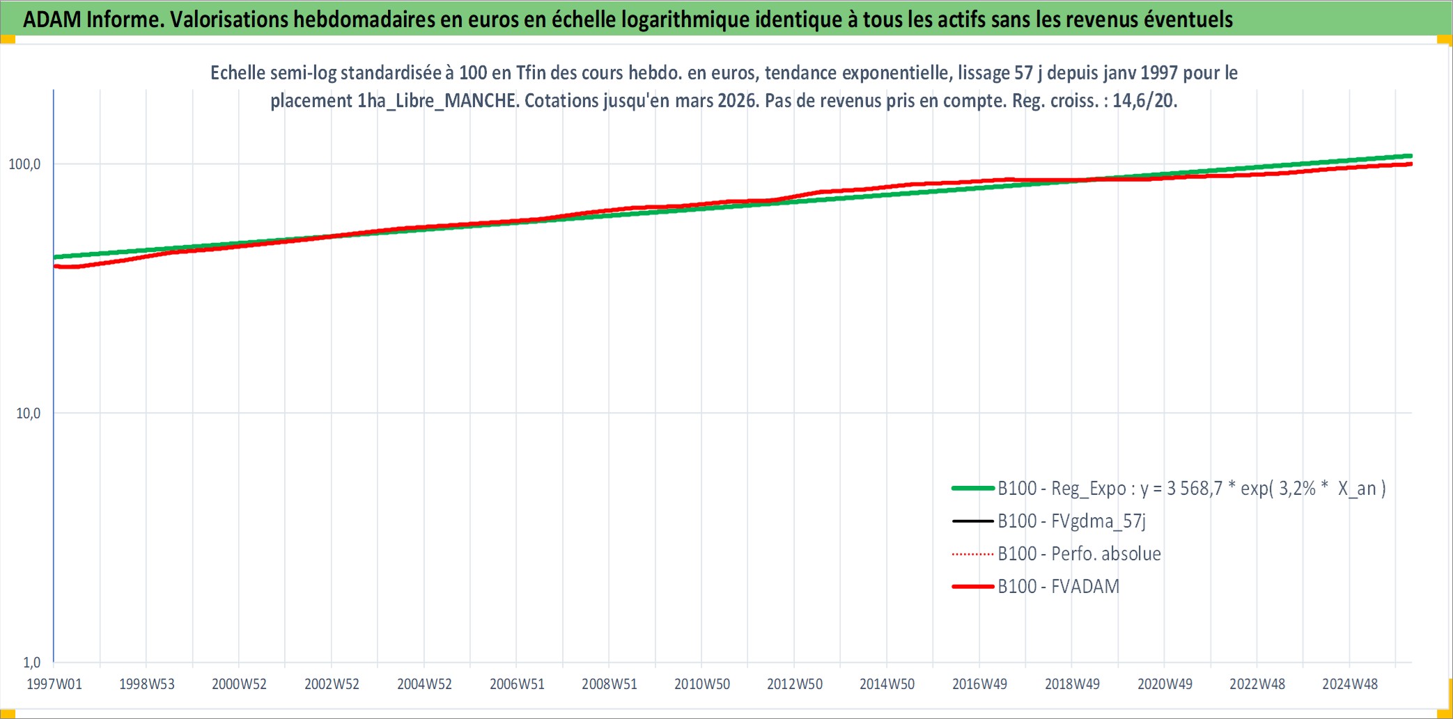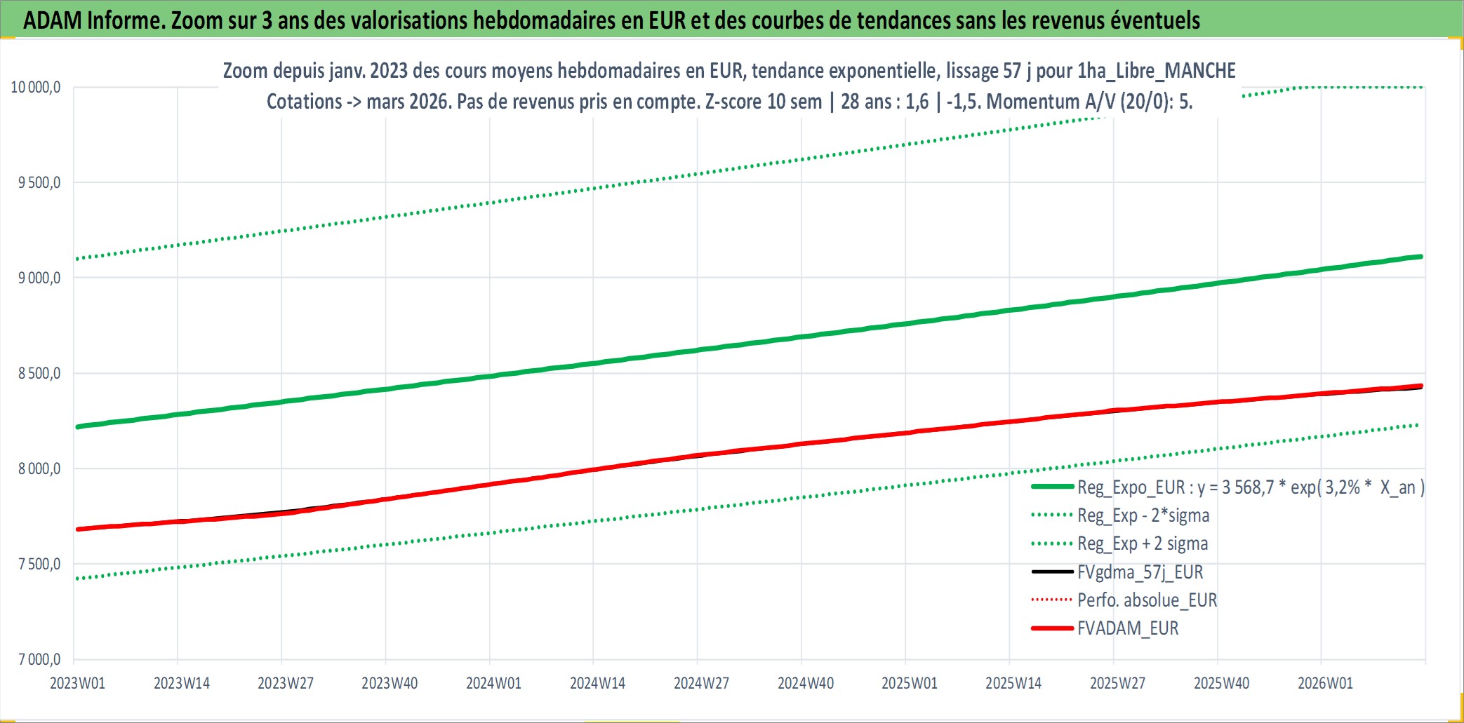 Site dédié aux investisseursPage dédiée sur site financeAnalyse des valorisations hebdomadaires de l'actif 1ha_Libre_MANCHE. Cet actif est cote en EUR. Les valorisations couvrent les semaines 1997W01 a 2026W13. Les fermages de ce bien foncier sont pris egaux a 2,5% annuels de la valeur venale du bien.