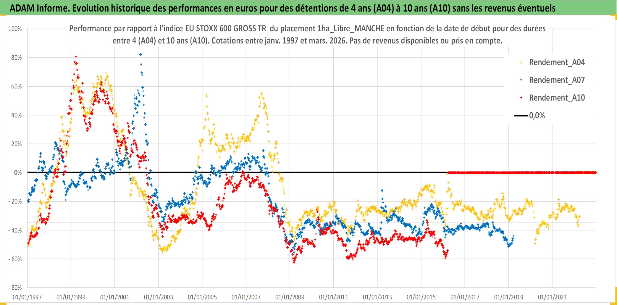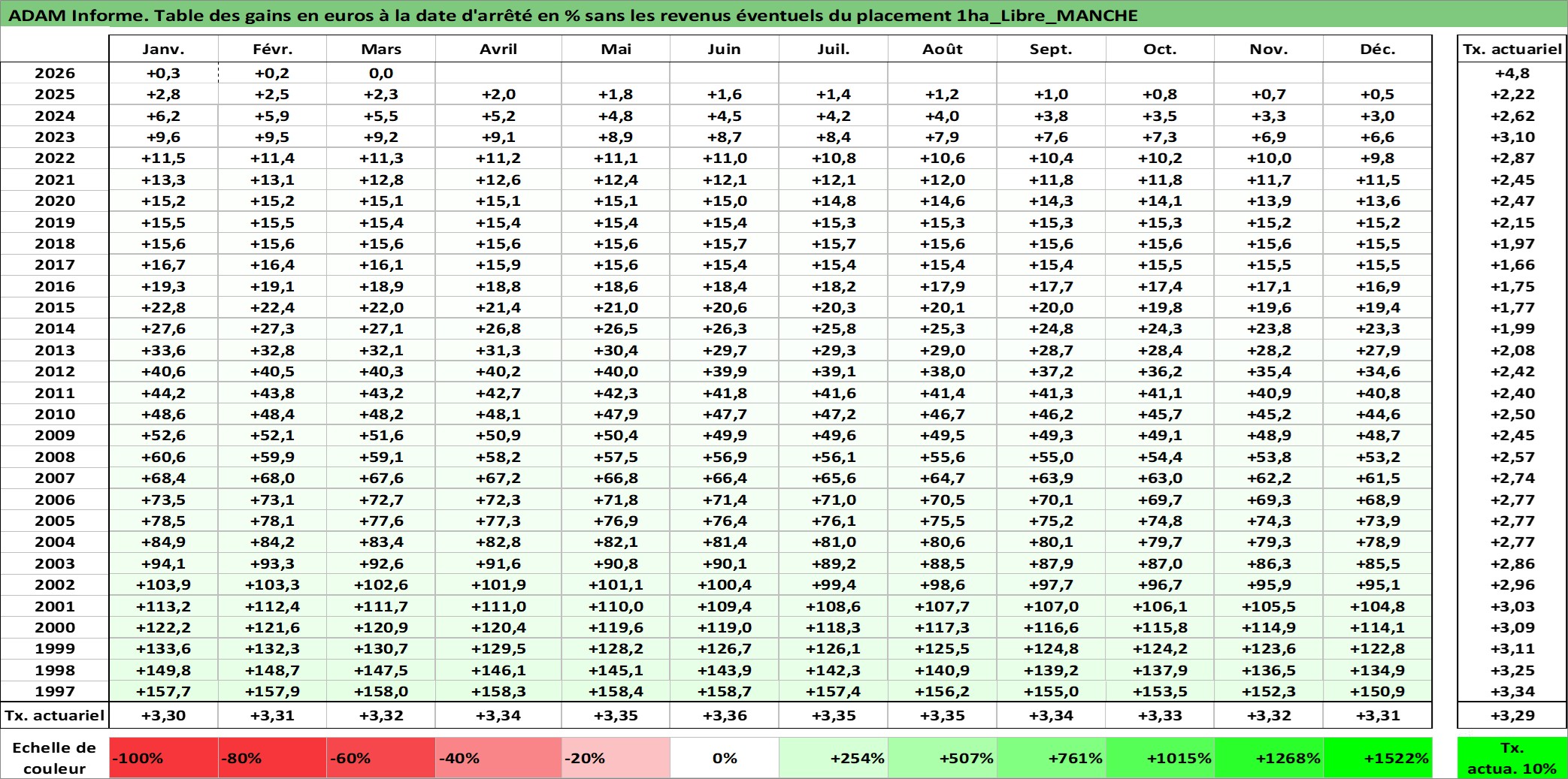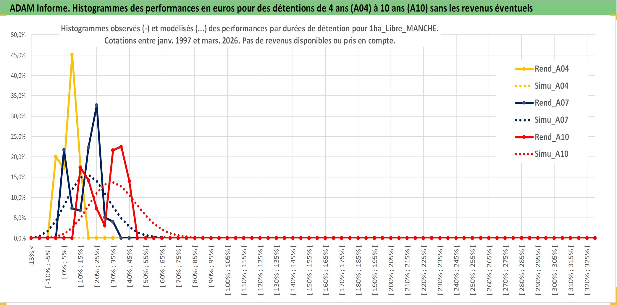 Site dédié aux investisseursPage dédiée sur site financeAnalyse des valorisations hebdomadaires de l'actif 1ha_Libre_MANCHE. Cet actif est cote en EUR. Les valorisations couvrent les semaines 1997W01 a 2026W13. Les fermages de ce bien foncier sont pris egaux a 2,5% annuels de la valeur venale du bien.