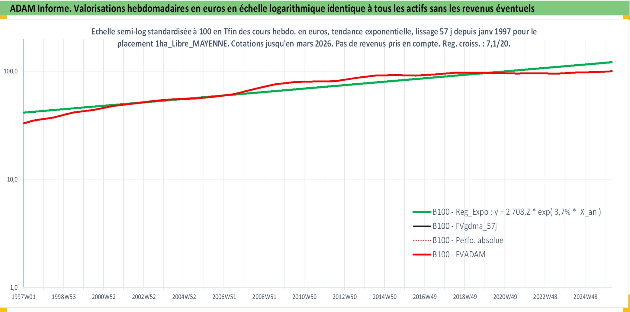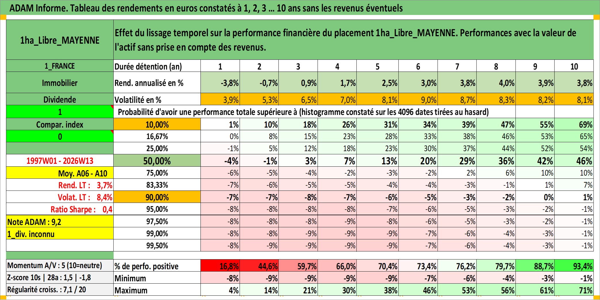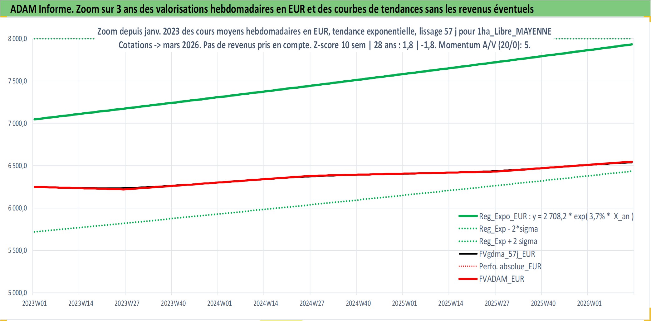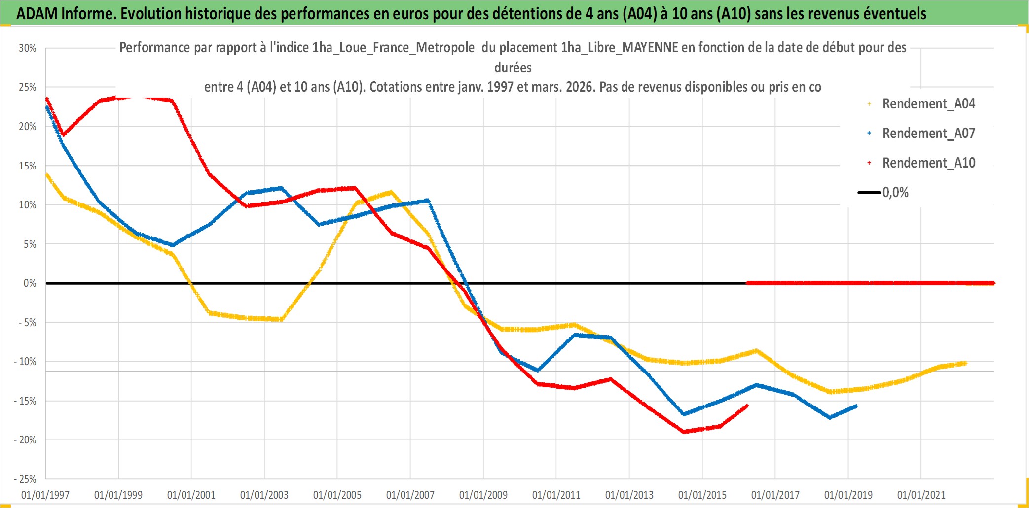 Site dédié aux investisseursPage dédiée sur site financeAnalyse des valorisations hebdomadaires de l'actif 1ha_Libre_MAYENNE. Cet actif est cote en EUR. Les valorisations couvrent les semaines 1997W01 a 2026W13. Les fermages de ce bien foncier sont pris egaux a 2,5% annuels de la valeur venale du bien.