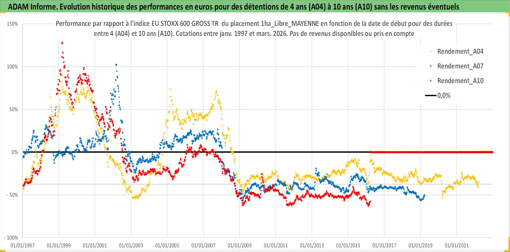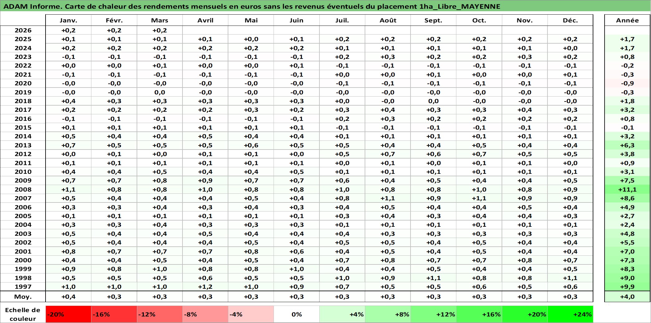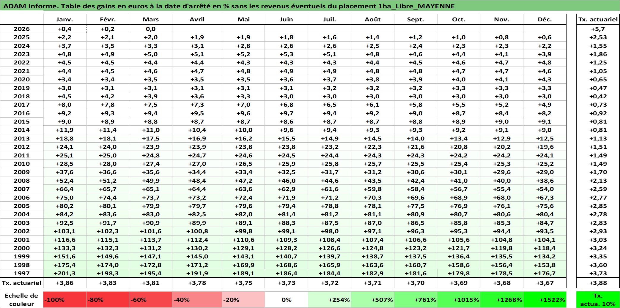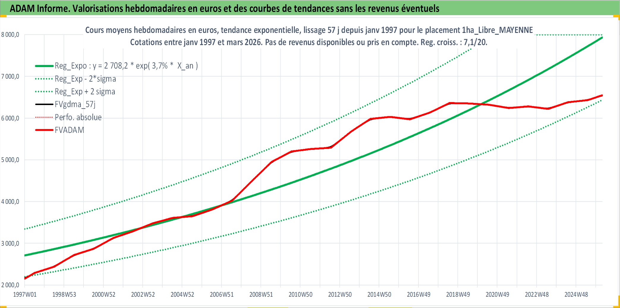 Site dédié aux investisseursPage dédiée sur site financeAnalyse des valorisations hebdomadaires de l'actif 1ha_Libre_MAYENNE. Cet actif est cote en EUR. Les valorisations couvrent les semaines 1997W01 a 2026W13. Les fermages de ce bien foncier sont pris egaux a 2,5% annuels de la valeur venale du bien.