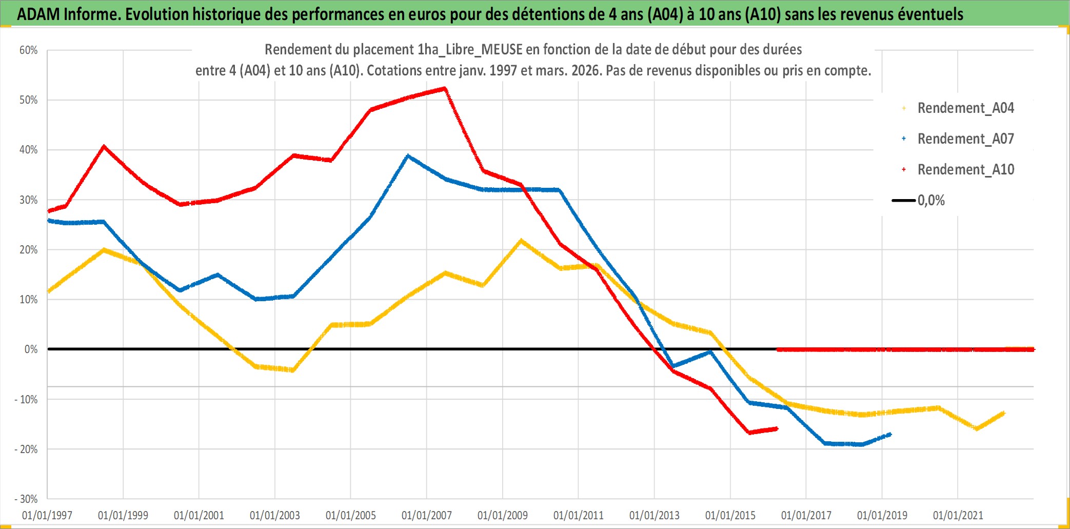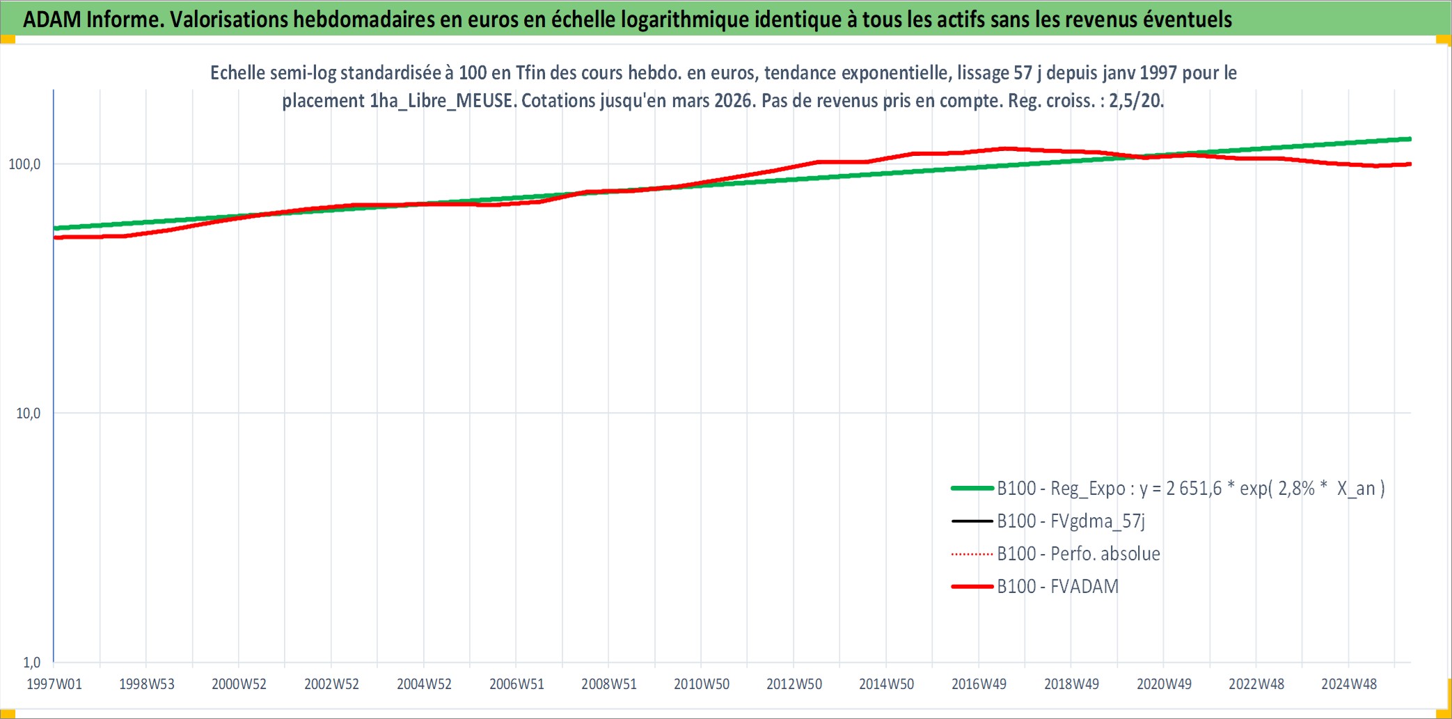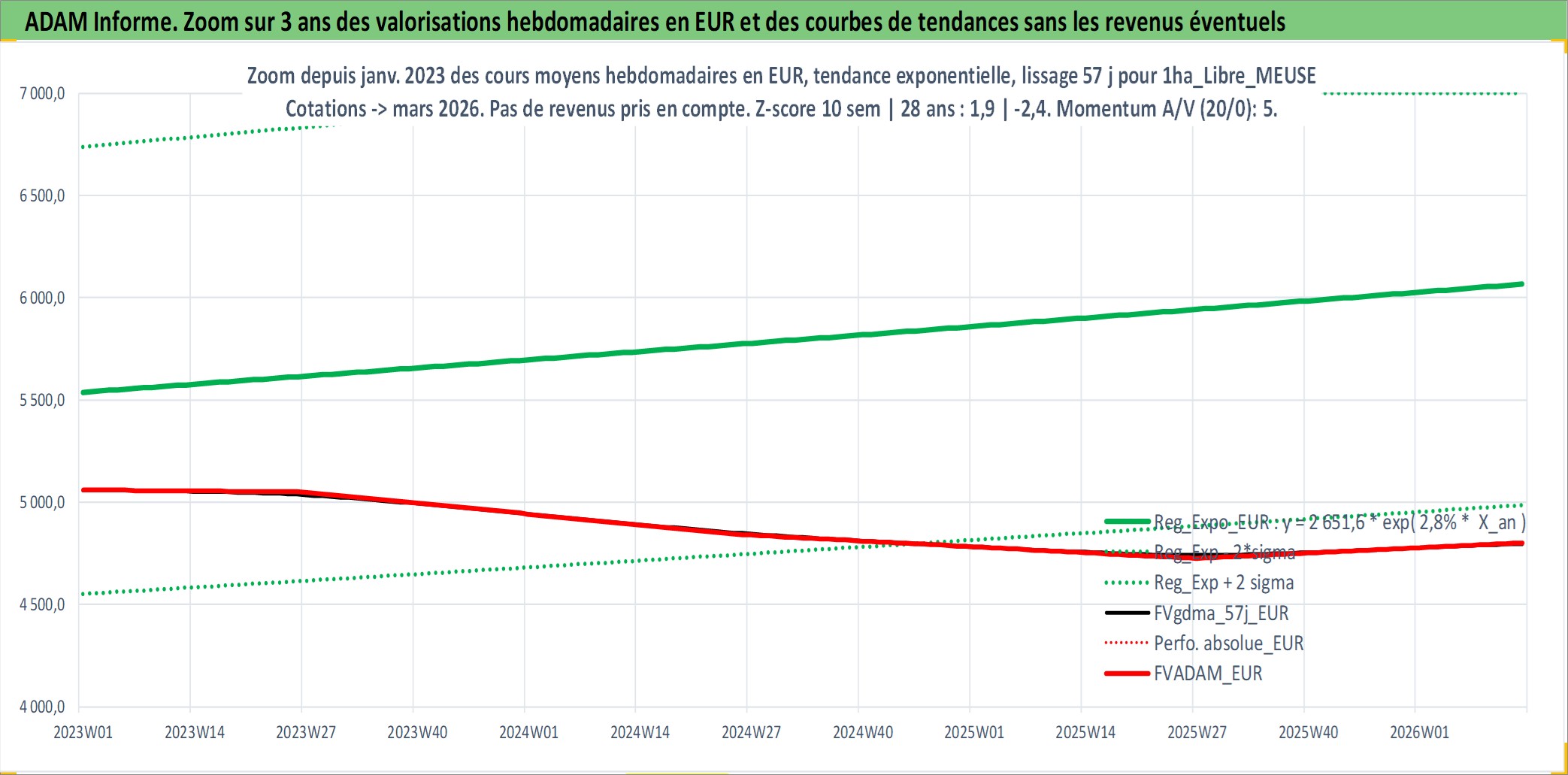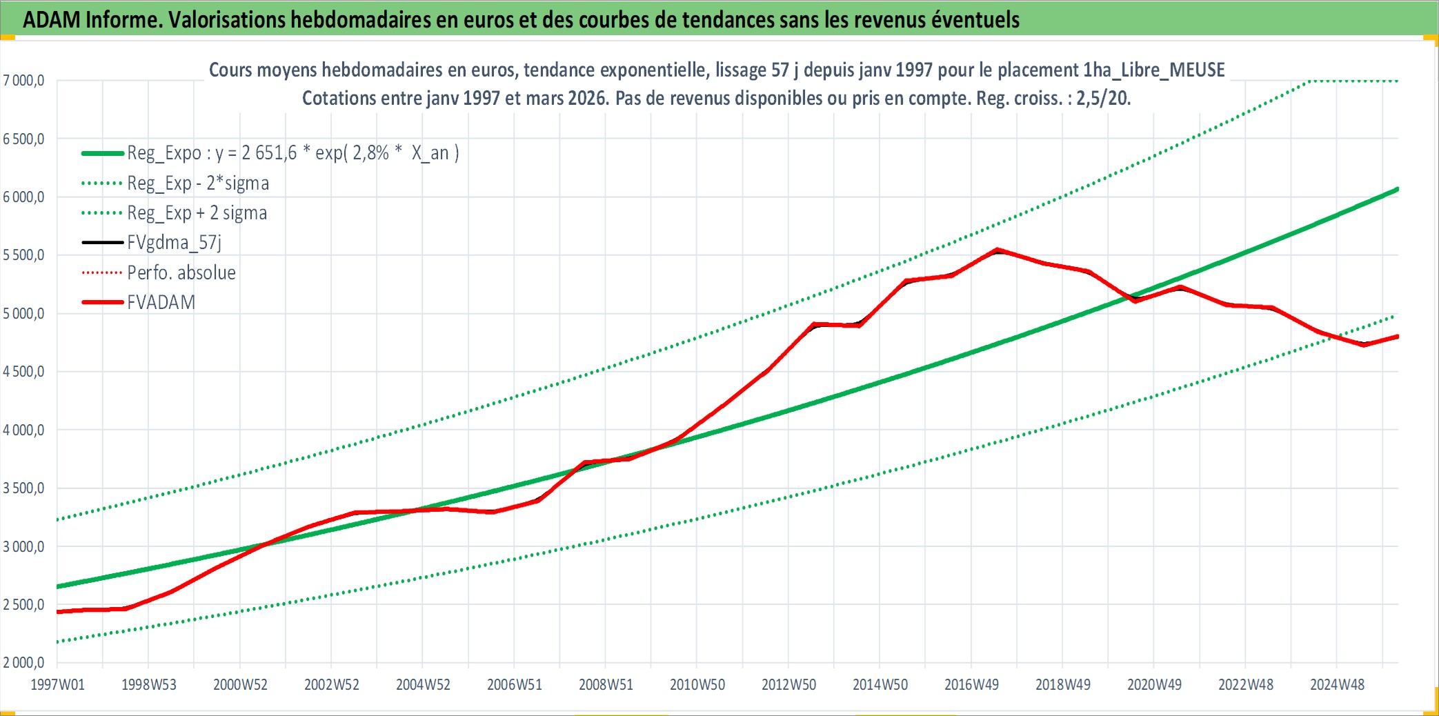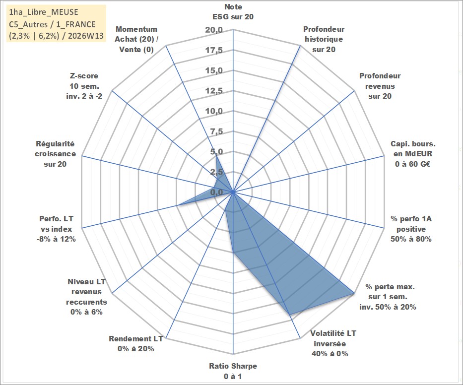 Site dédié aux investisseursPage dédiée sur site financeAnalyse des valorisations hebdomadaires de l'actif 1ha_Libre_MEUSE. Cet actif est cote en EUR. Les valorisations couvrent les semaines 1997W01 a 2026W13. Les fermages de ce bien foncier sont pris egaux a 2,5% annuels de la valeur venale du bien.
