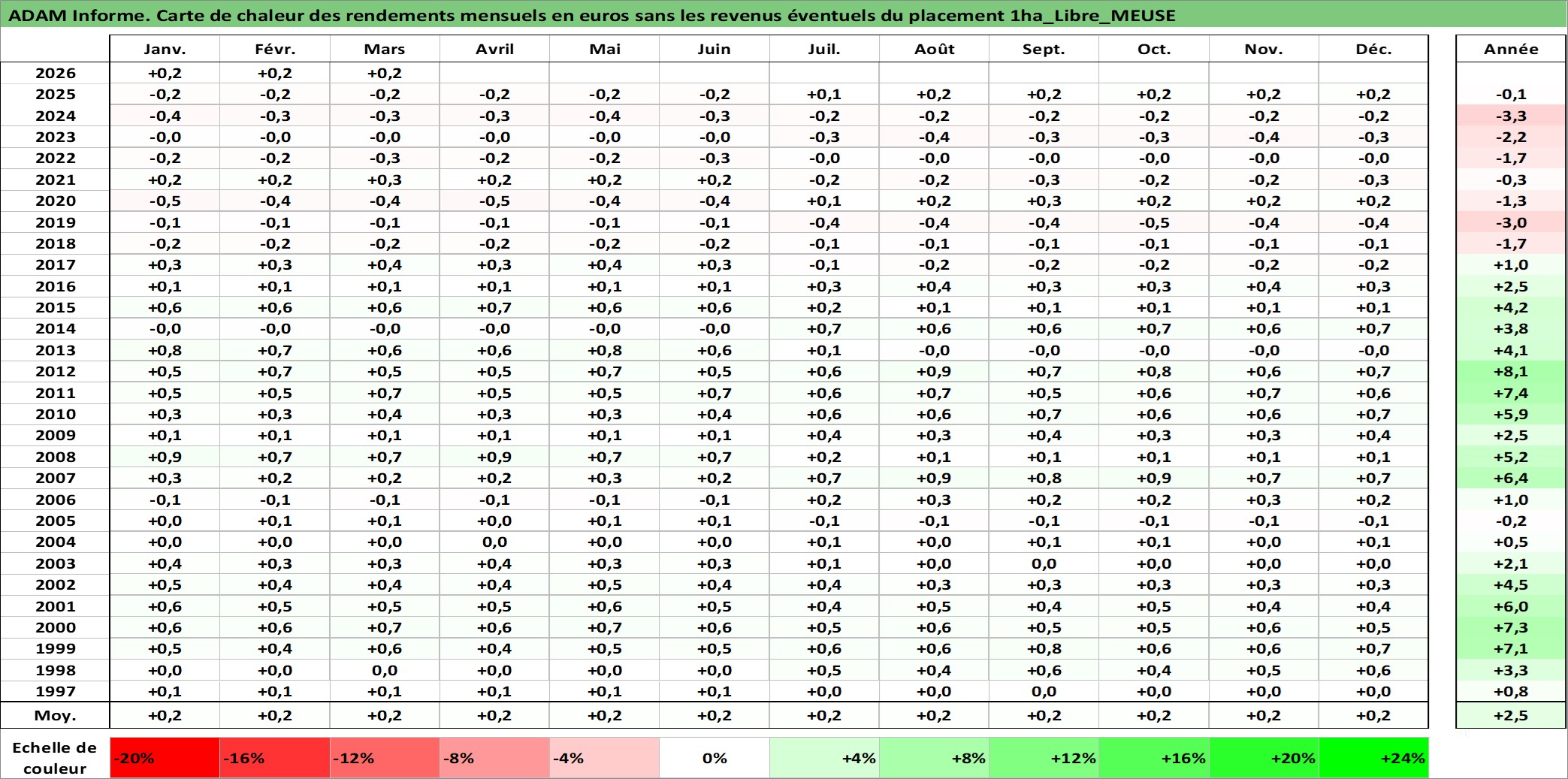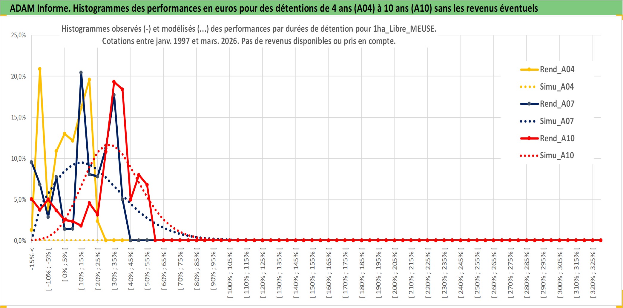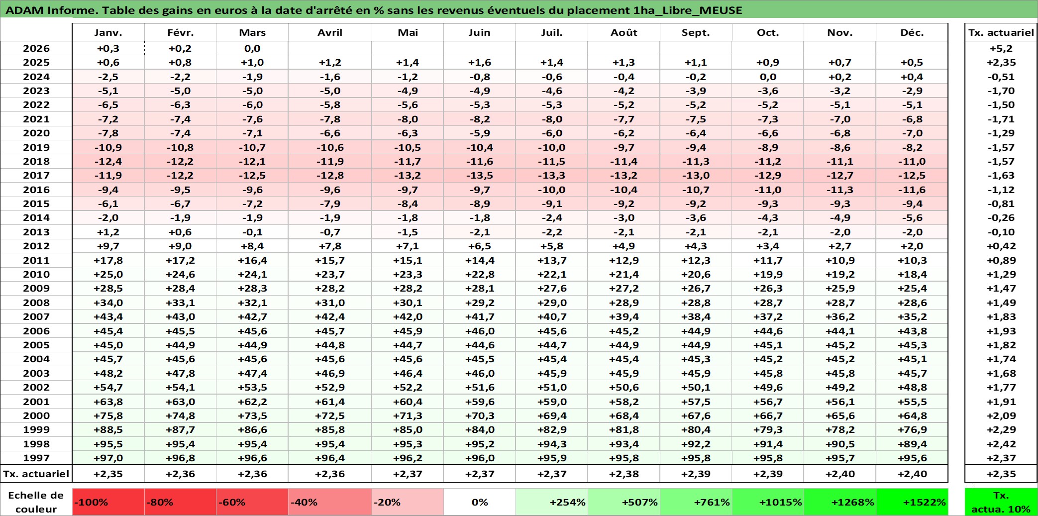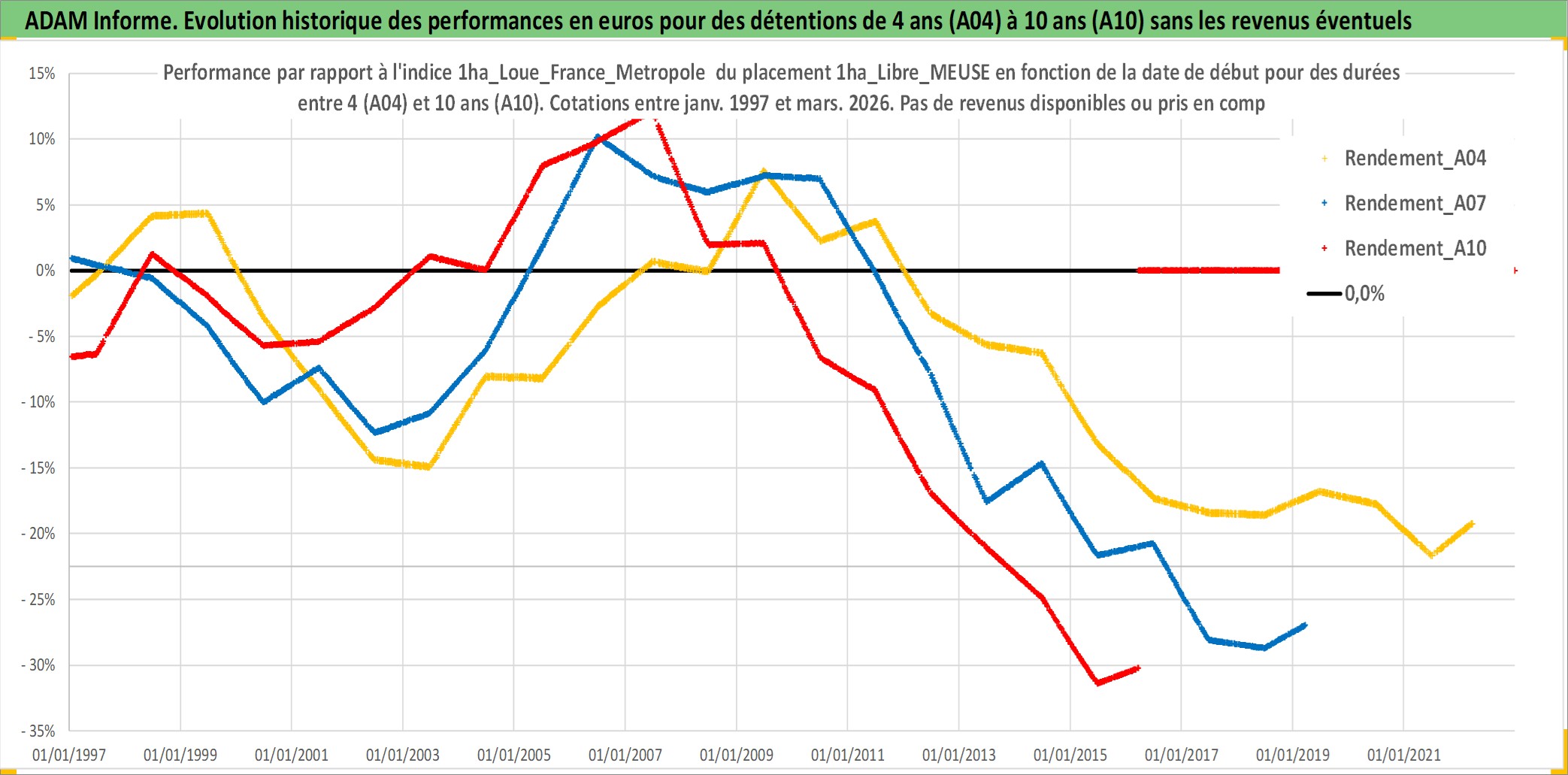 Site dédié aux investisseursPage dédiée sur site financeAnalyse des valorisations hebdomadaires de l'actif 1ha_Libre_MEUSE. Cet actif est cote en EUR. Les valorisations couvrent les semaines 1997W01 a 2026W13. Les fermages de ce bien foncier sont pris egaux a 2,5% annuels de la valeur venale du bien.