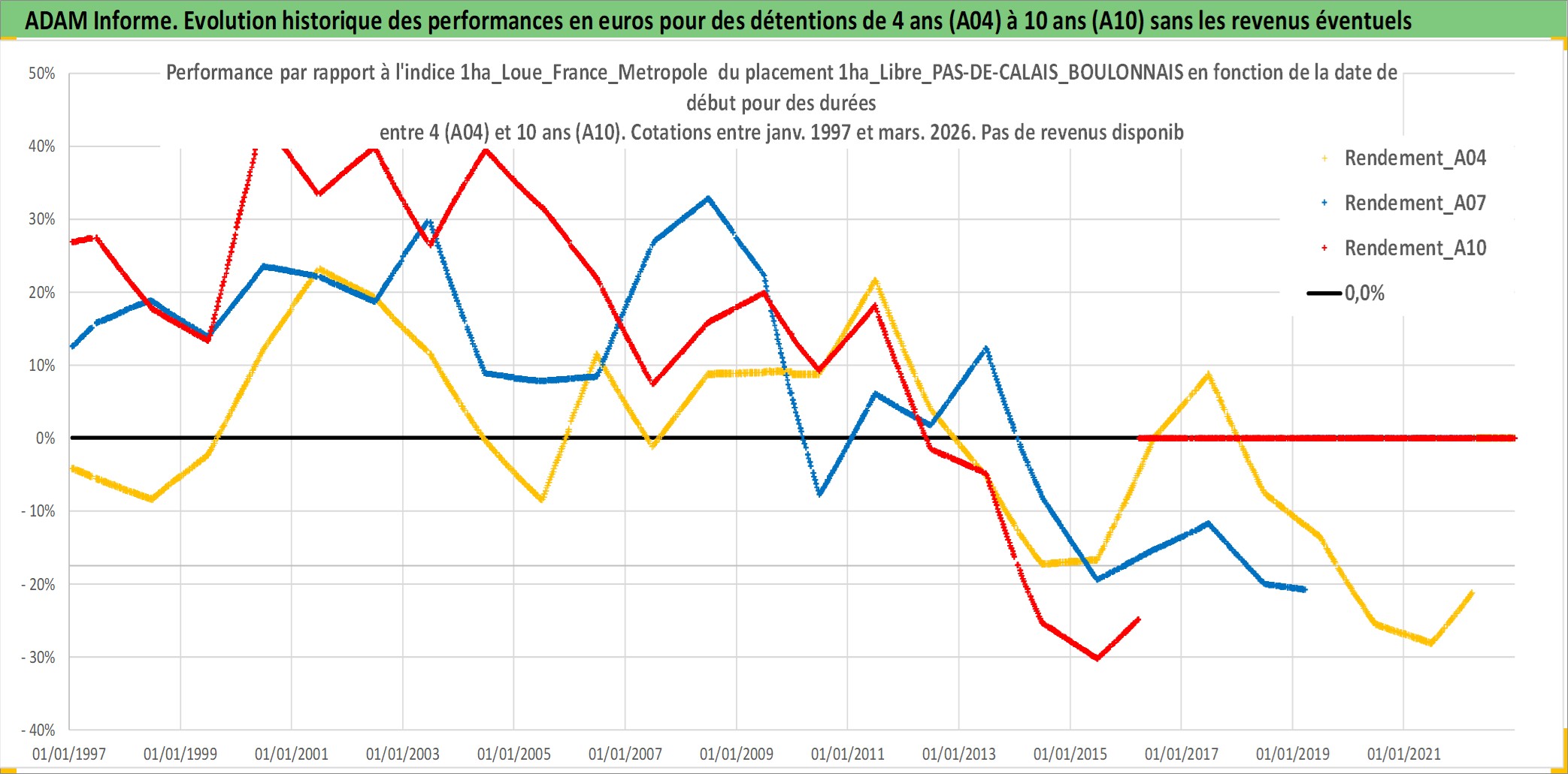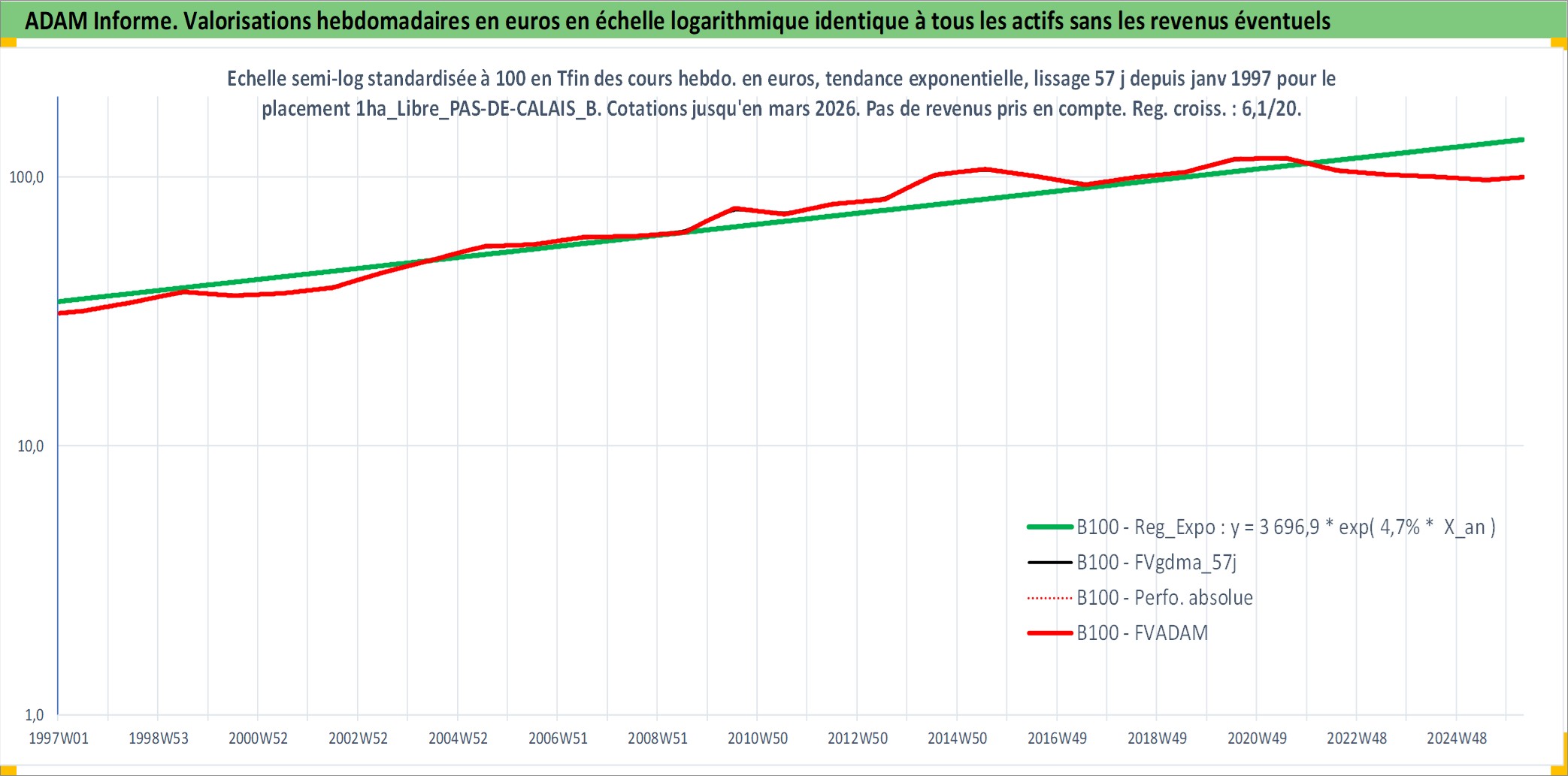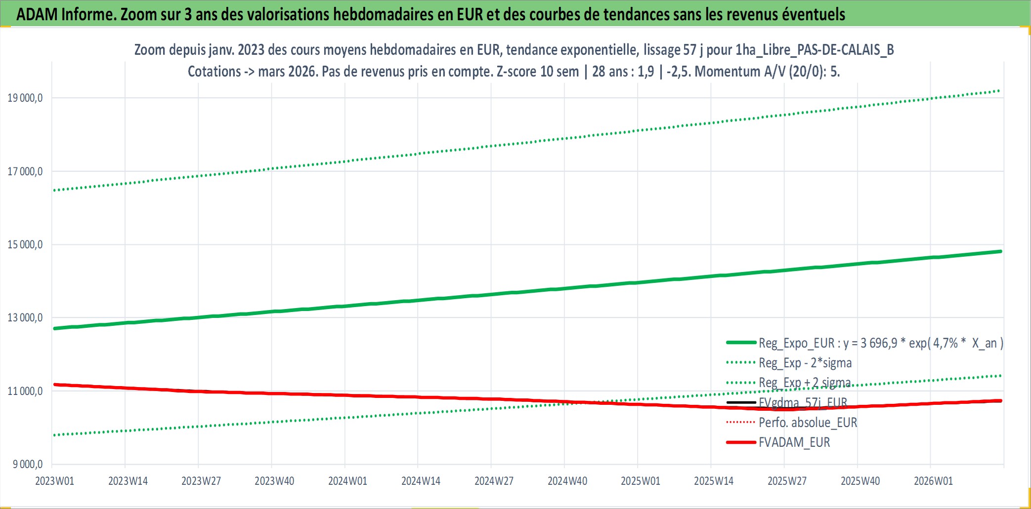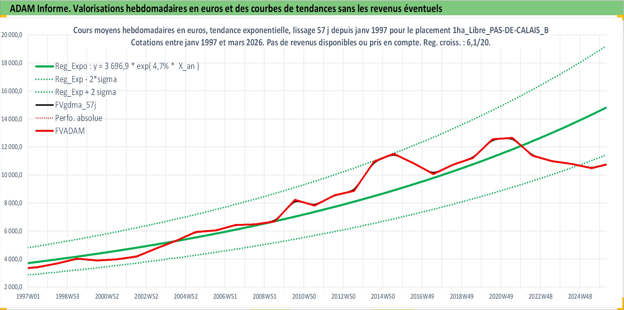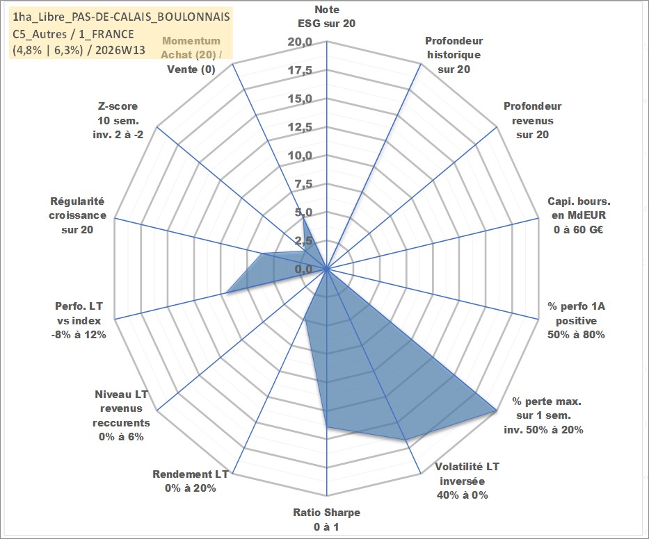Site dédié aux investisseursPage dédiée sur site financeAnalyse des valorisations hebdomadaires de l'actif 1ha_Libre_PAS-DE-CALAIS_BOULONNAIS. Cet actif est cote en EUR. Les valorisations couvrent les semaines 1997W01 a 2026W13. Les fermages de ce bien foncier sont pris egaux a 2,5% annuels de la valeur venale du bien.