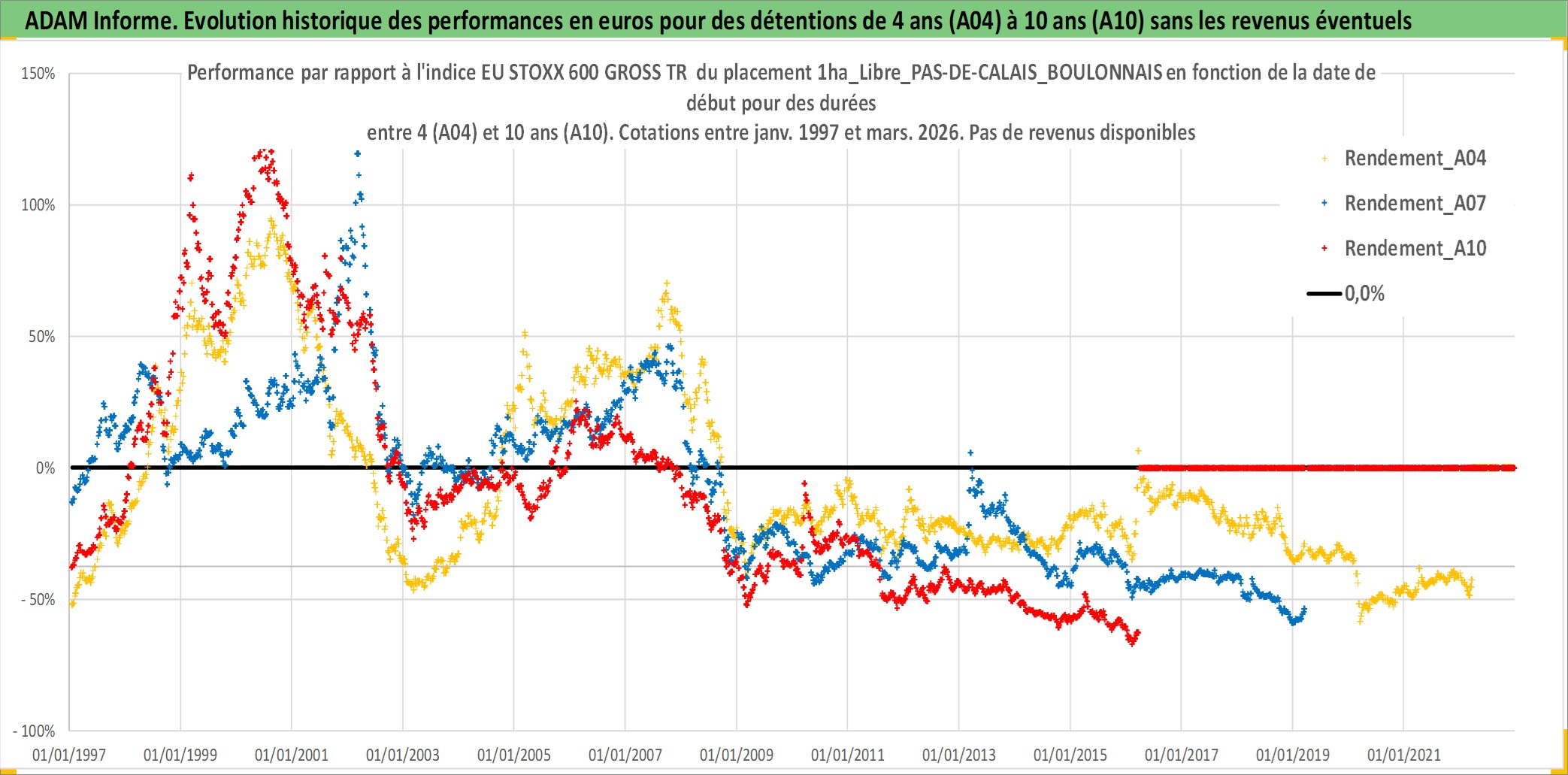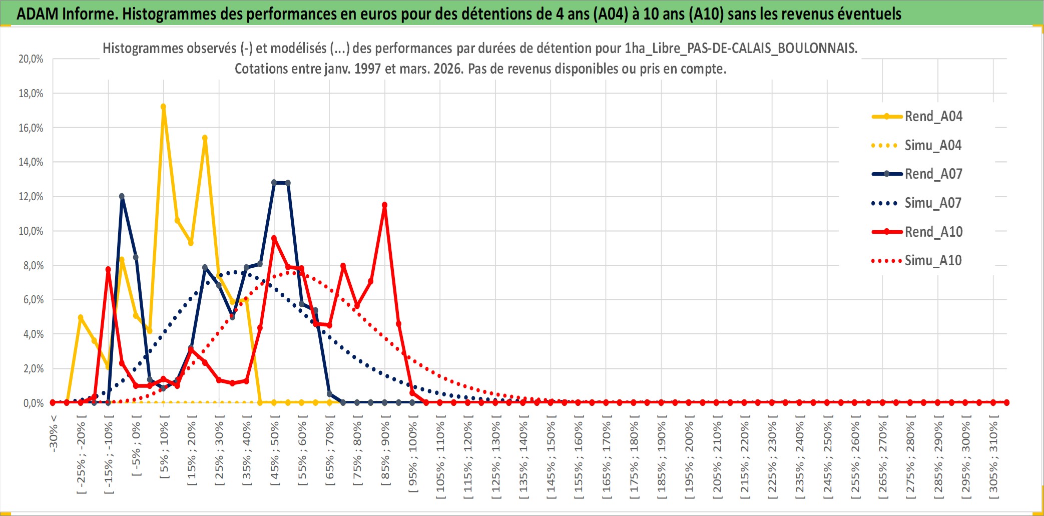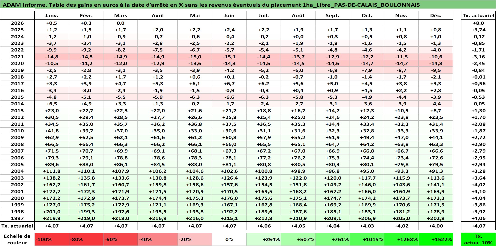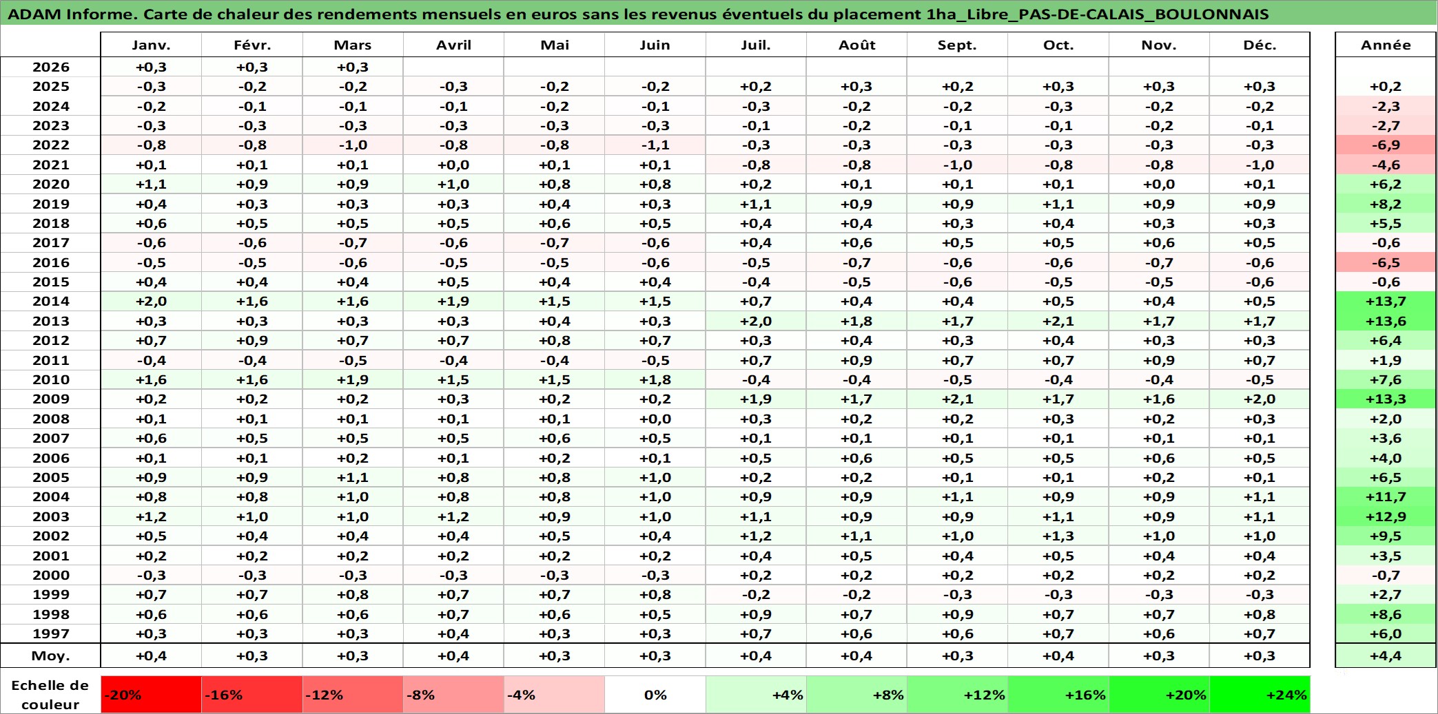 Site dédié aux investisseursPage dédiée sur site financeAnalyse des valorisations hebdomadaires de l'actif 1ha_Libre_PAS-DE-CALAIS_BOULONNAIS. Cet actif est cote en EUR. Les valorisations couvrent les semaines 1997W01 a 2026W13. Les fermages de ce bien foncier sont pris egaux a 2,5% annuels de la valeur venale du bien.