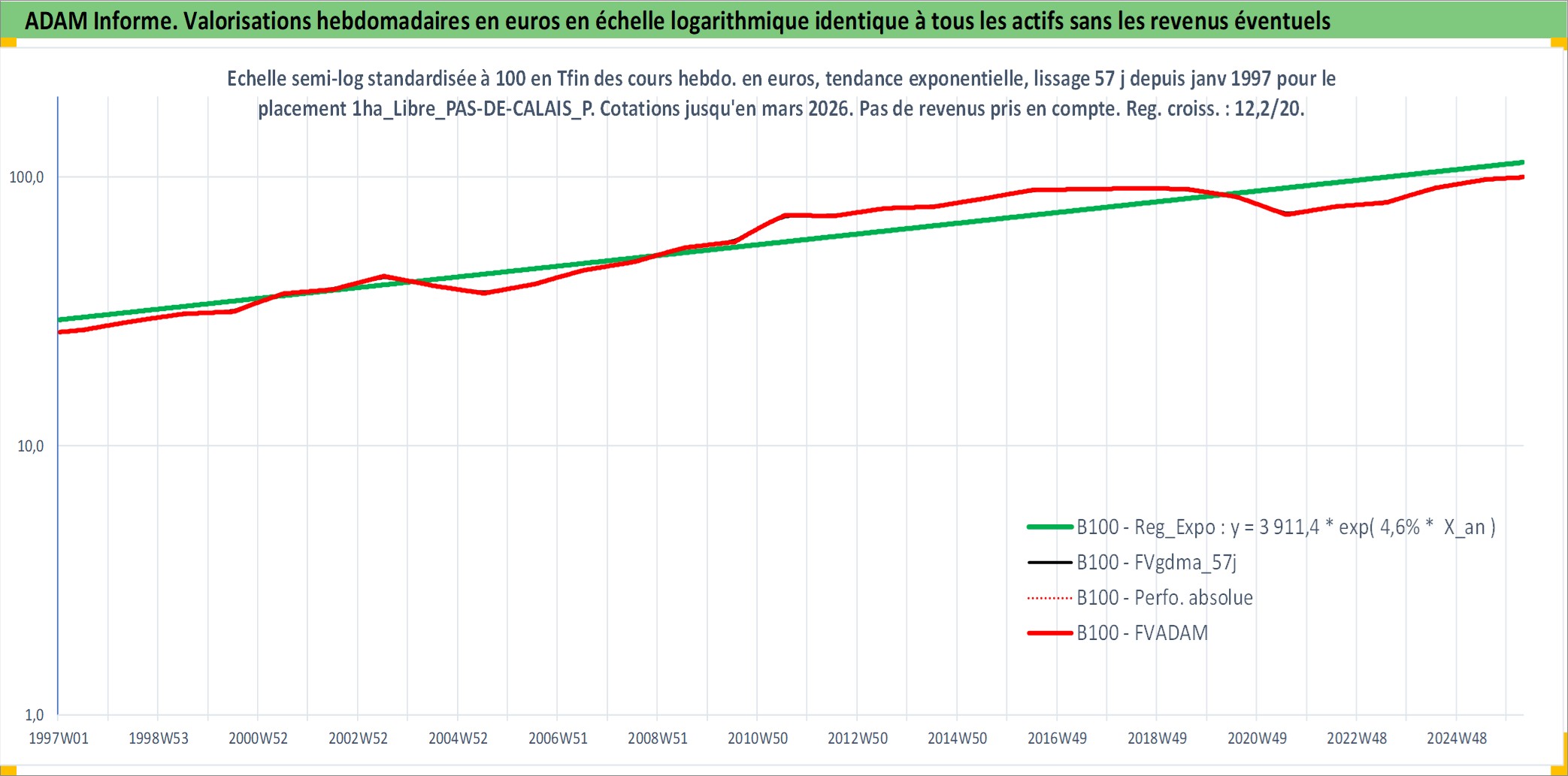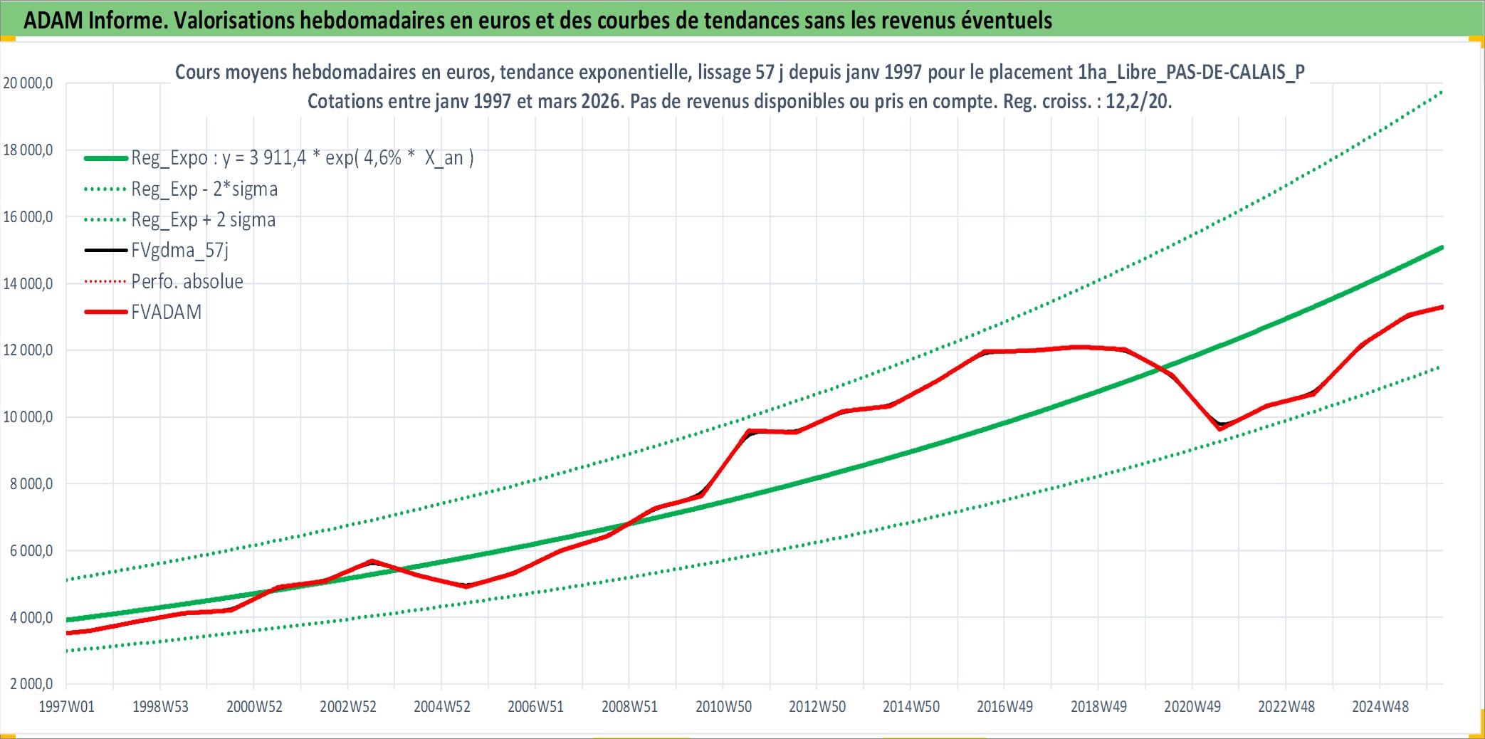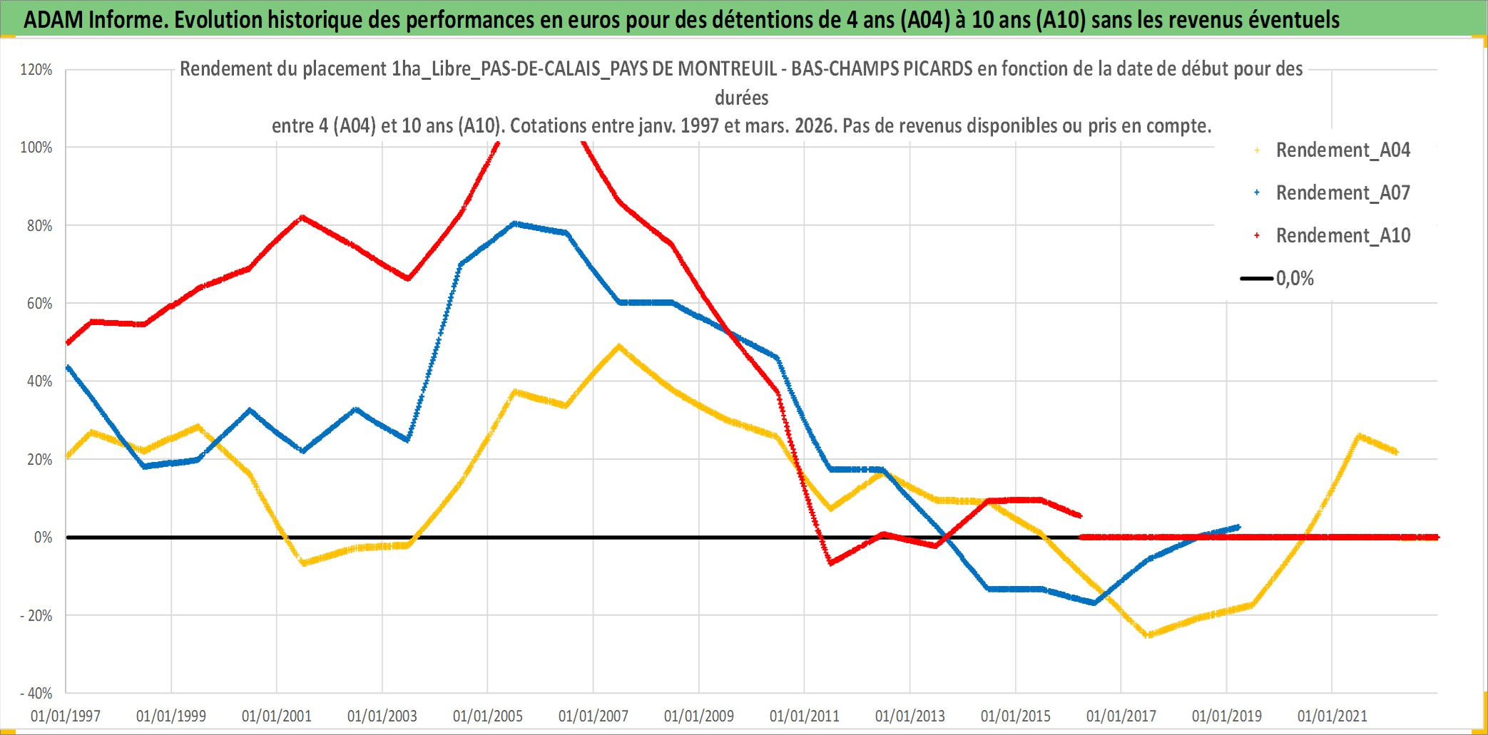 Site dédié aux investisseursPage dédiée sur site financeAnalyse des valorisations hebdomadaires de l'actif 1ha_Libre_PAS-DE-CALAIS_PAYS DE MONTREUIL - BAS-CHAMPS PICARDS. Cet actif est cote en EUR. Les valorisations couvrent les semaines 1997W01 a 2026W13. Les fermages de ce bien foncier sont pris egaux a 2,5% annuels de la valeur venale du bien.