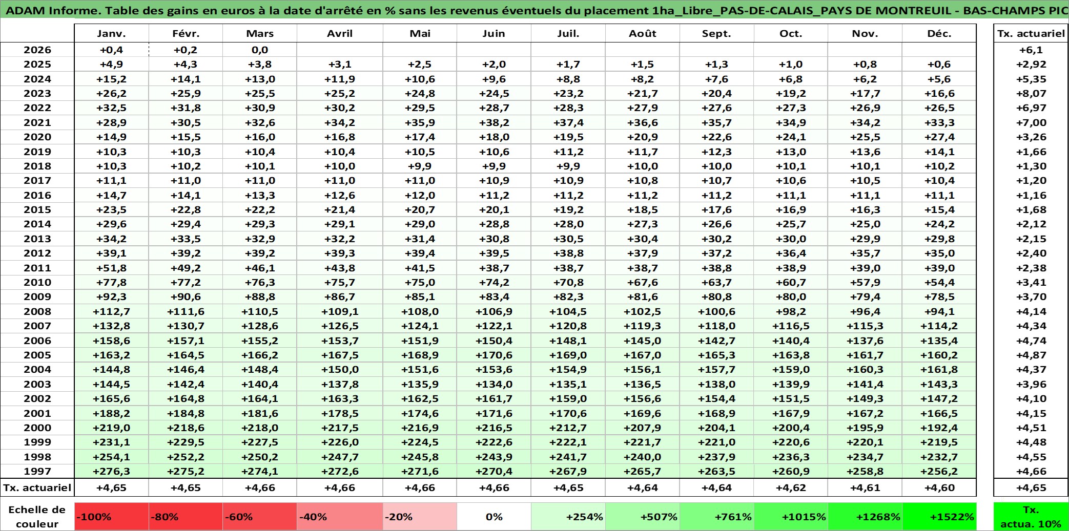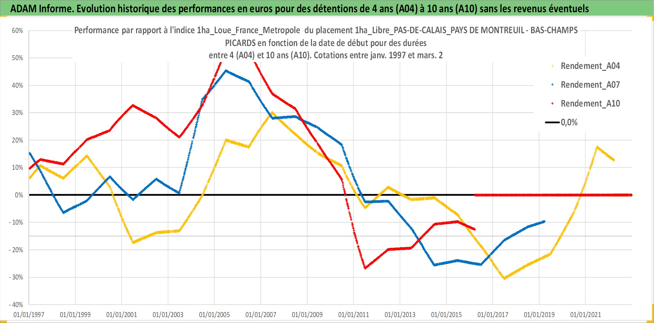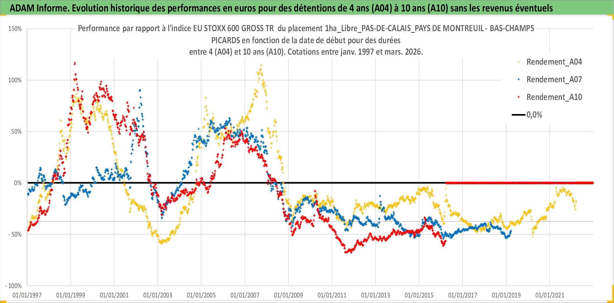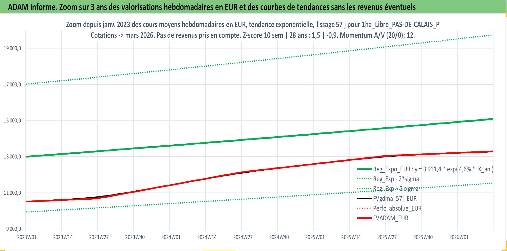Site dédié aux investisseursPage dédiée sur site financeAnalyse des valorisations hebdomadaires de l'actif 1ha_Libre_PAS-DE-CALAIS_PAYS DE MONTREUIL - BAS-CHAMPS PICARDS. Cet actif est cote en EUR. Les valorisations couvrent les semaines 1997W01 a 2026W13. Les fermages de ce bien foncier sont pris egaux a 2,5% annuels de la valeur venale du bien.