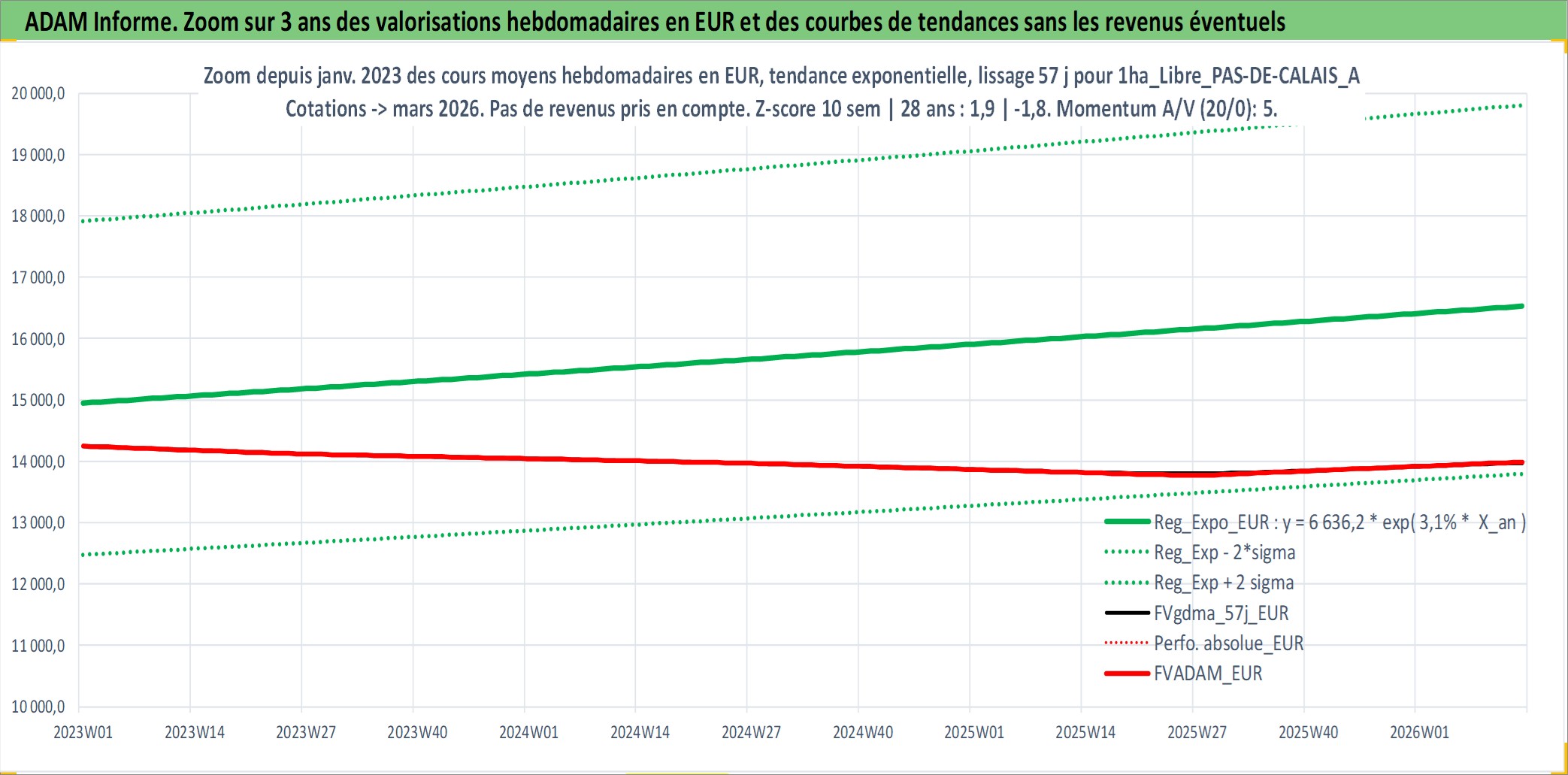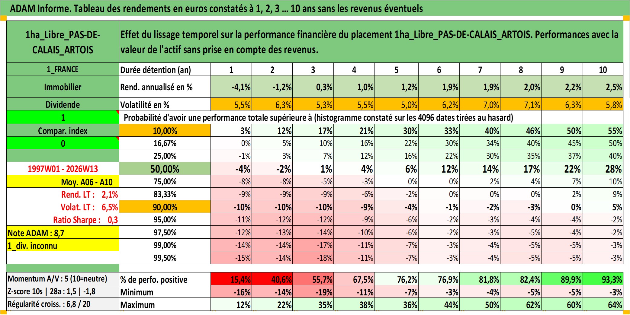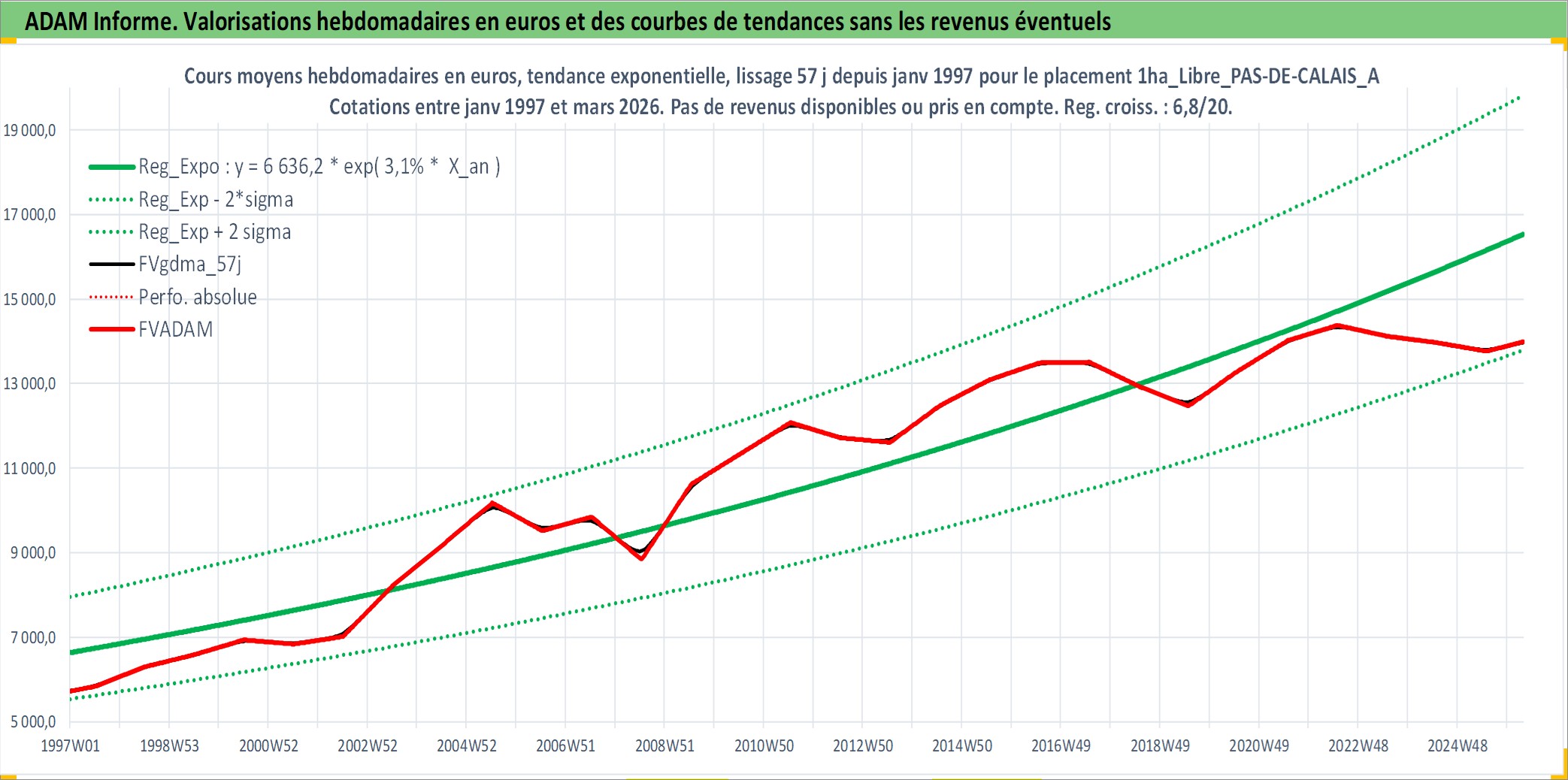 Site dédié aux investisseursPage dédiée sur site financeAnalyse des valorisations hebdomadaires de l'actif 1ha_Libre_PAS-DE-CALAIS_ARTOIS. Cet actif est cote en EUR. Les valorisations couvrent les semaines 1997W01 a 2026W13. Les fermages de ce bien foncier sont pris egaux a 2,5% annuels de la valeur venale du bien.