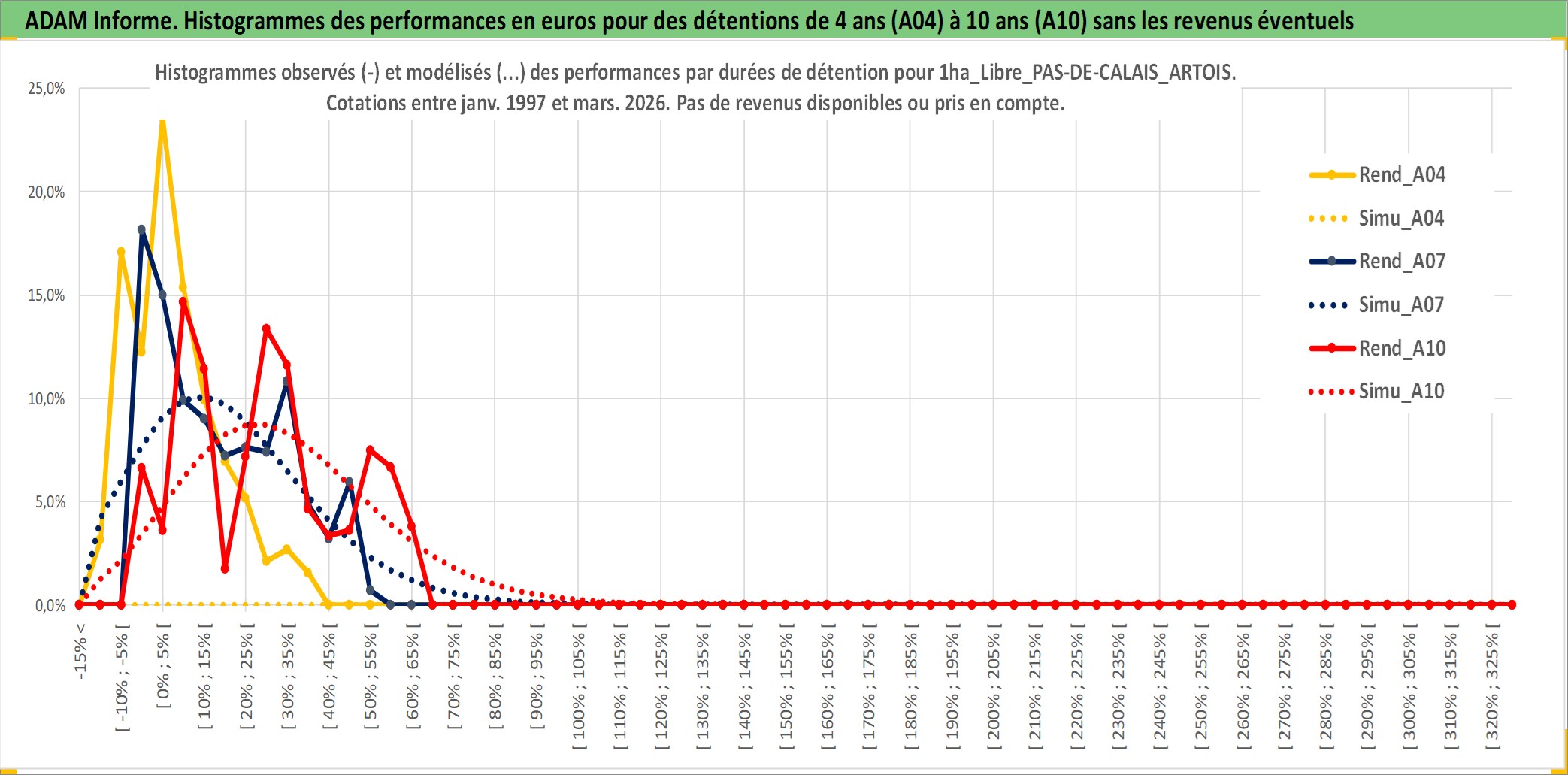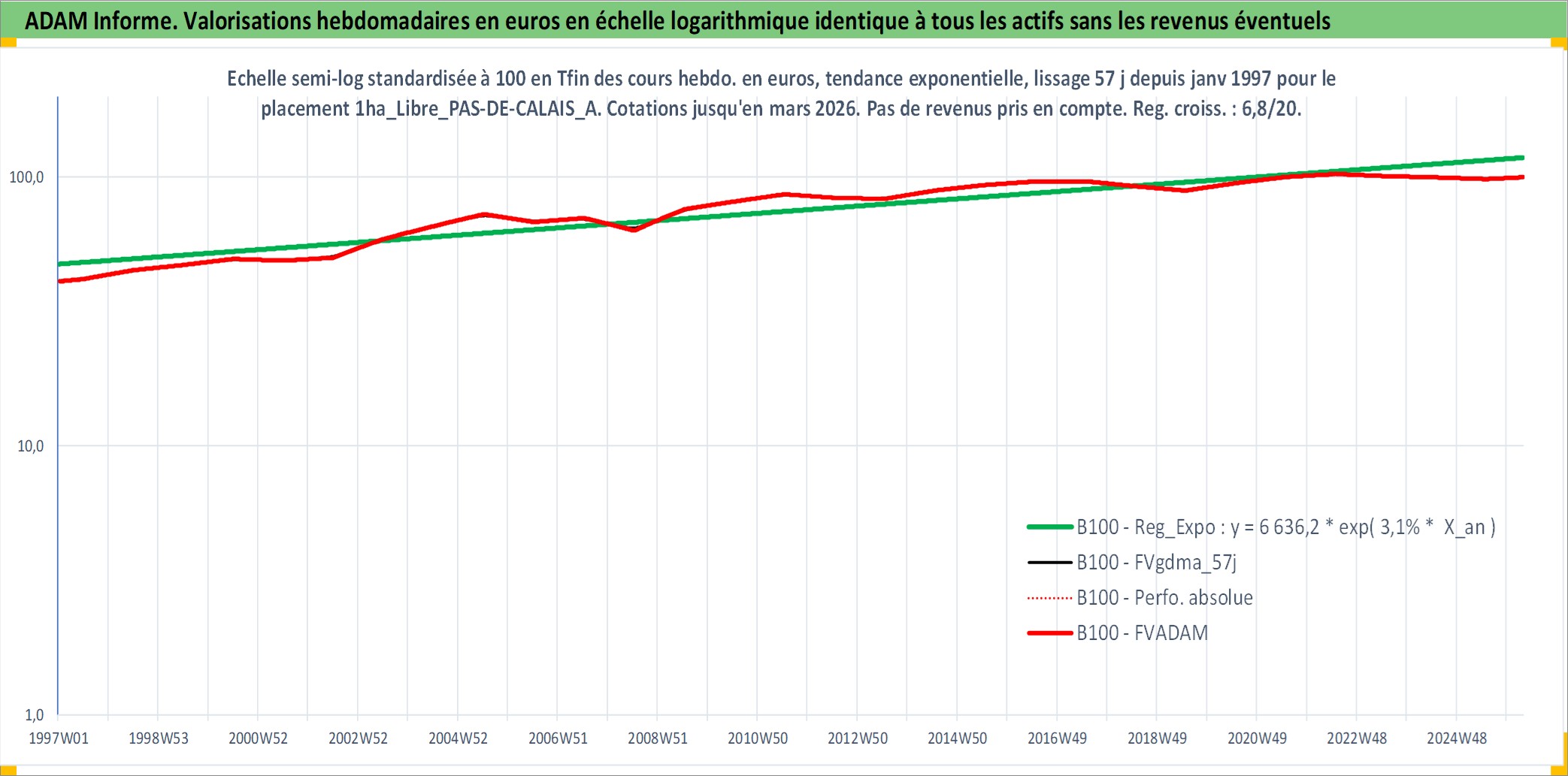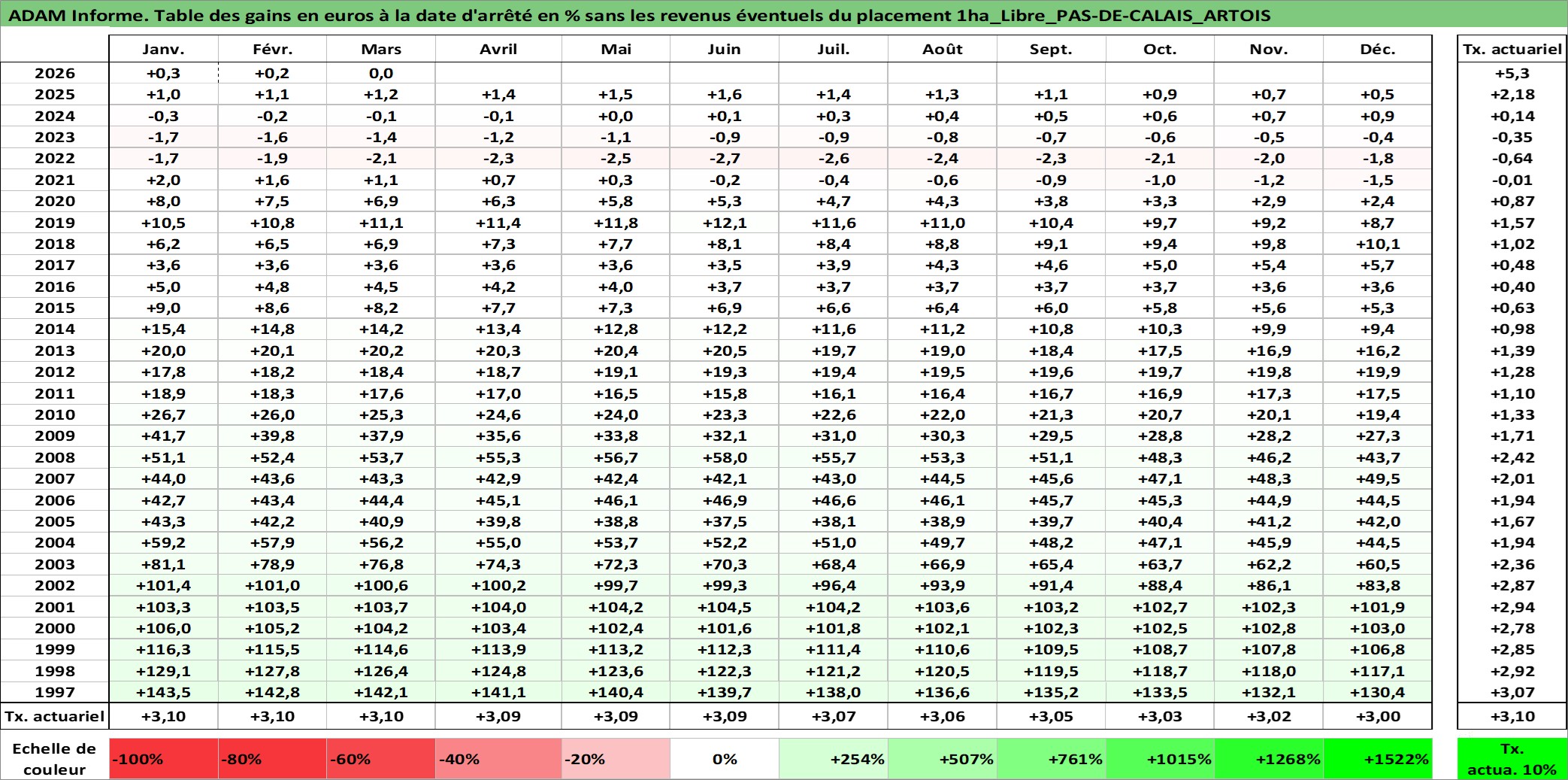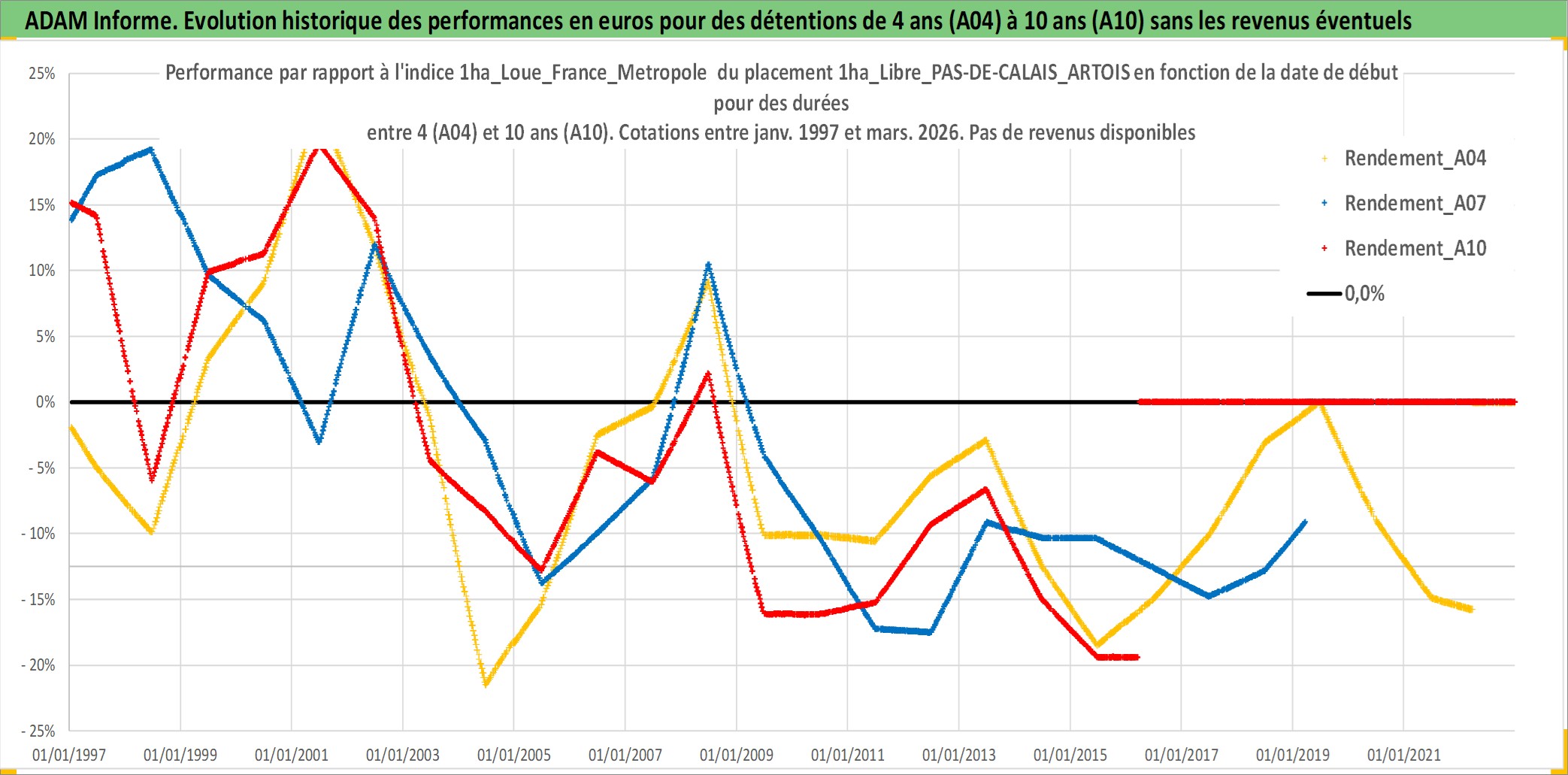 Site dédié aux investisseursPage dédiée sur site financeAnalyse des valorisations hebdomadaires de l'actif 1ha_Libre_PAS-DE-CALAIS_ARTOIS. Cet actif est cote en EUR. Les valorisations couvrent les semaines 1997W01 a 2026W13. Les fermages de ce bien foncier sont pris egaux a 2,5% annuels de la valeur venale du bien.