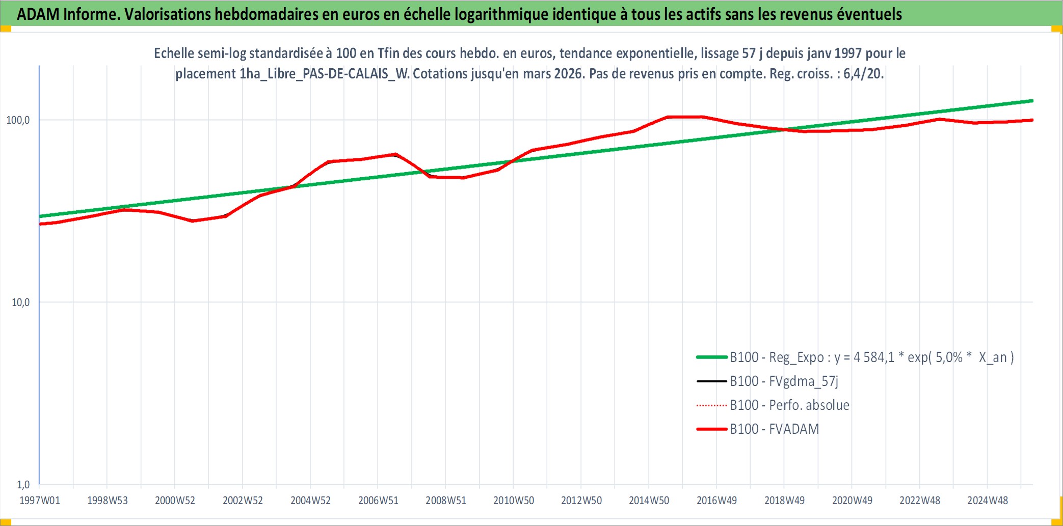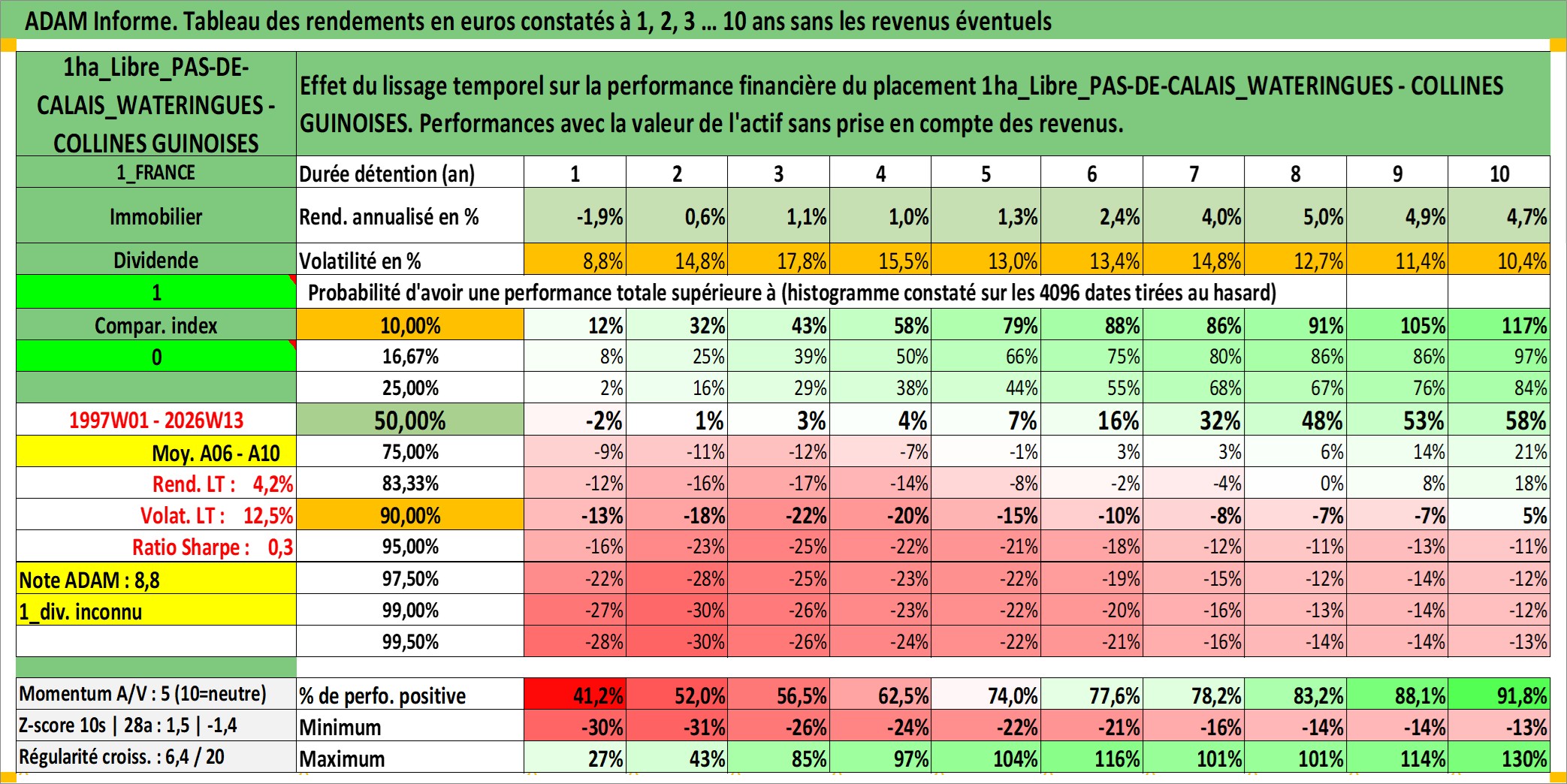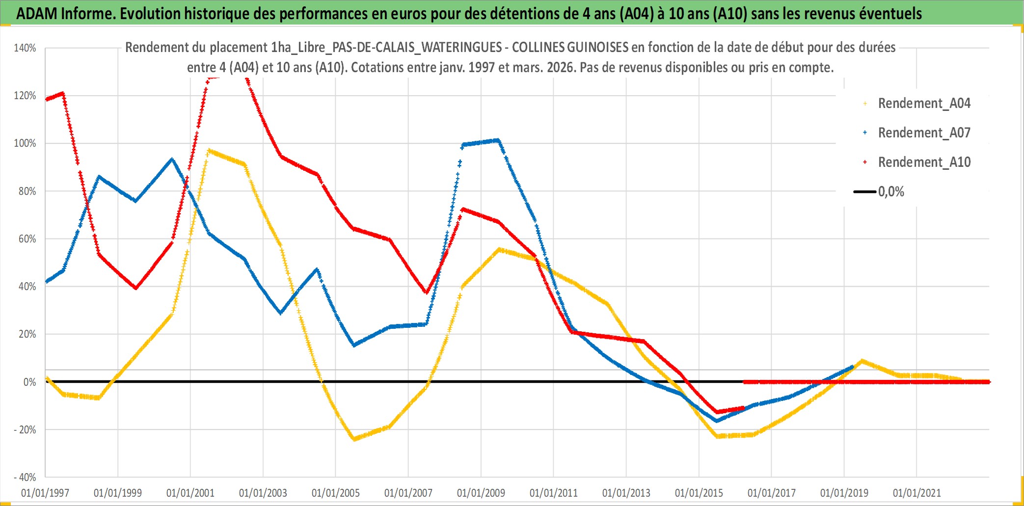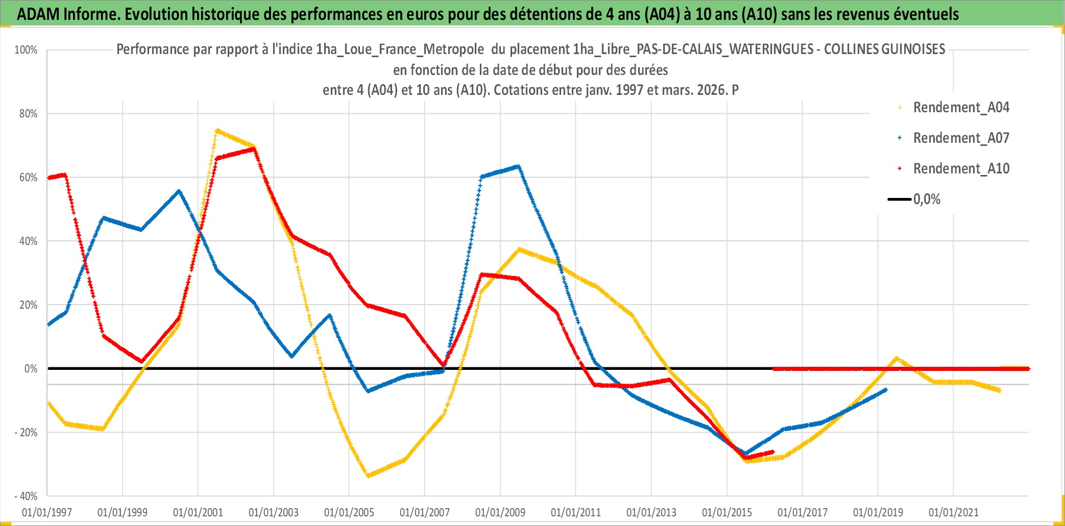 Site dédié aux investisseursPage dédiée sur site financeAnalyse des valorisations hebdomadaires de l'actif 1ha_Libre_PAS-DE-CALAIS_WATERINGUES - COLLINES GUINOISES. Cet actif est cote en EUR. Les valorisations couvrent les semaines 1997W01 a 2026W13. Les fermages de ce bien foncier sont pris egaux a 2,5% annuels de la valeur venale du bien.