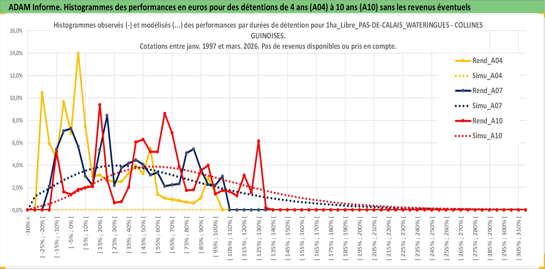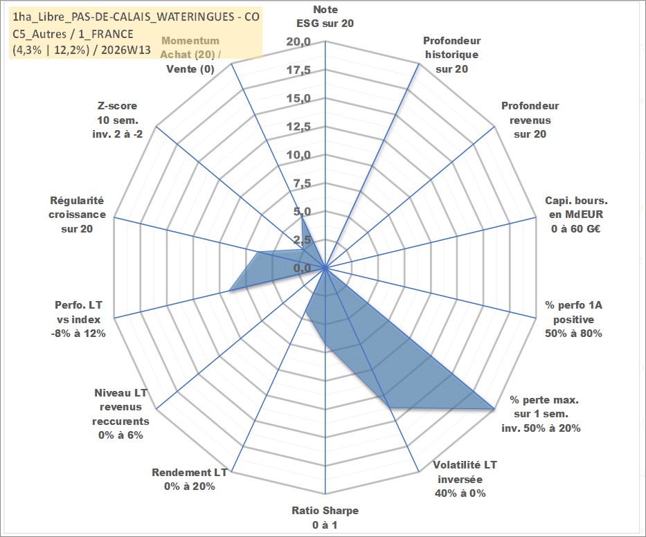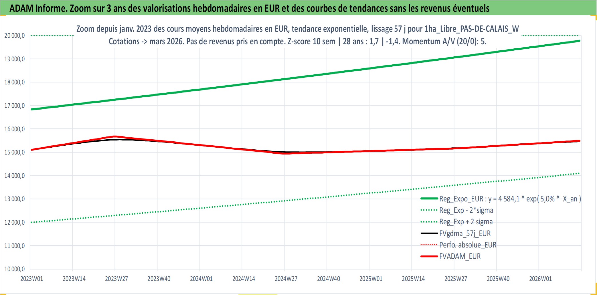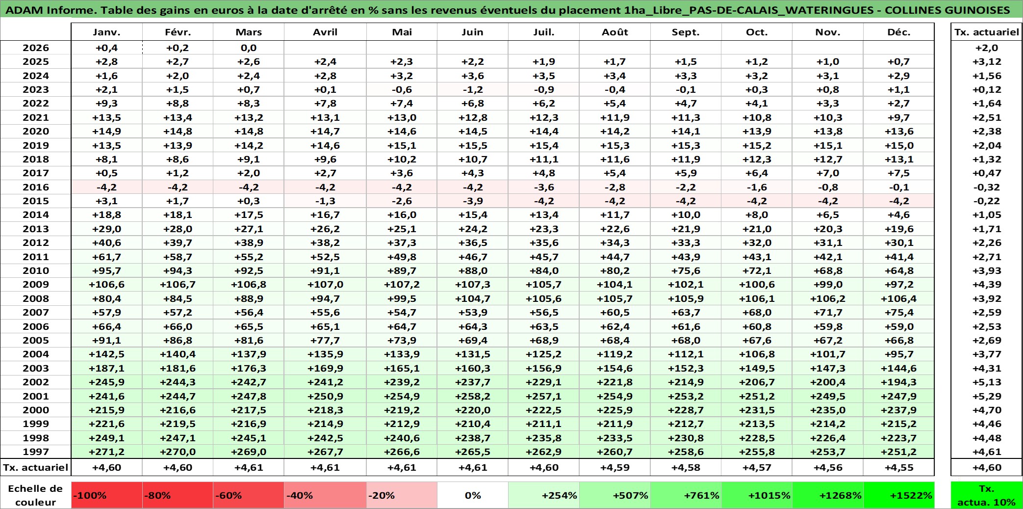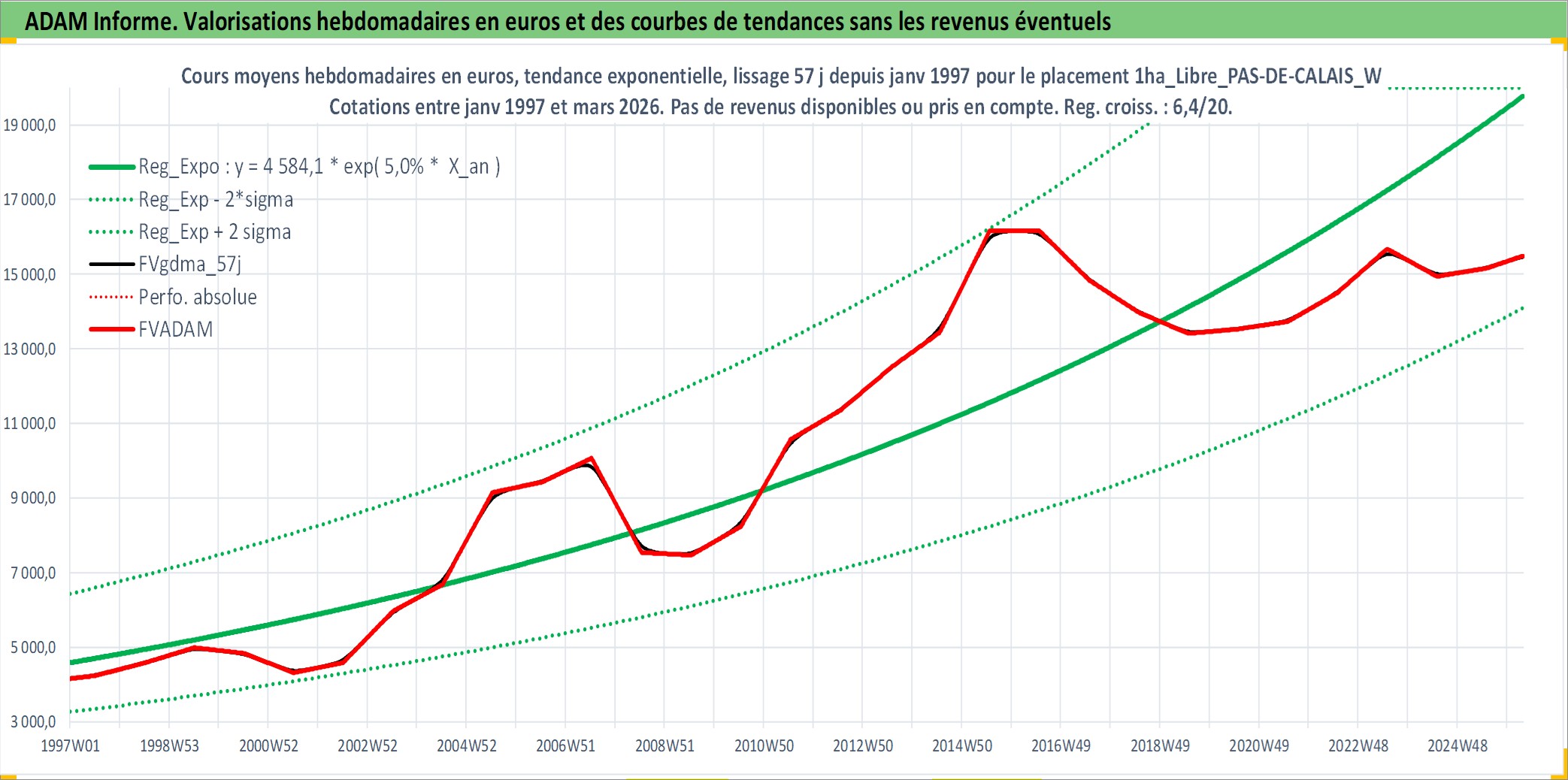 Site dédié aux investisseursPage dédiée sur site financeAnalyse des valorisations hebdomadaires de l'actif 1ha_Libre_PAS-DE-CALAIS_WATERINGUES - COLLINES GUINOISES. Cet actif est cote en EUR. Les valorisations couvrent les semaines 1997W01 a 2026W13. Les fermages de ce bien foncier sont pris egaux a 2,5% annuels de la valeur venale du bien.