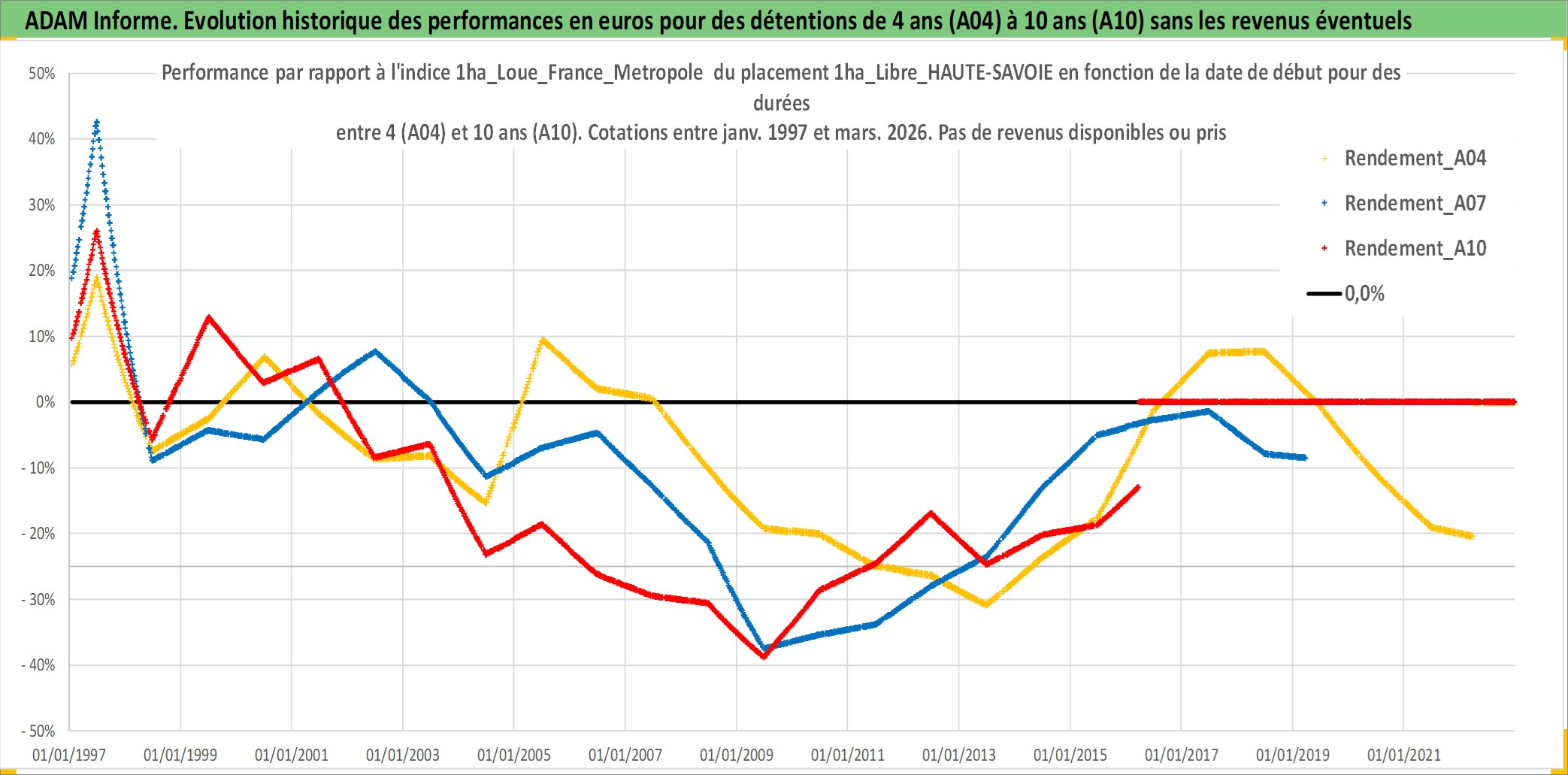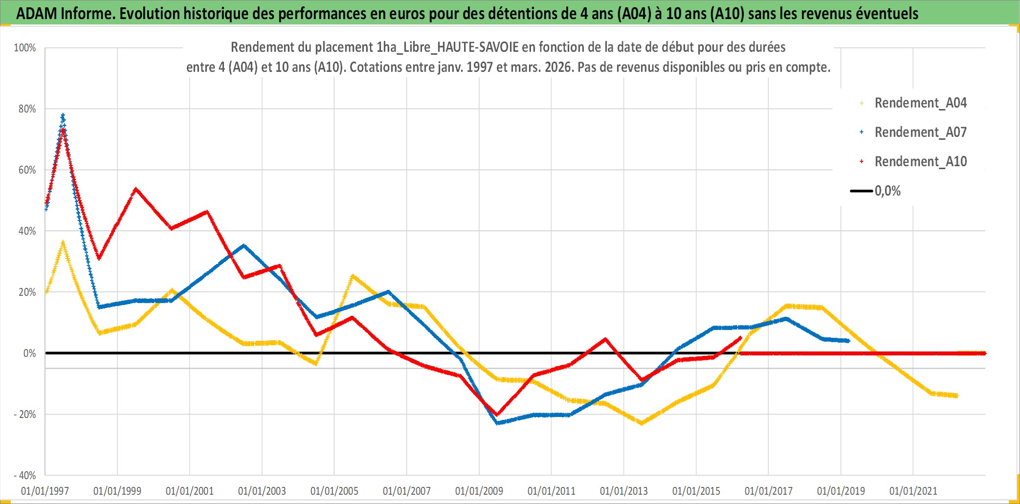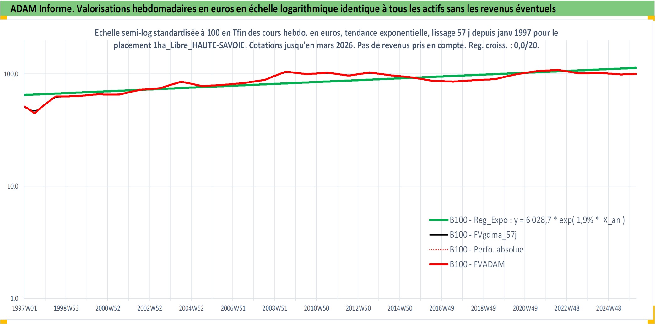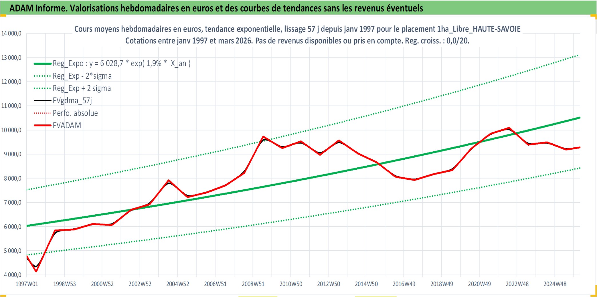 Site dédié aux investisseursPage dédiée sur site financeAnalyse des valorisations hebdomadaires de l'actif 1ha_Libre_HAUTE-SAVOIE. Cet actif est cote en EUR. Les valorisations couvrent les semaines 1997W01 a 2026W13. Les fermages de ce bien foncier sont pris egaux a 2,5% annuels de la valeur venale du bien.
