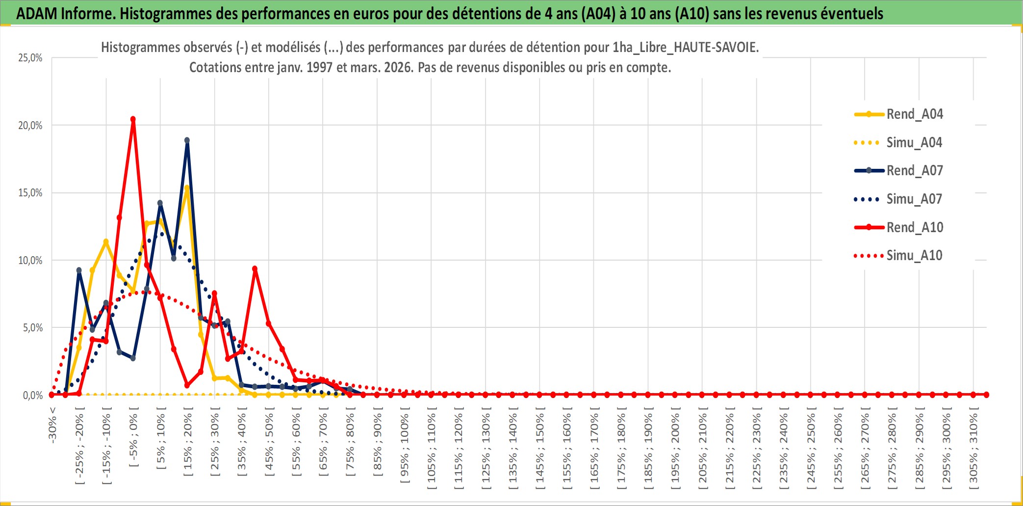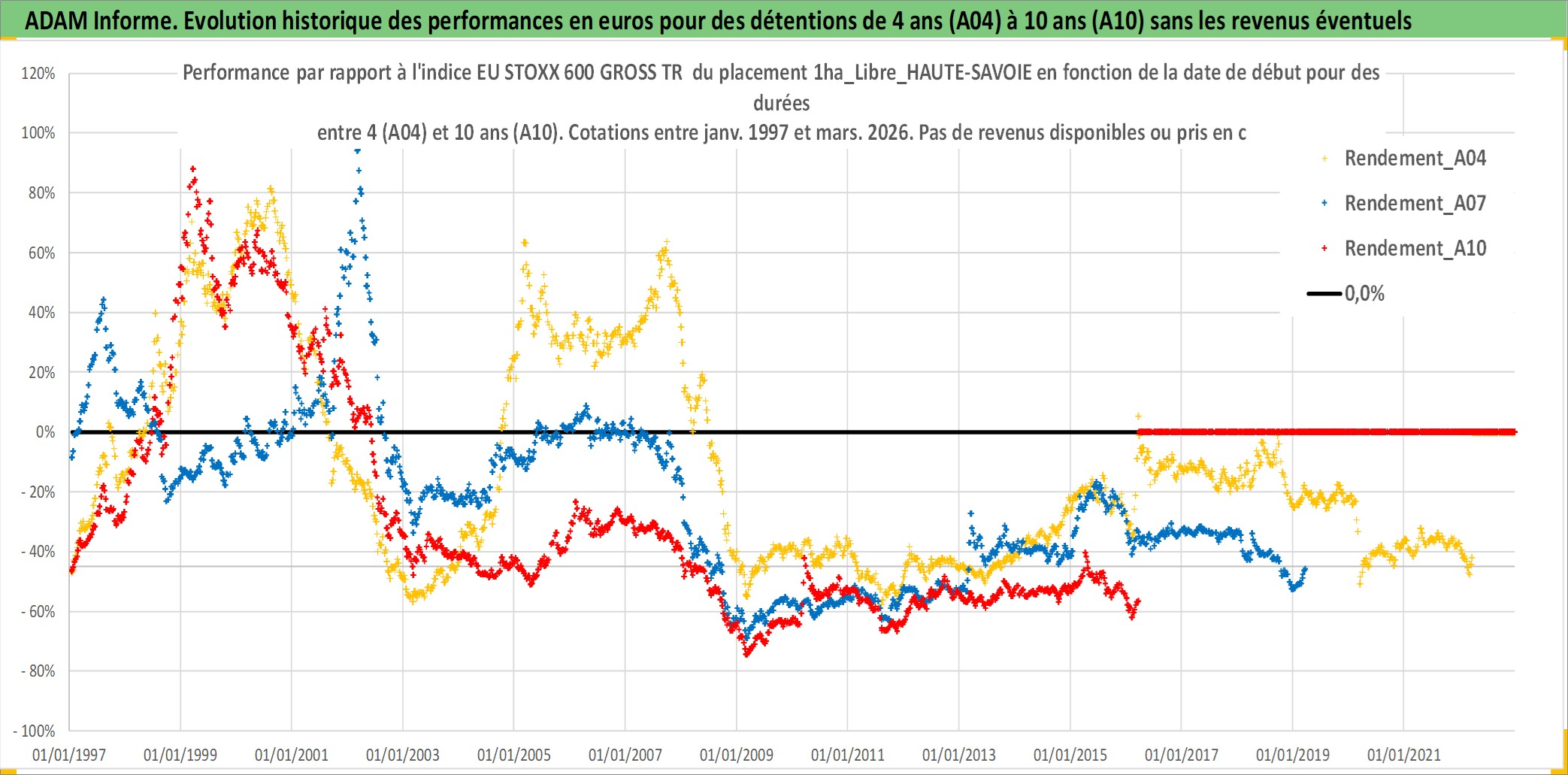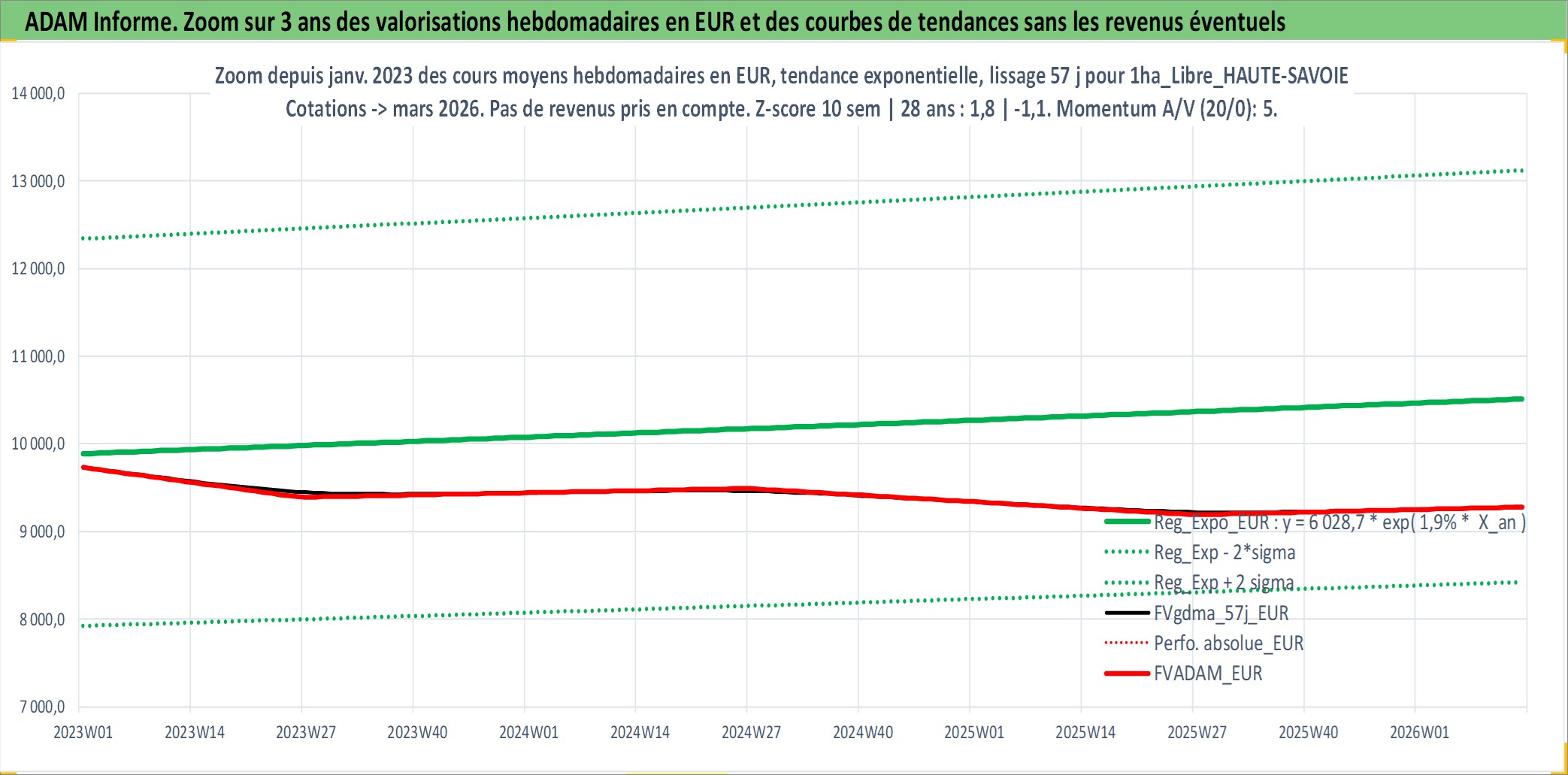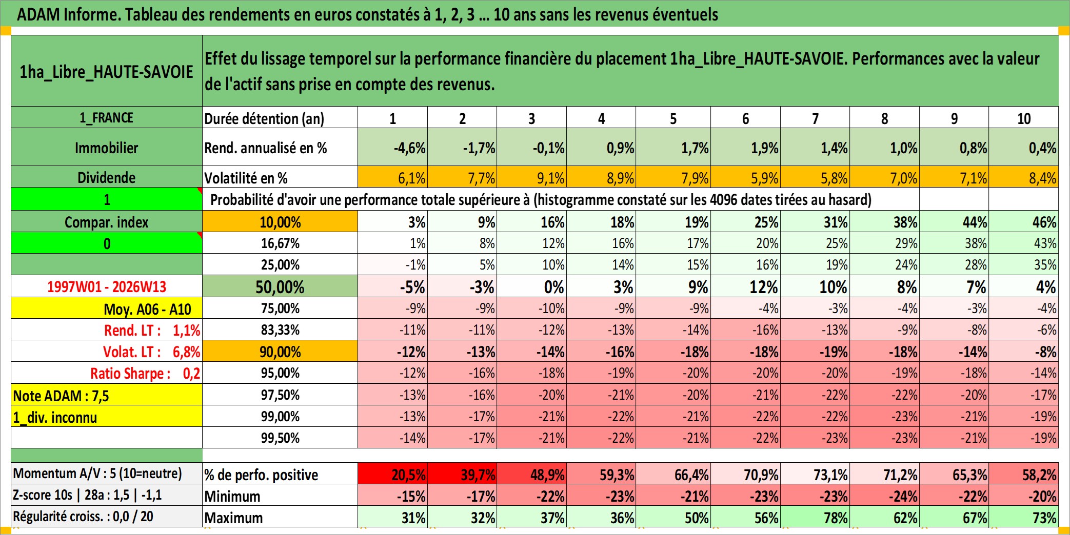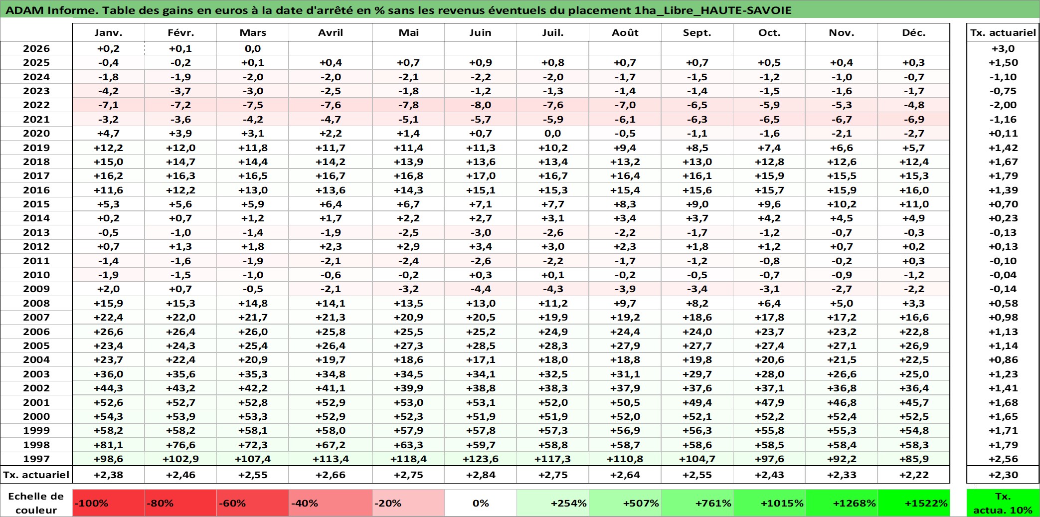 Site dédié aux investisseursPage dédiée sur site financeAnalyse des valorisations hebdomadaires de l'actif 1ha_Libre_HAUTE-SAVOIE. Cet actif est cote en EUR. Les valorisations couvrent les semaines 1997W01 a 2026W13. Les fermages de ce bien foncier sont pris egaux a 2,5% annuels de la valeur venale du bien.
