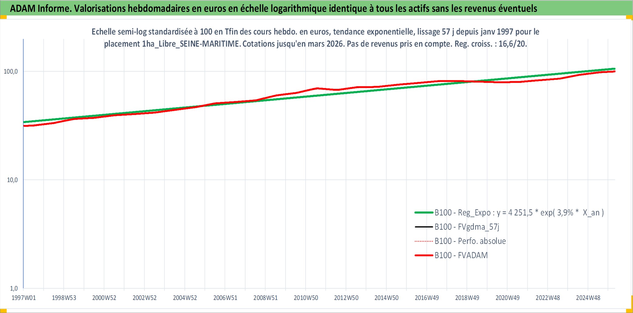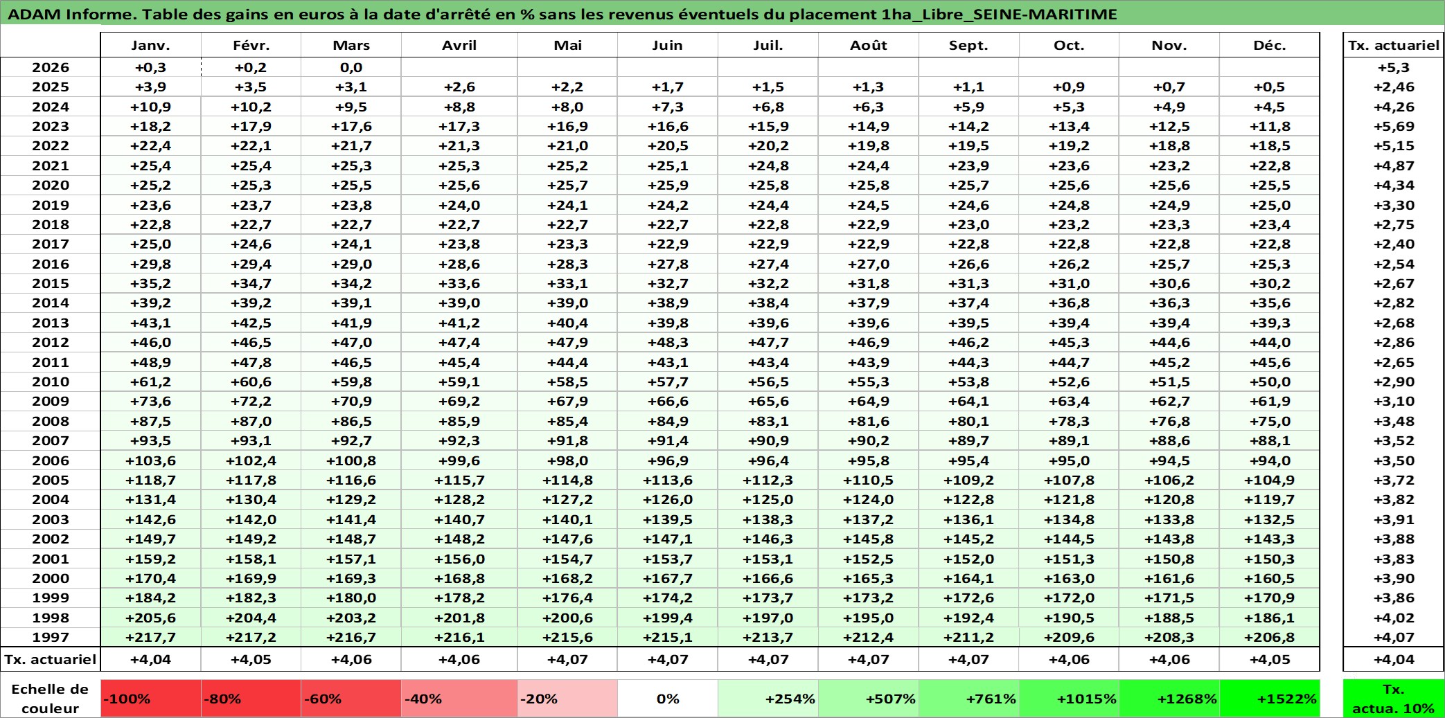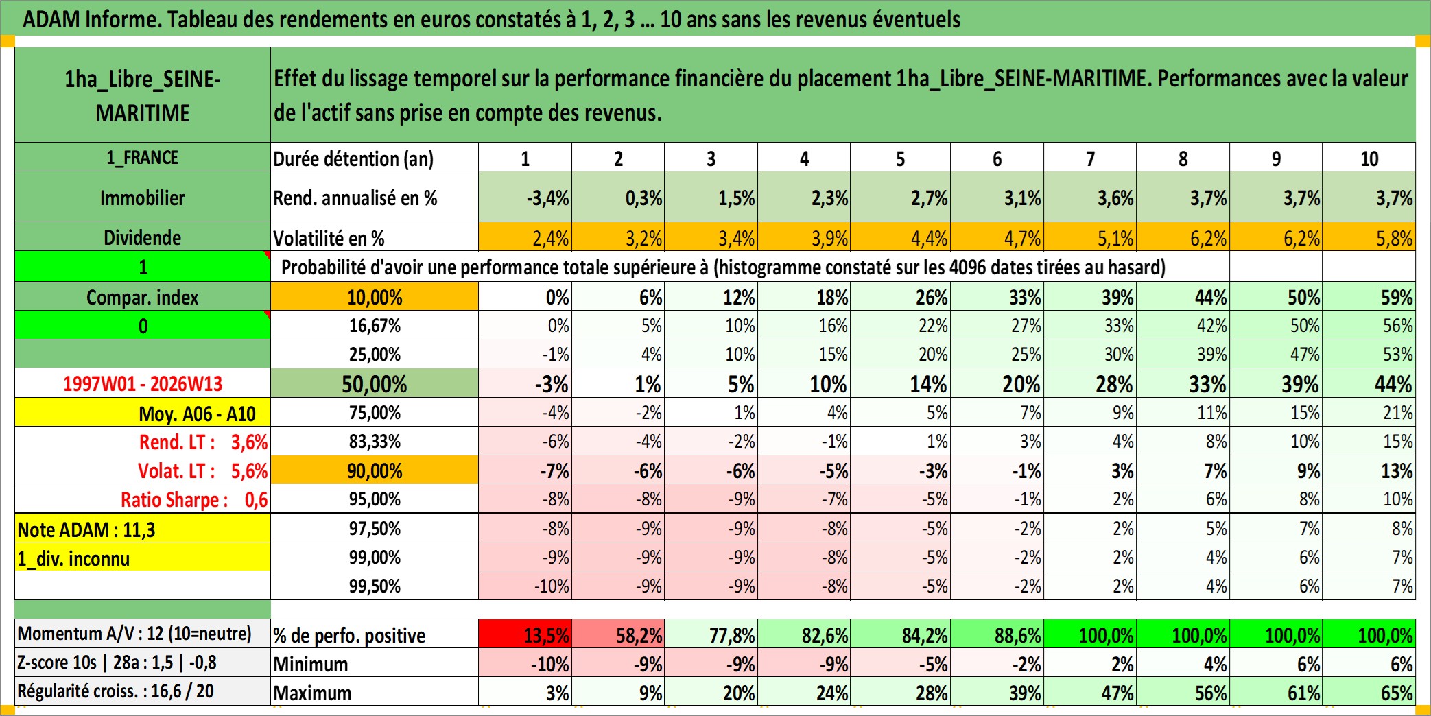 Site dédié aux investisseursPage dédiée sur site financeAnalyse des valorisations hebdomadaires de l'actif 1ha_Libre_SEINE-MARITIME. Cet actif est cote en EUR. Les valorisations couvrent les semaines 1997W01 a 2026W13. Les fermages de ce bien foncier sont pris egaux a 2,5% annuels de la valeur venale du bien.