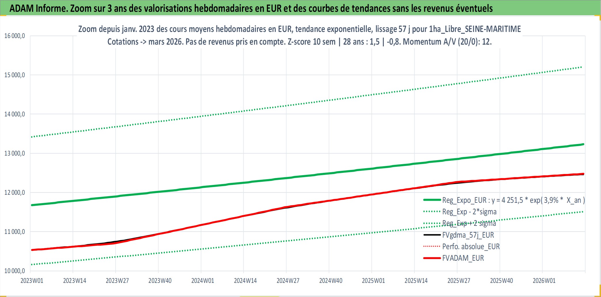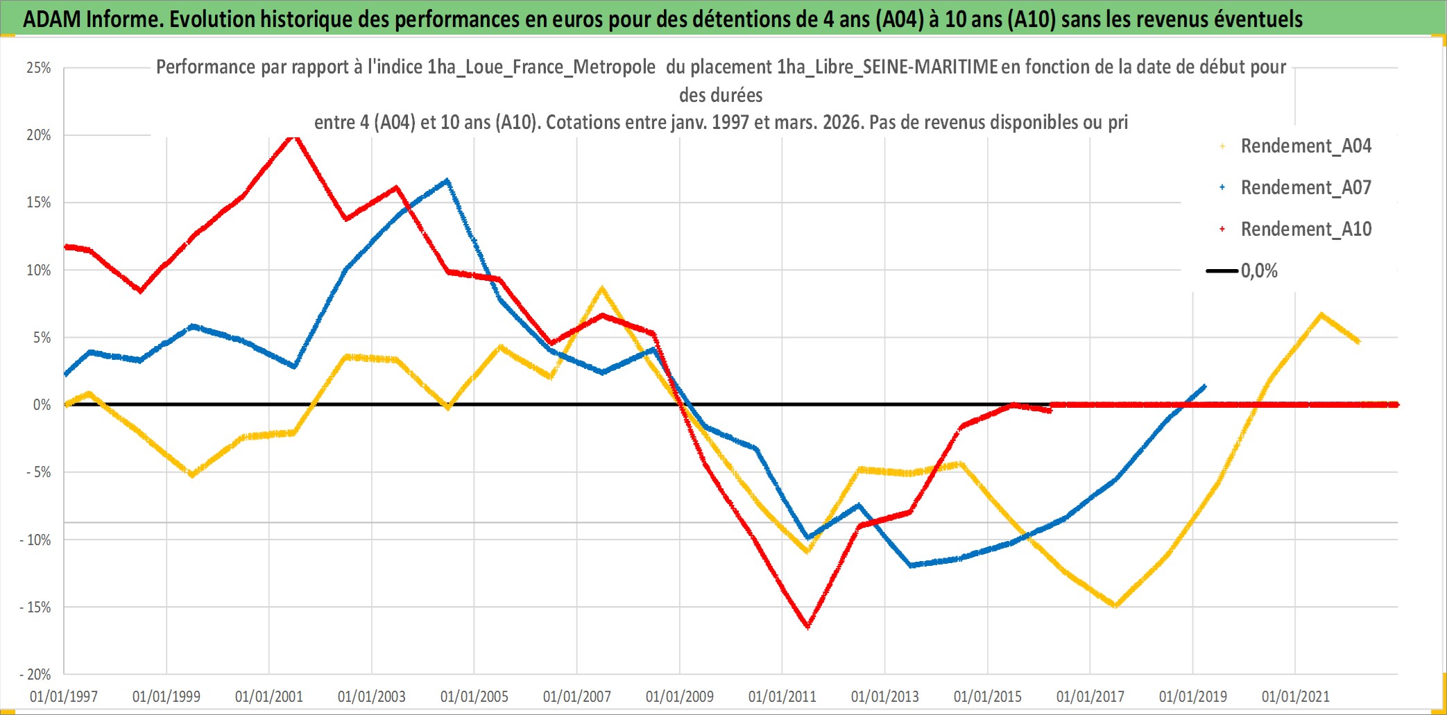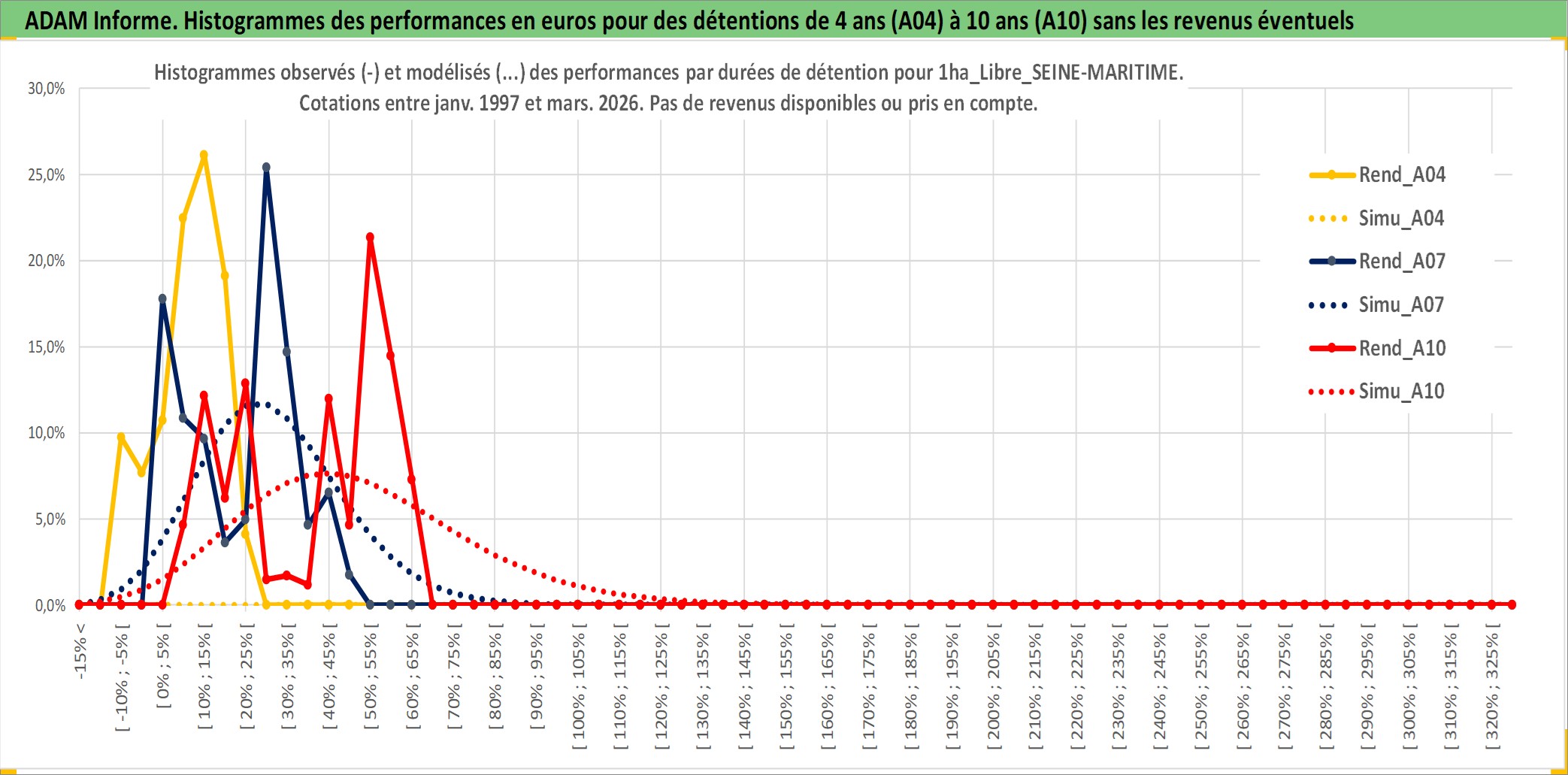 Site dédié aux investisseursPage dédiée sur site financeAnalyse des valorisations hebdomadaires de l'actif 1ha_Libre_SEINE-MARITIME. Cet actif est cote en EUR. Les valorisations couvrent les semaines 1997W01 a 2026W13. Les fermages de ce bien foncier sont pris egaux a 2,5% annuels de la valeur venale du bien.