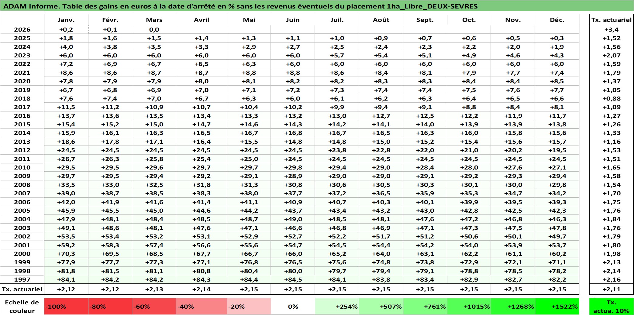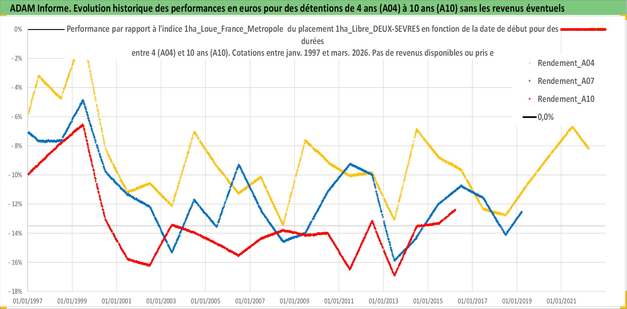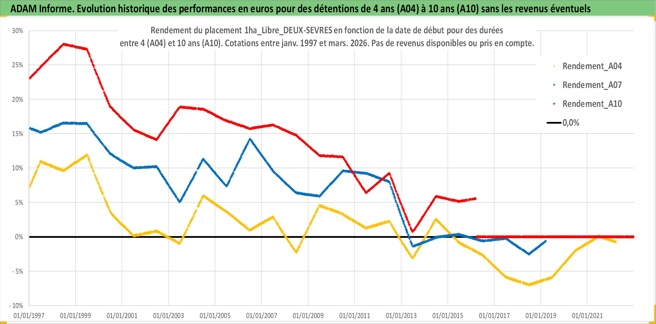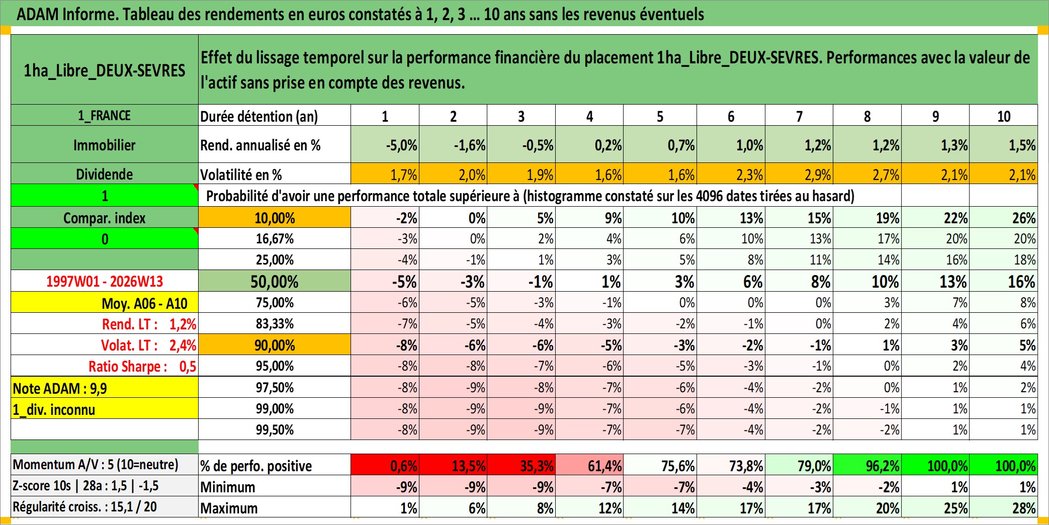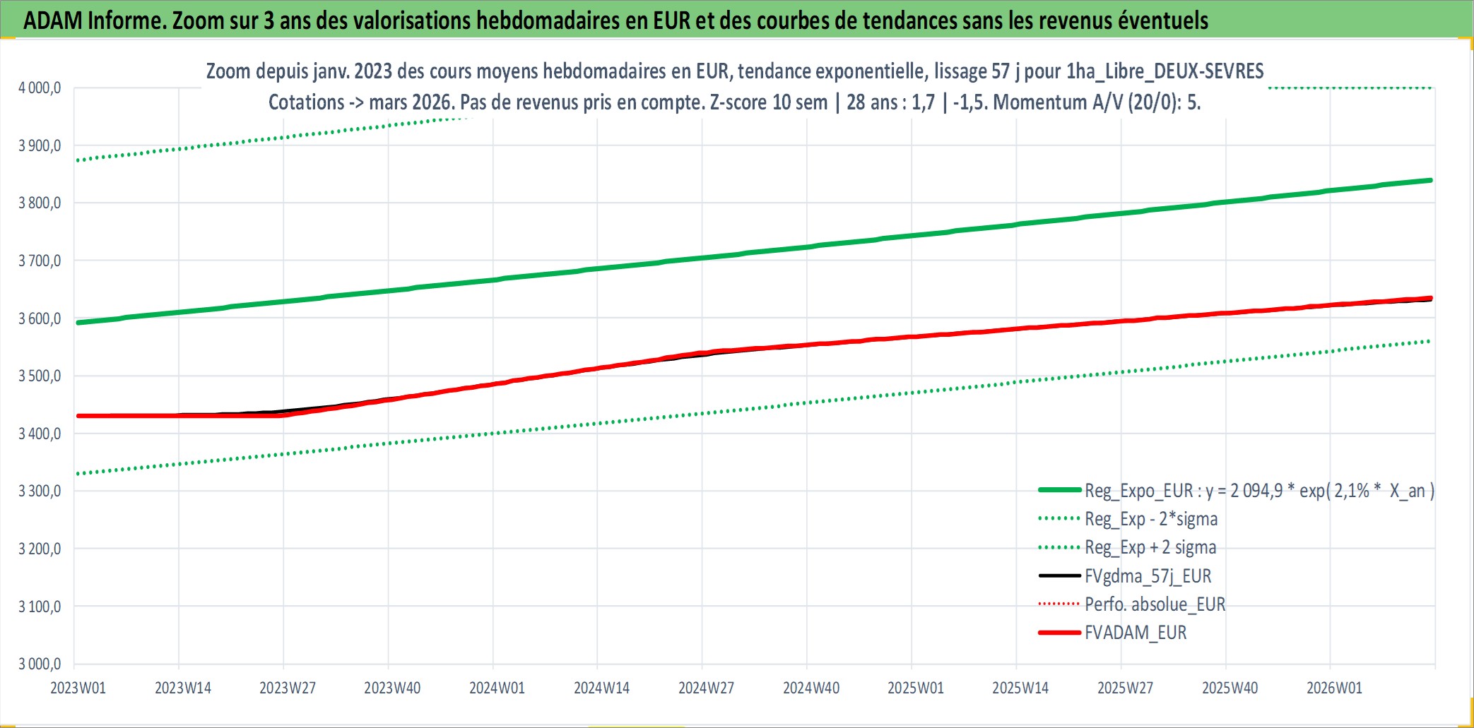 Site dédié aux investisseursPage dédiée sur site financeAnalyse des valorisations hebdomadaires de l'actif 1ha_Libre_DEUX-SEVRES. Cet actif est cote en EUR. Les valorisations couvrent les semaines 1997W01 a 2026W13. Les fermages de ce bien foncier sont pris egaux a 2,5% annuels de la valeur venale du bien.