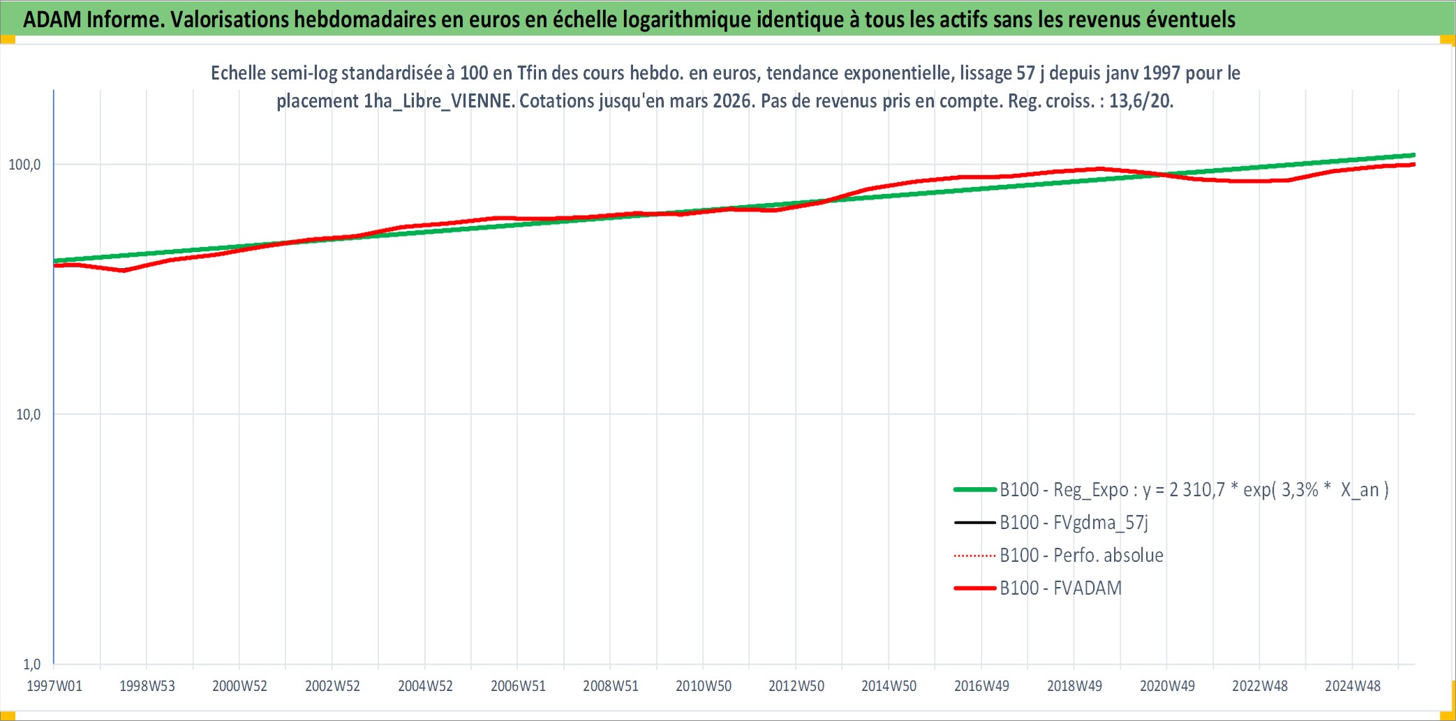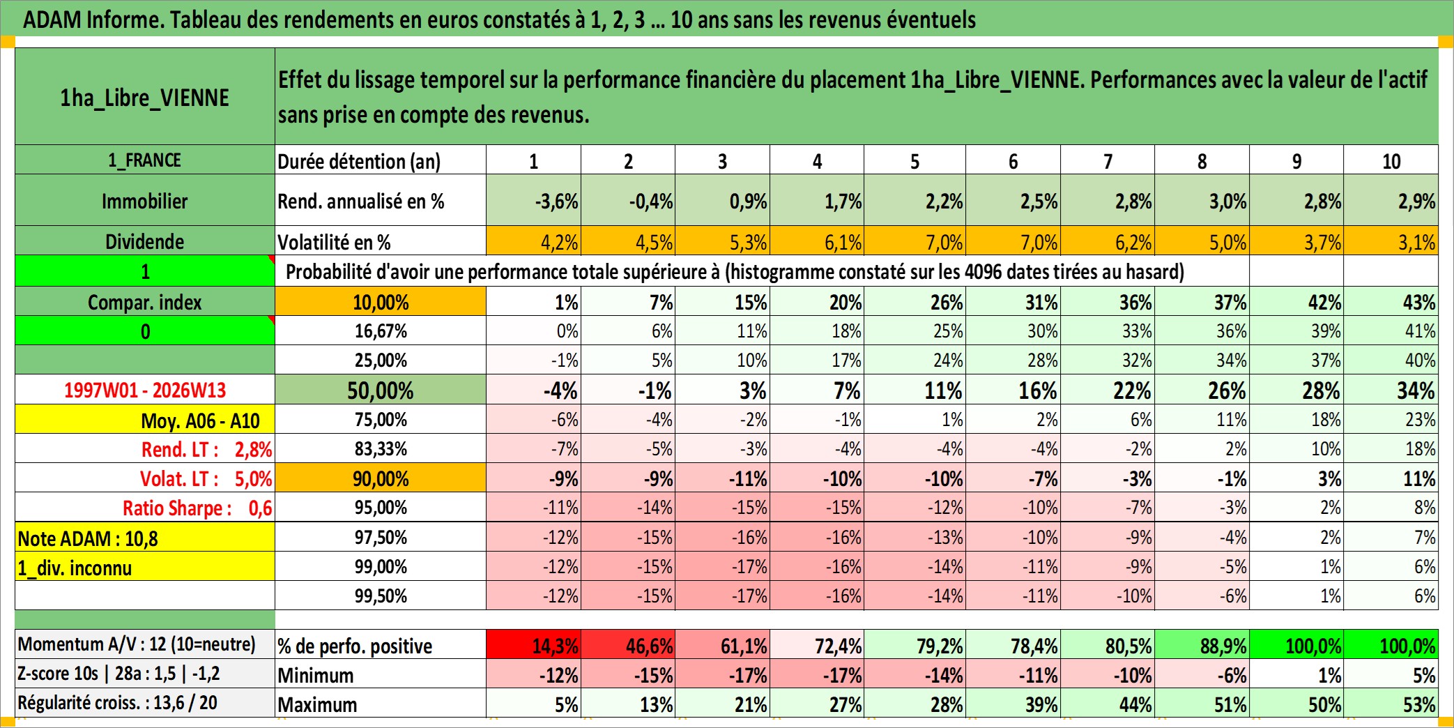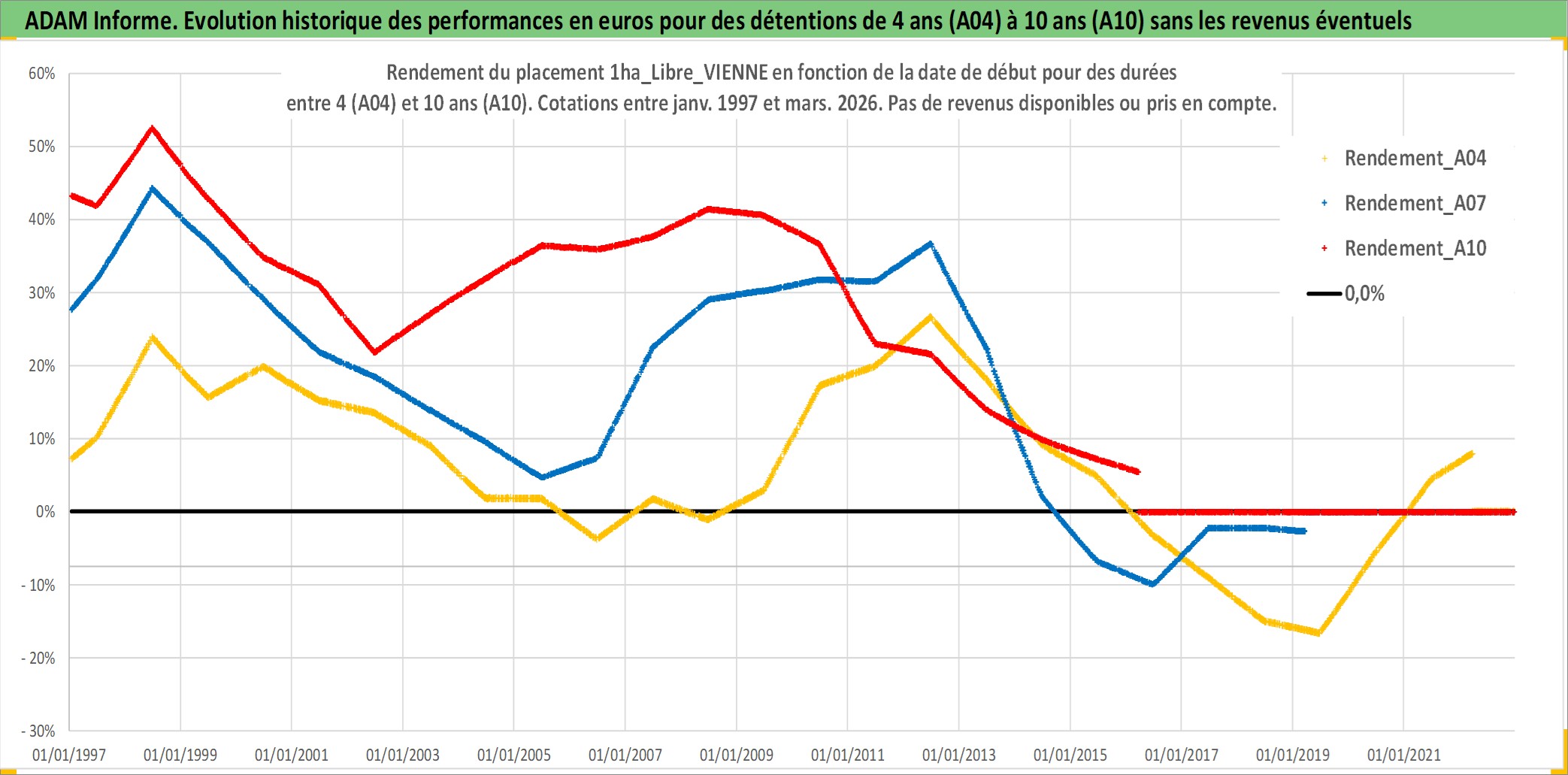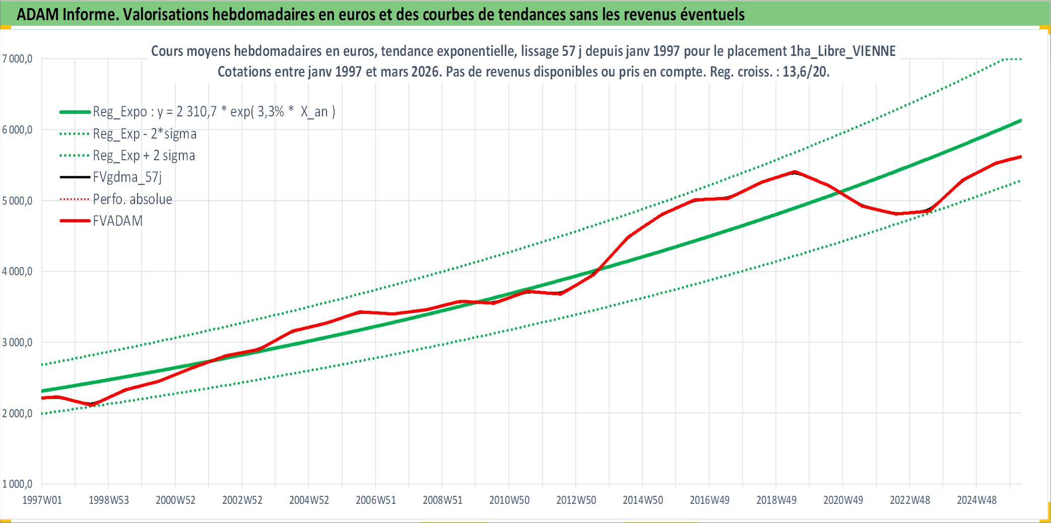 Site dédié aux investisseursPage dédiée sur site financeAnalyse des valorisations hebdomadaires de l'actif 1ha_Libre_VIENNE. Cet actif est cote en EUR. Les valorisations couvrent les semaines 1997W01 a 2026W13. Les fermages de ce bien foncier sont pris egaux a 2,5% annuels de la valeur venale du bien.