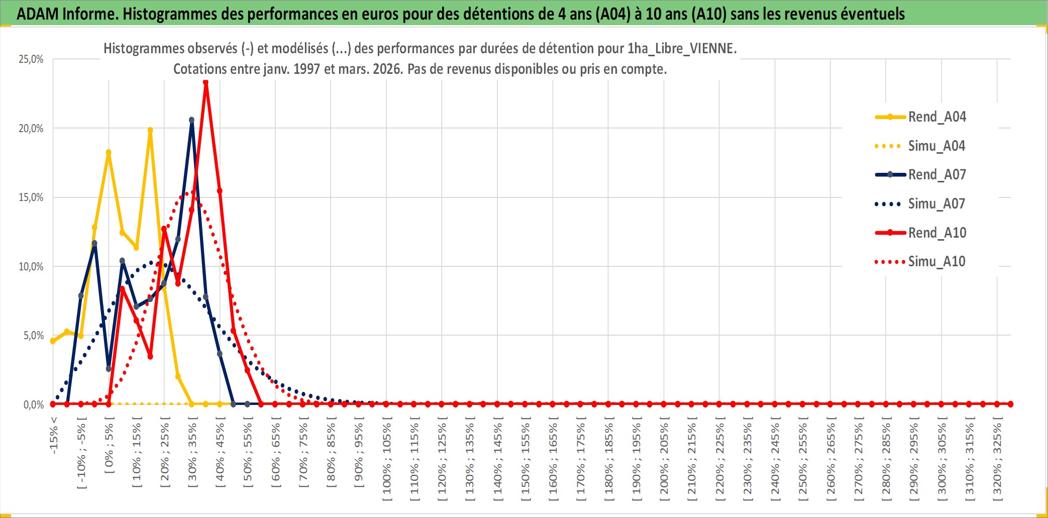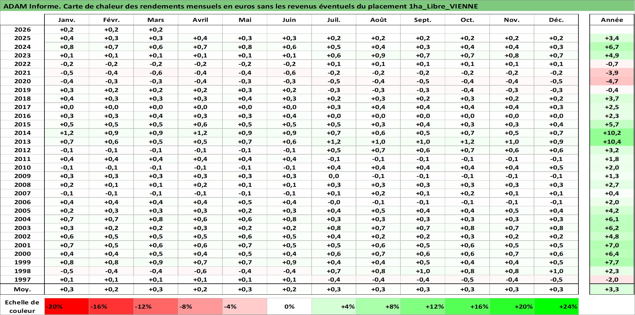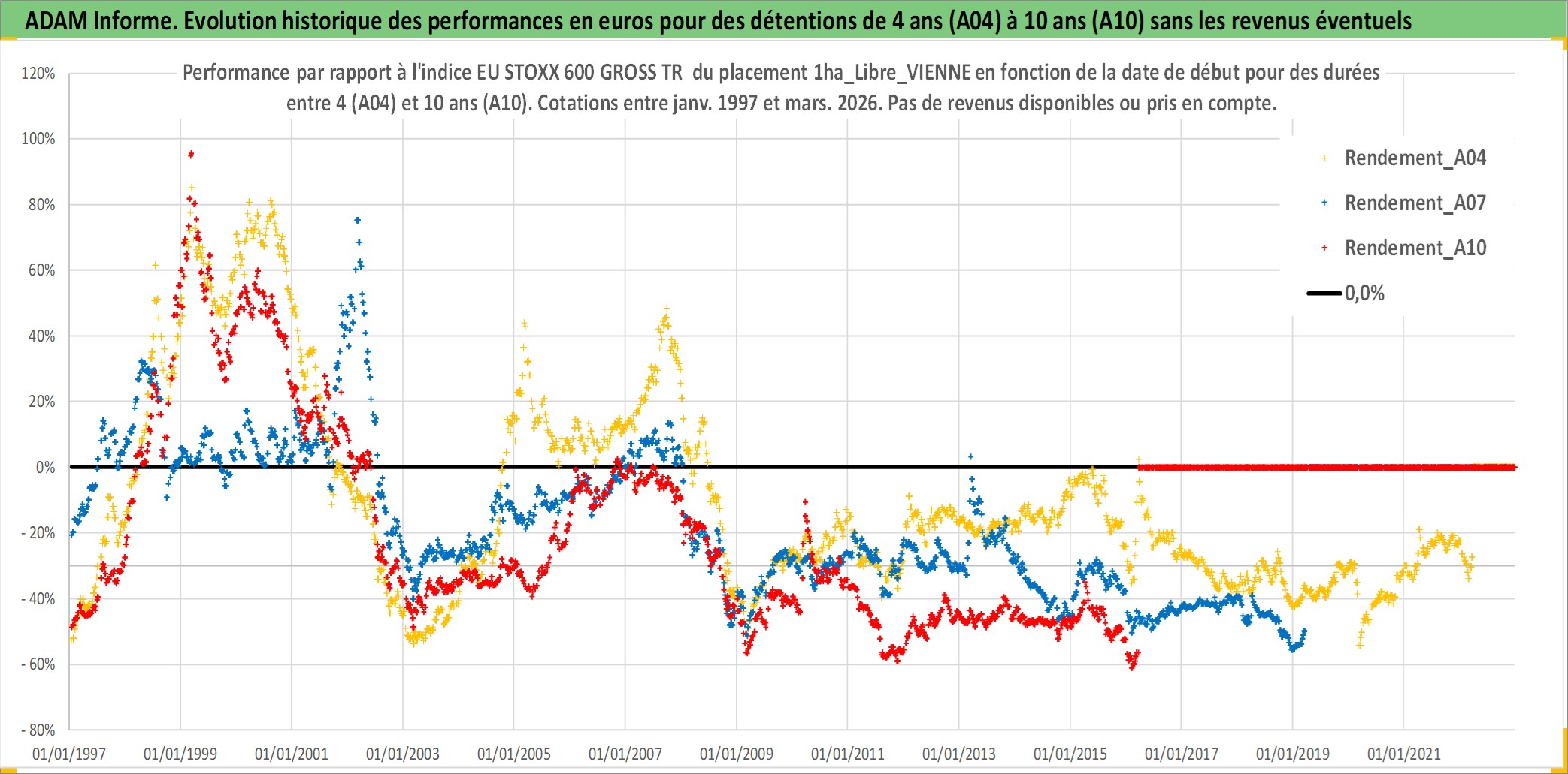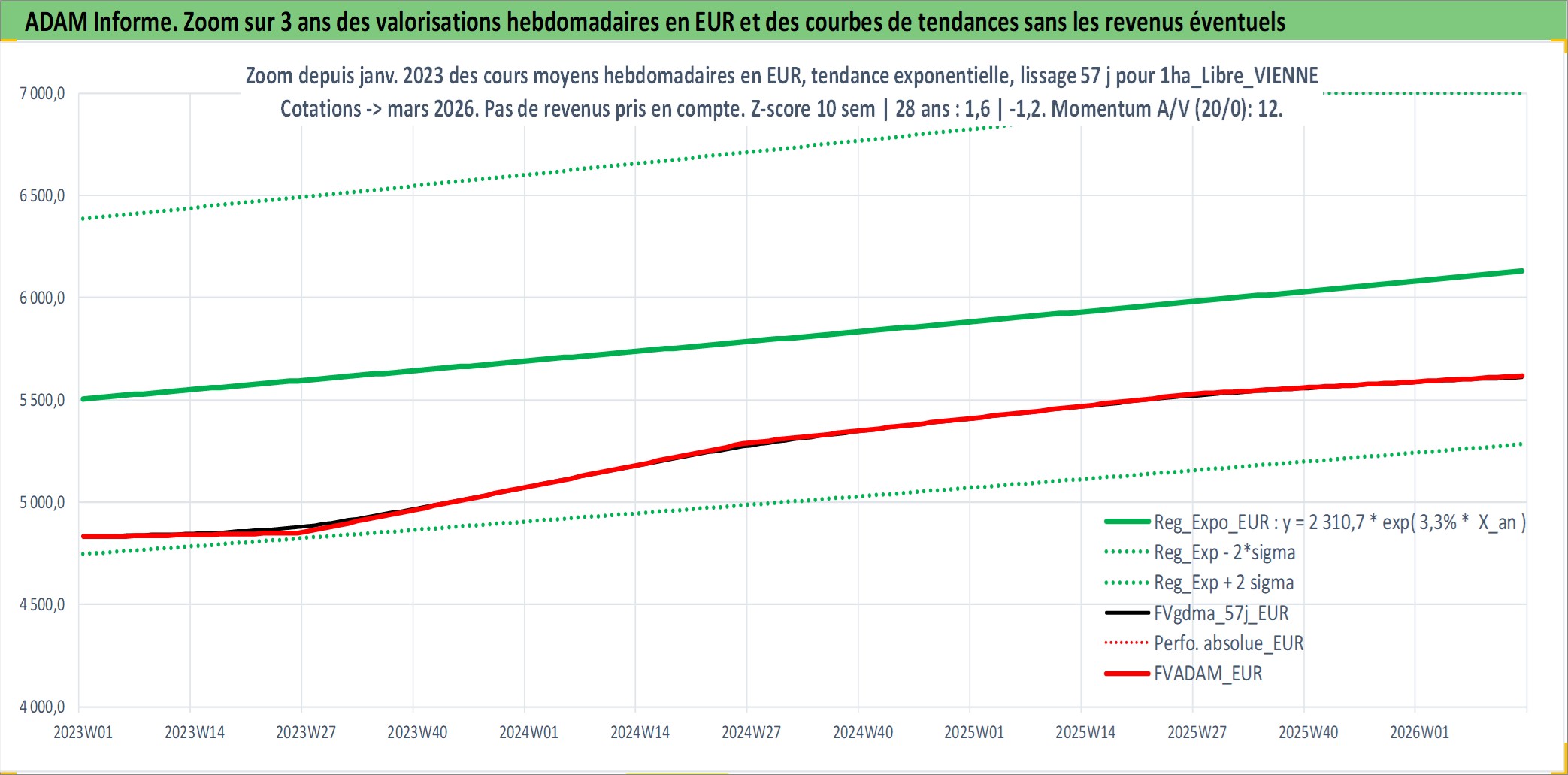 Site dédié aux investisseursPage dédiée sur site financeAnalyse des valorisations hebdomadaires de l'actif 1ha_Libre_VIENNE. Cet actif est cote en EUR. Les valorisations couvrent les semaines 1997W01 a 2026W13. Les fermages de ce bien foncier sont pris egaux a 2,5% annuels de la valeur venale du bien.