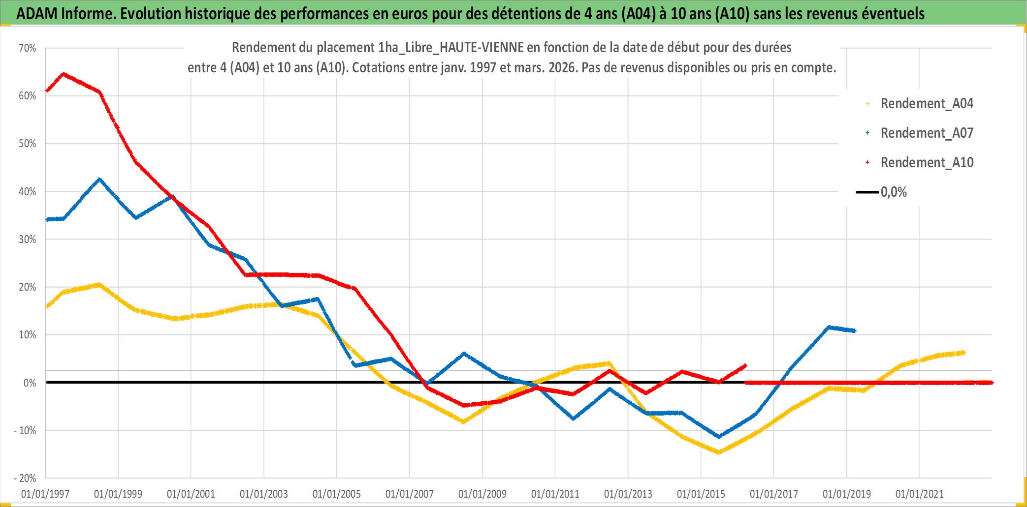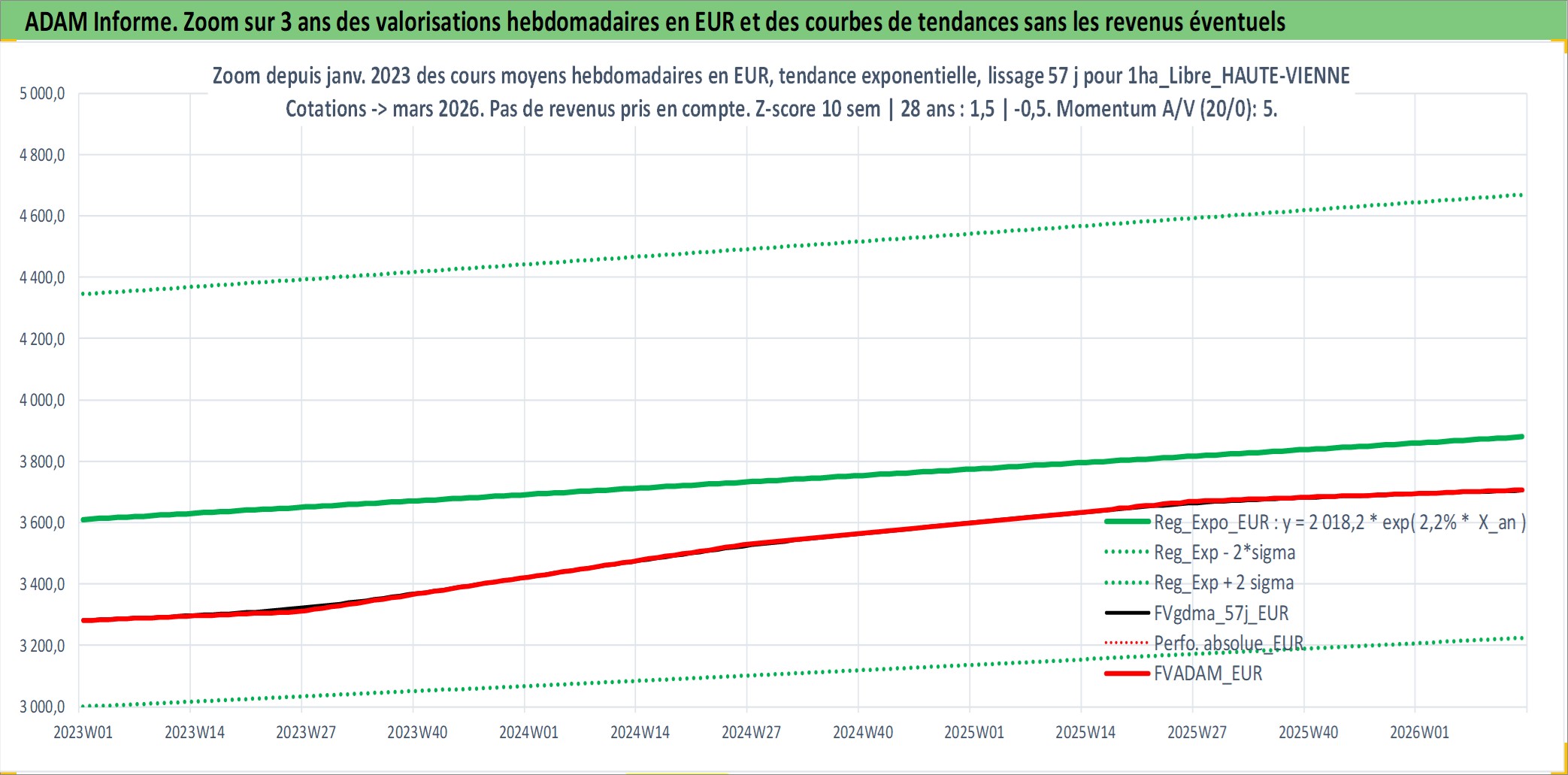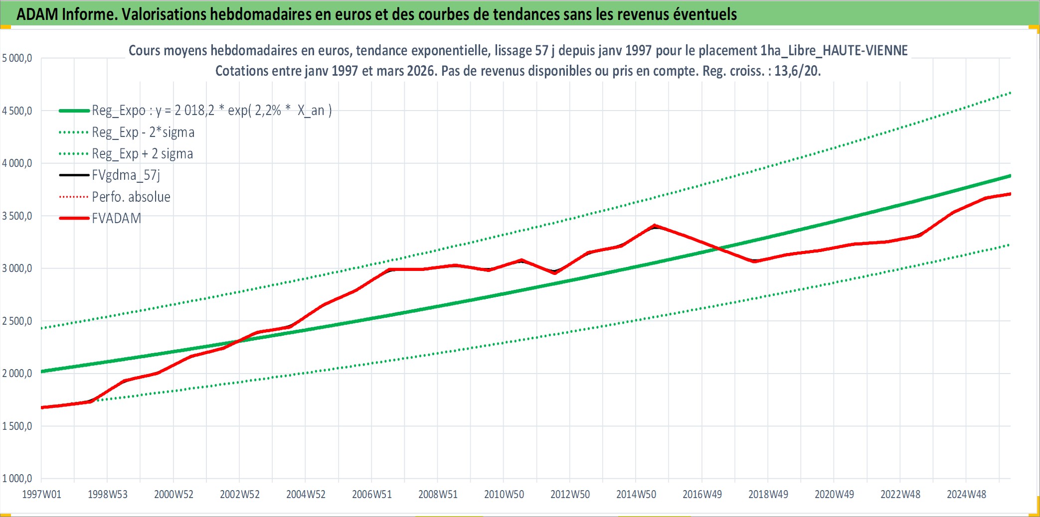 Site dédié aux investisseursPage dédiée sur site financeAnalyse des valorisations hebdomadaires de l'actif 1ha_Libre_HAUTE-VIENNE. Cet actif est cote en EUR. Les valorisations couvrent les semaines 1997W01 a 2026W13. Les fermages de ce bien foncier sont pris egaux a 2,5% annuels de la valeur venale du bien.