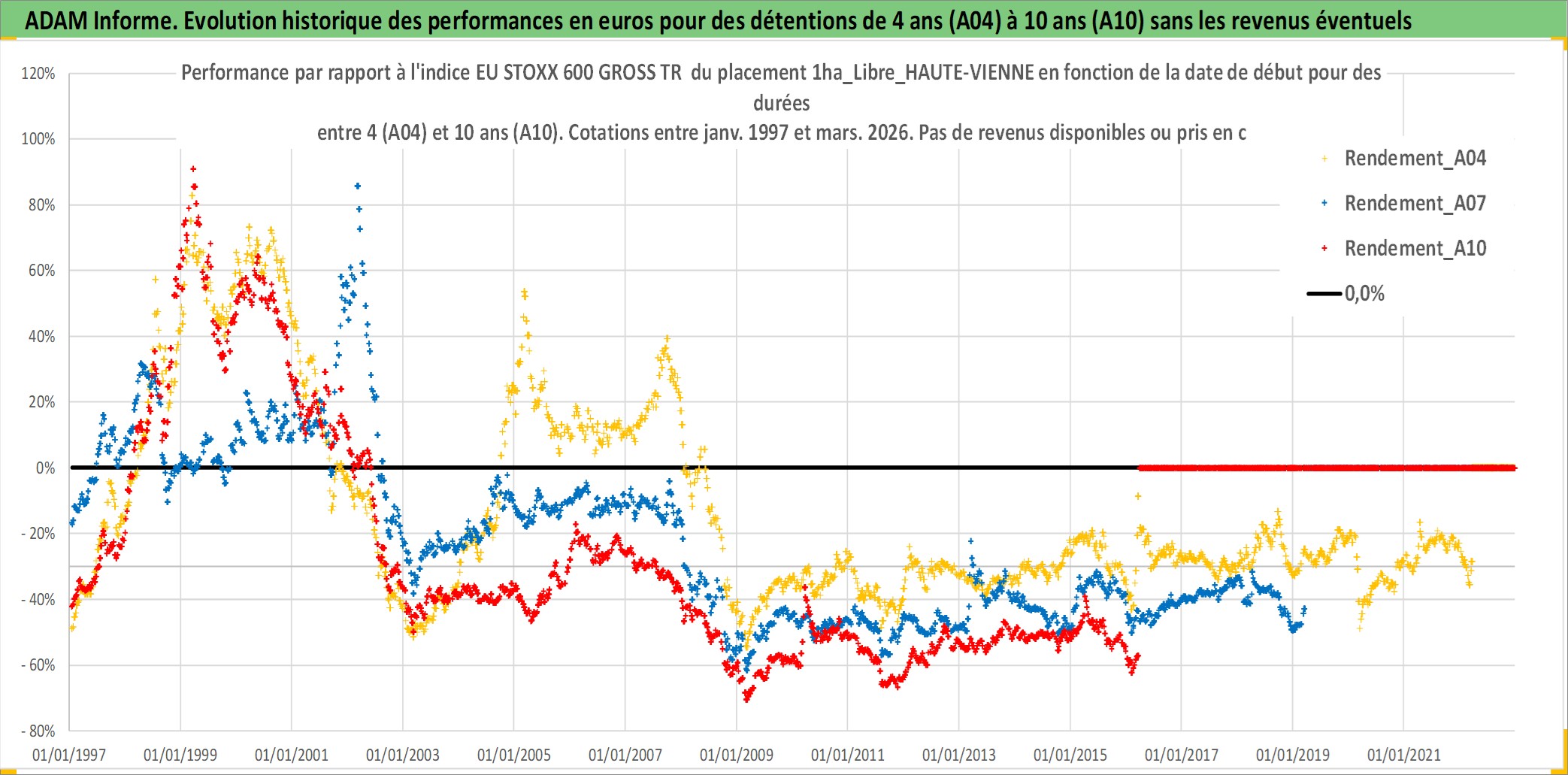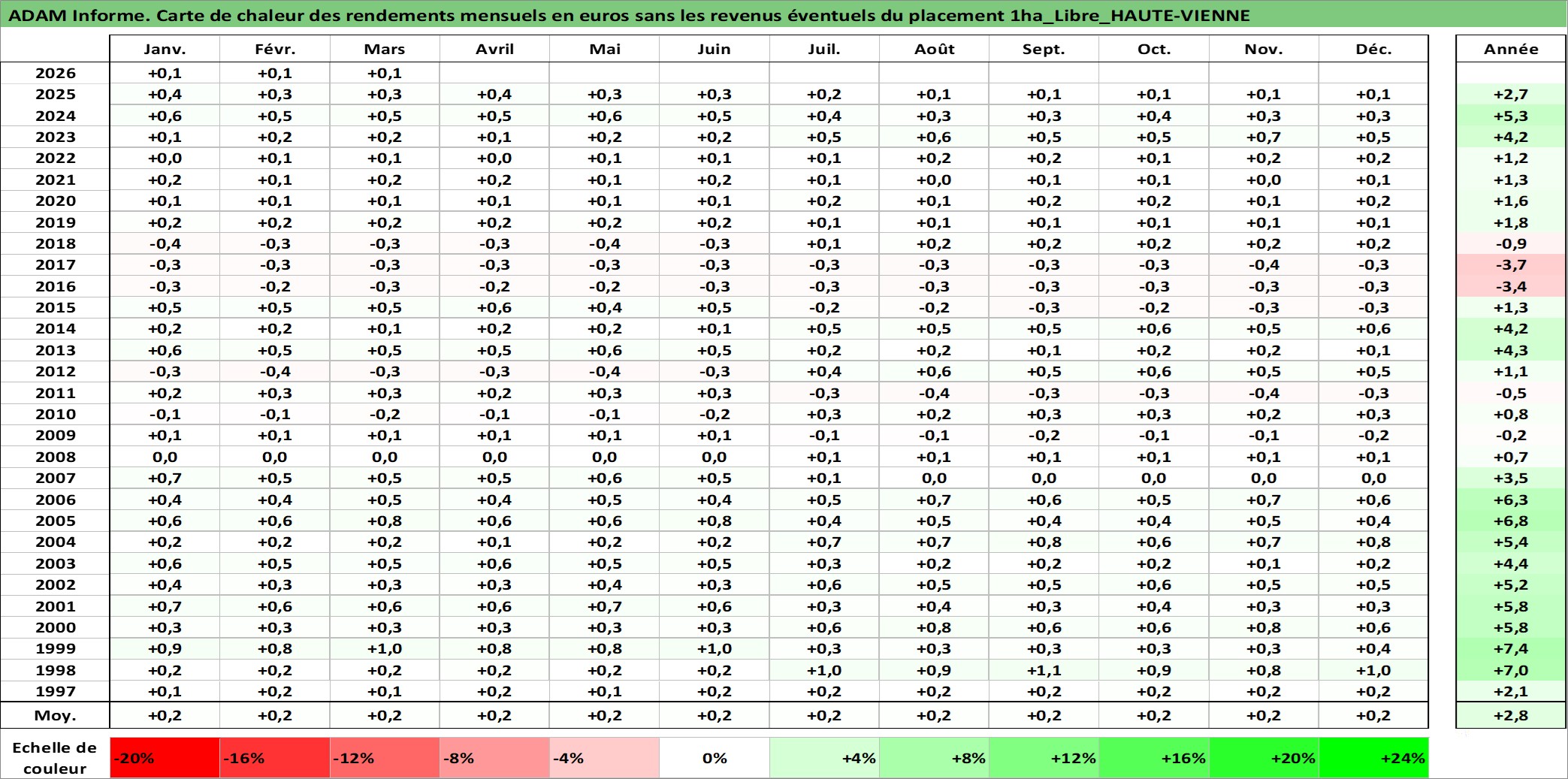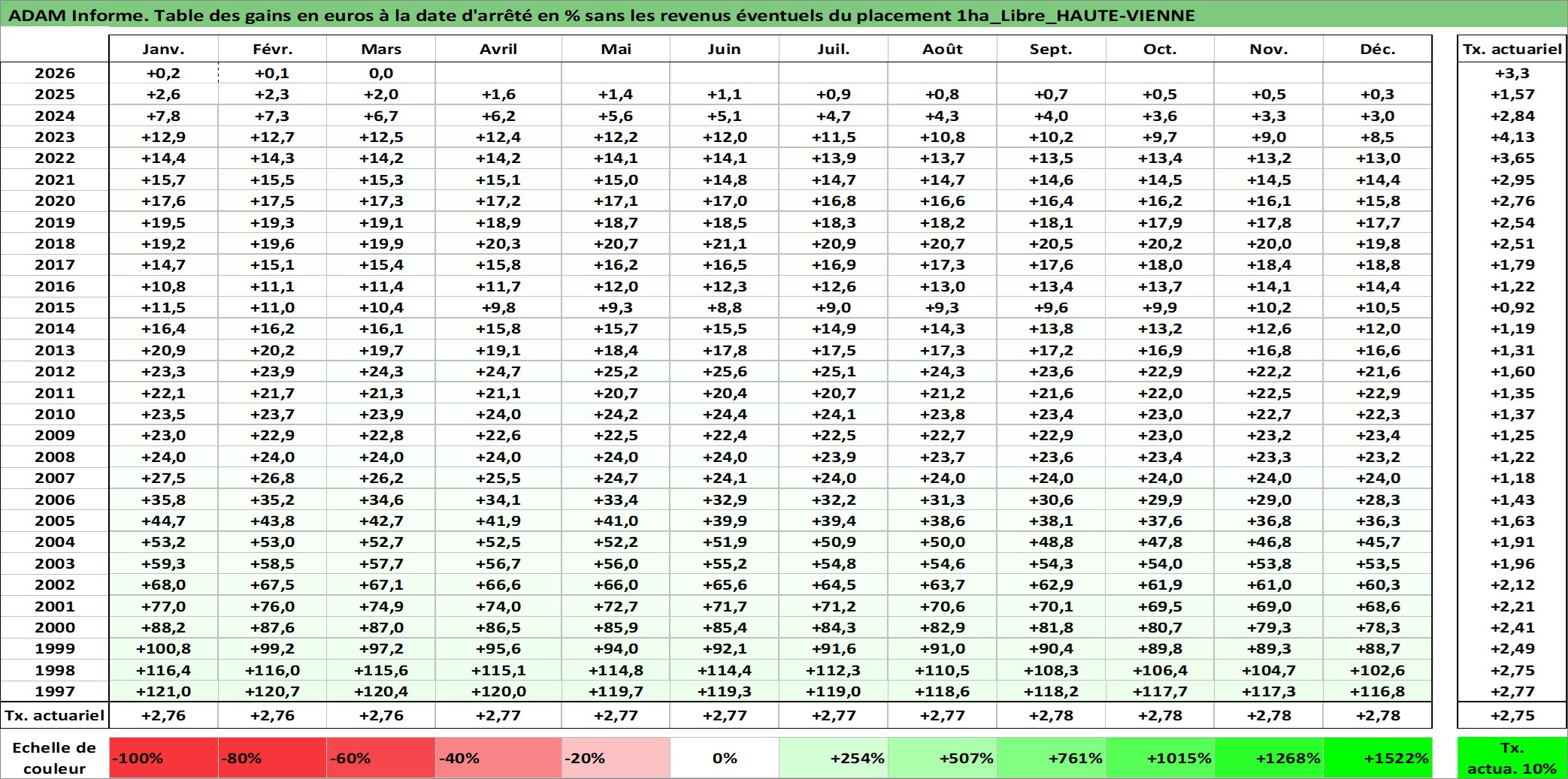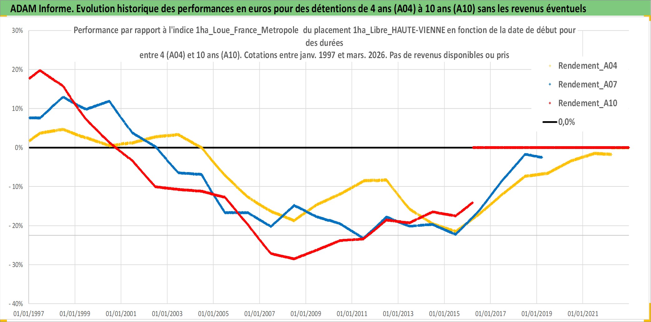 Site dédié aux investisseursPage dédiée sur site financeAnalyse des valorisations hebdomadaires de l'actif 1ha_Libre_HAUTE-VIENNE. Cet actif est cote en EUR. Les valorisations couvrent les semaines 1997W01 a 2026W13. Les fermages de ce bien foncier sont pris egaux a 2,5% annuels de la valeur venale du bien.